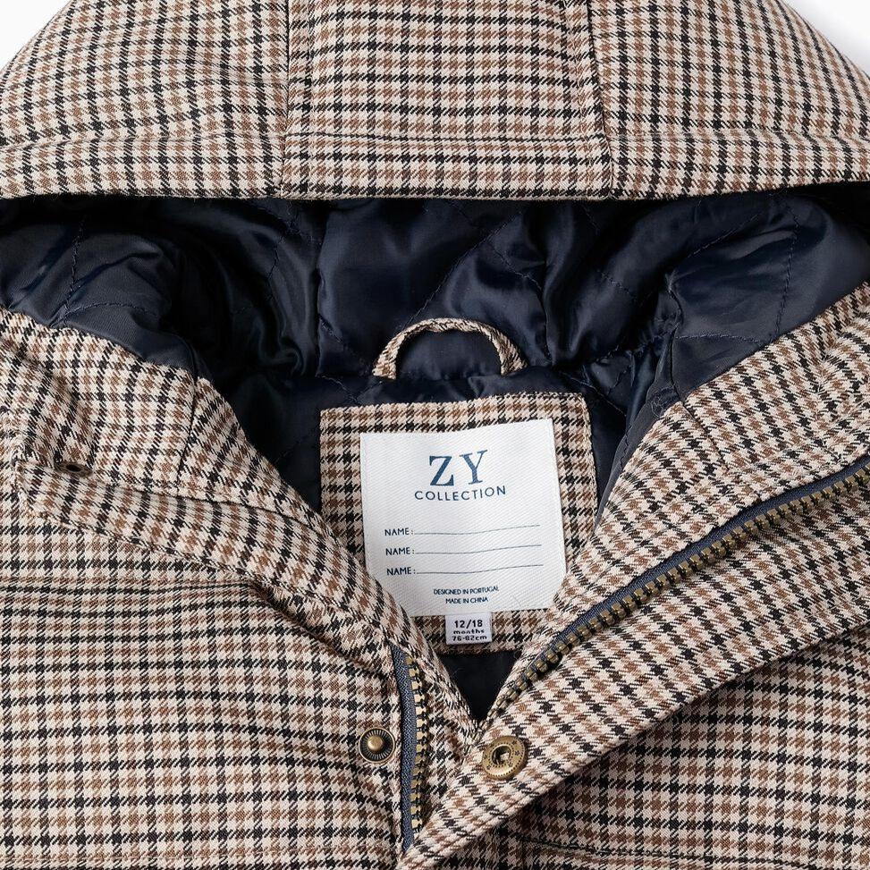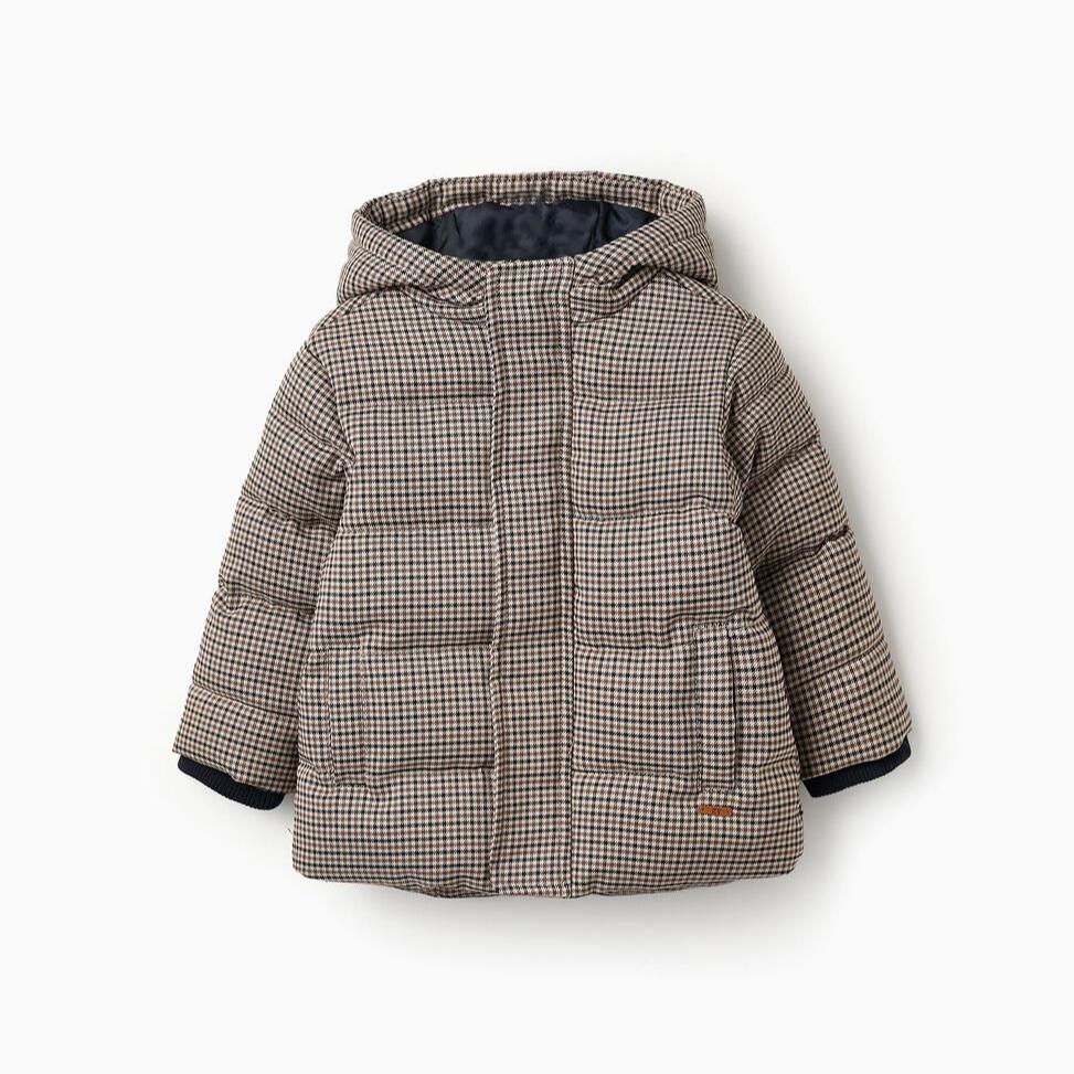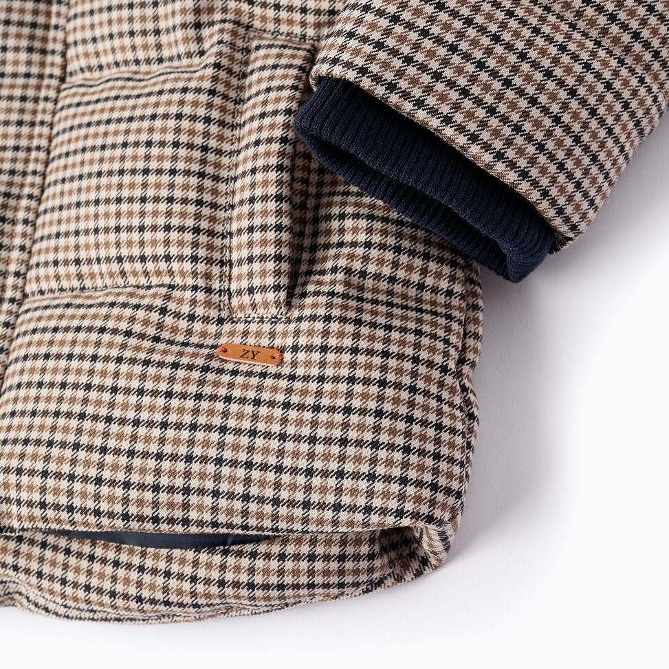 Abrigo acolchado con capucha para bebé niño. Con estampado de pata de gallo en negro y camel. Puños acanalados para un ajuste perfecto. Bolsillos laterales. Se abrocha fácilmente con cremallera y automáticos.