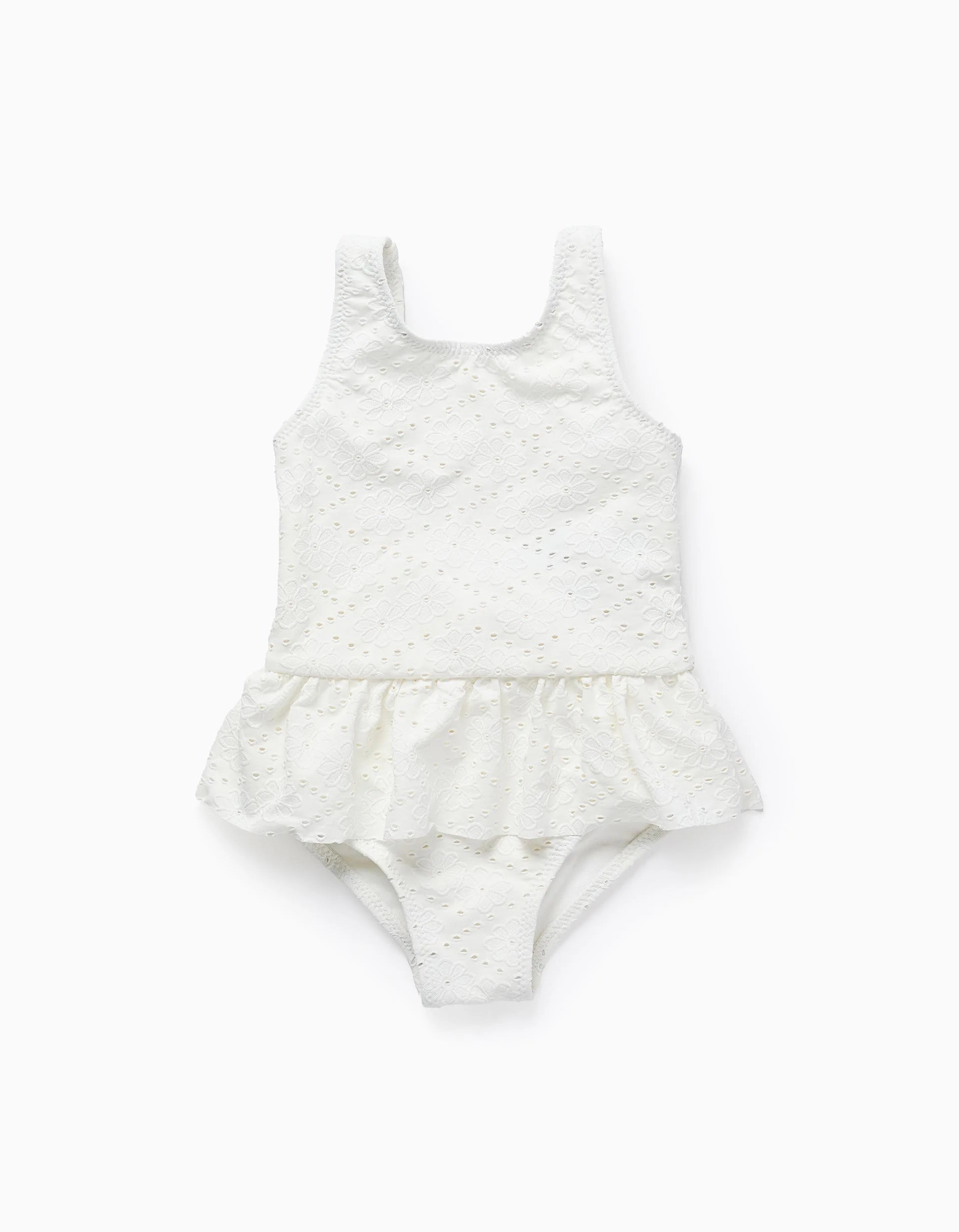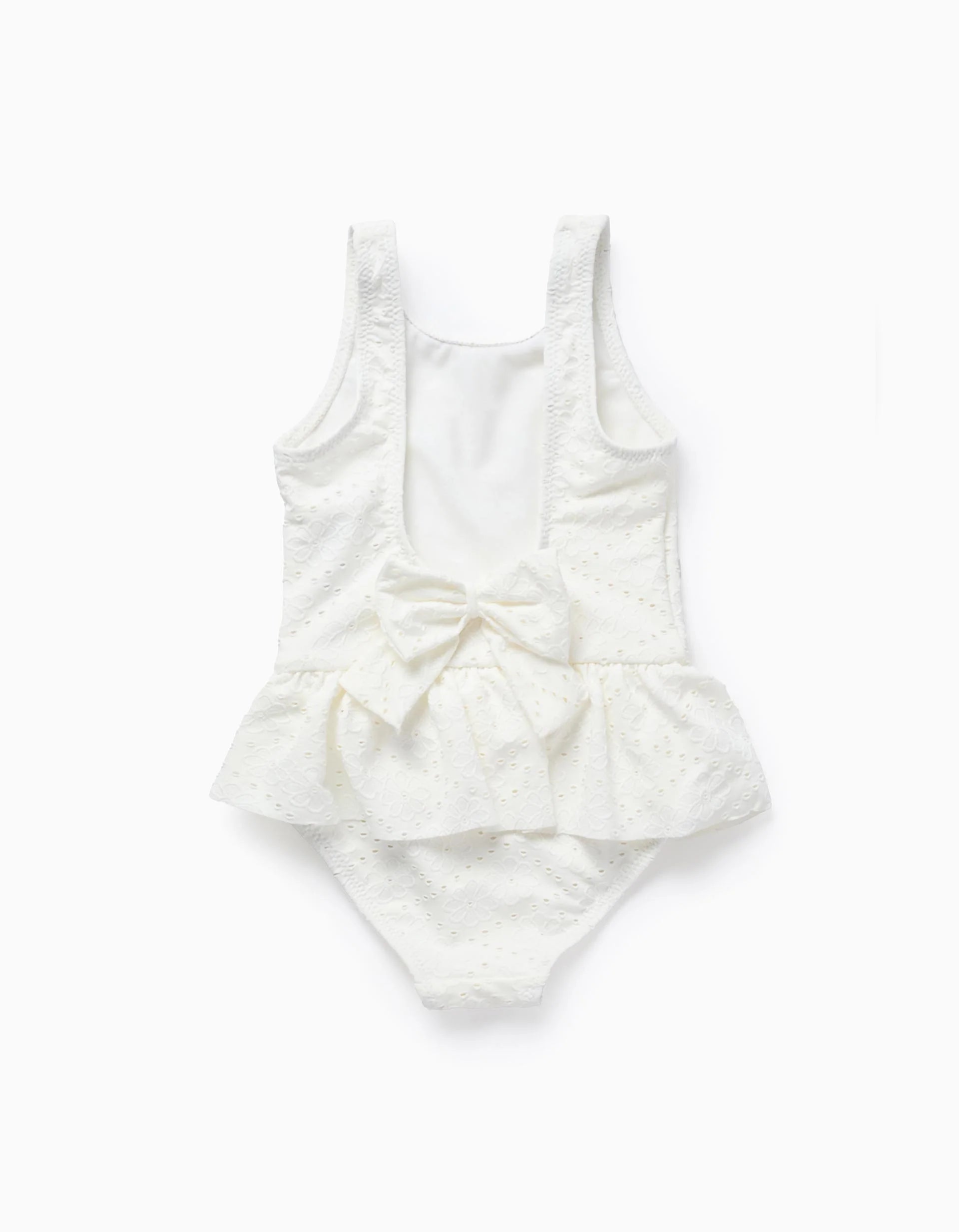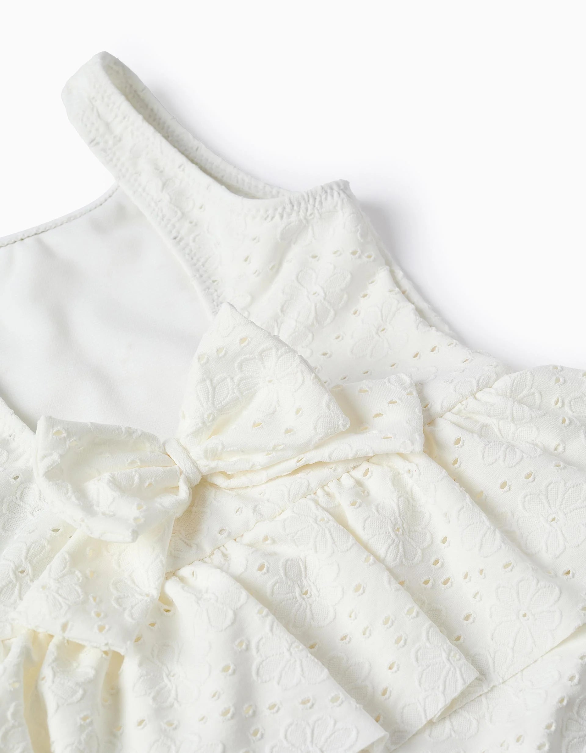 Bañador blanco para bebé niña, con bordados de flores. Volantes alrededor de la cintura y lazo decorativo en la espalda. Espalda semiabierta. Con forro para máximo confort. ¡Un Bañador elegante y adorable!