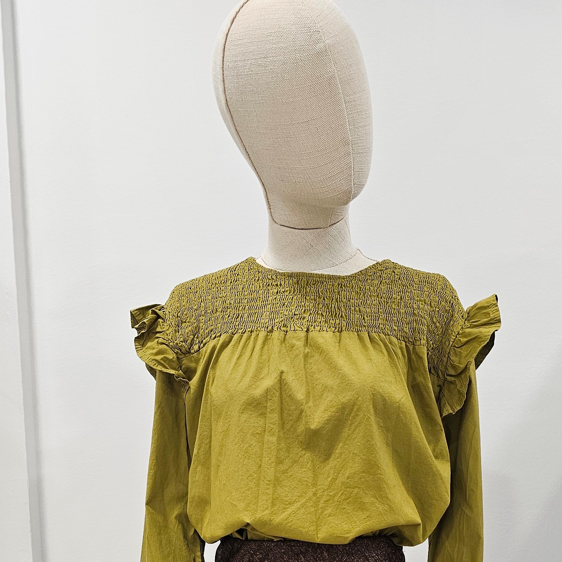 Blusa en talla única con tejido de ligera elasticidad. Presenta goma en los puños y un bajo con forma acampanada que aporta un diseño cómodo y estilizado.