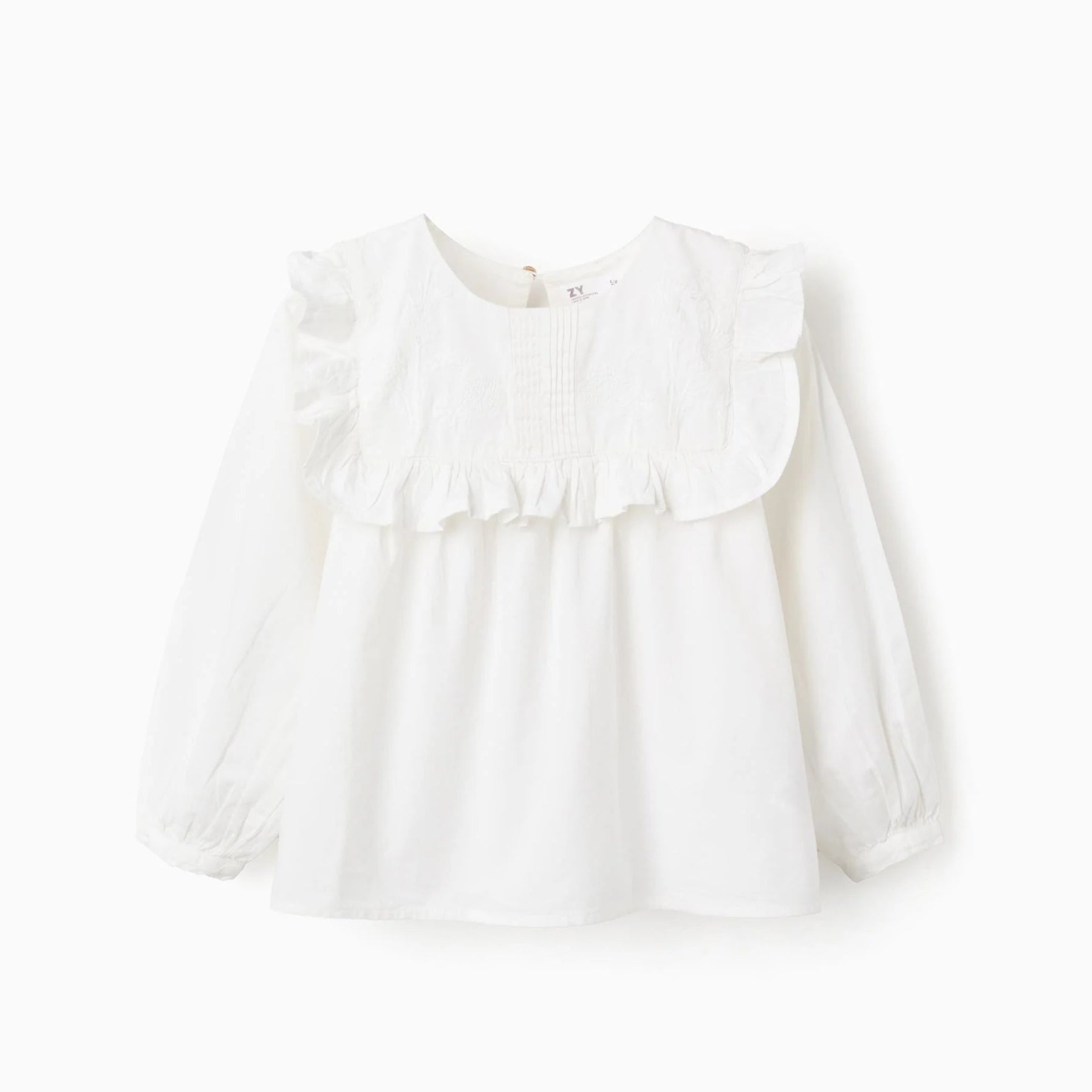 Blusa de manga larga blanca para niña, 100% algodón. Con volantes y bordados de flores en el pecho. Botón en la espalda y en los puños. Corte evasé, ancho y fluido
