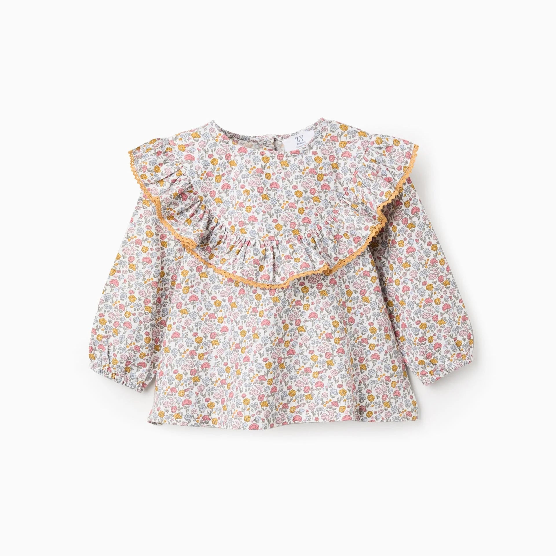 Blusa floral en tonos de amarillo, rosa y azul para bebé niña. Volantes alrededor del pecho con contorno de crochet. Corte evasé. Botones en la espalda para vestir fácilmente. Puños elásticos para un ajuste perfecto. ¡Un motivo floral multicolor con un toque vintage!
