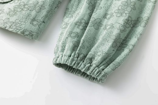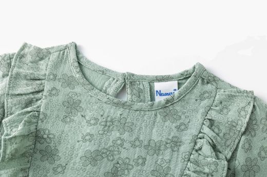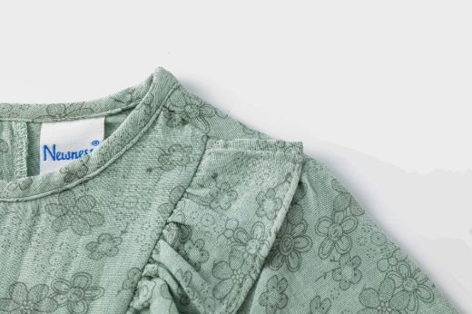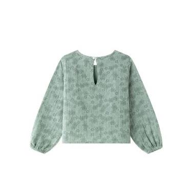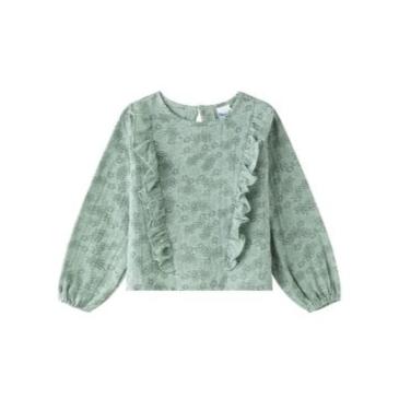 Blusa tejido estampado de flores de niña. Manga larga con goma elástica en el interior de los puños. Dos volantes verticales en el delantero. Abertura con botón de plástico en espalda.