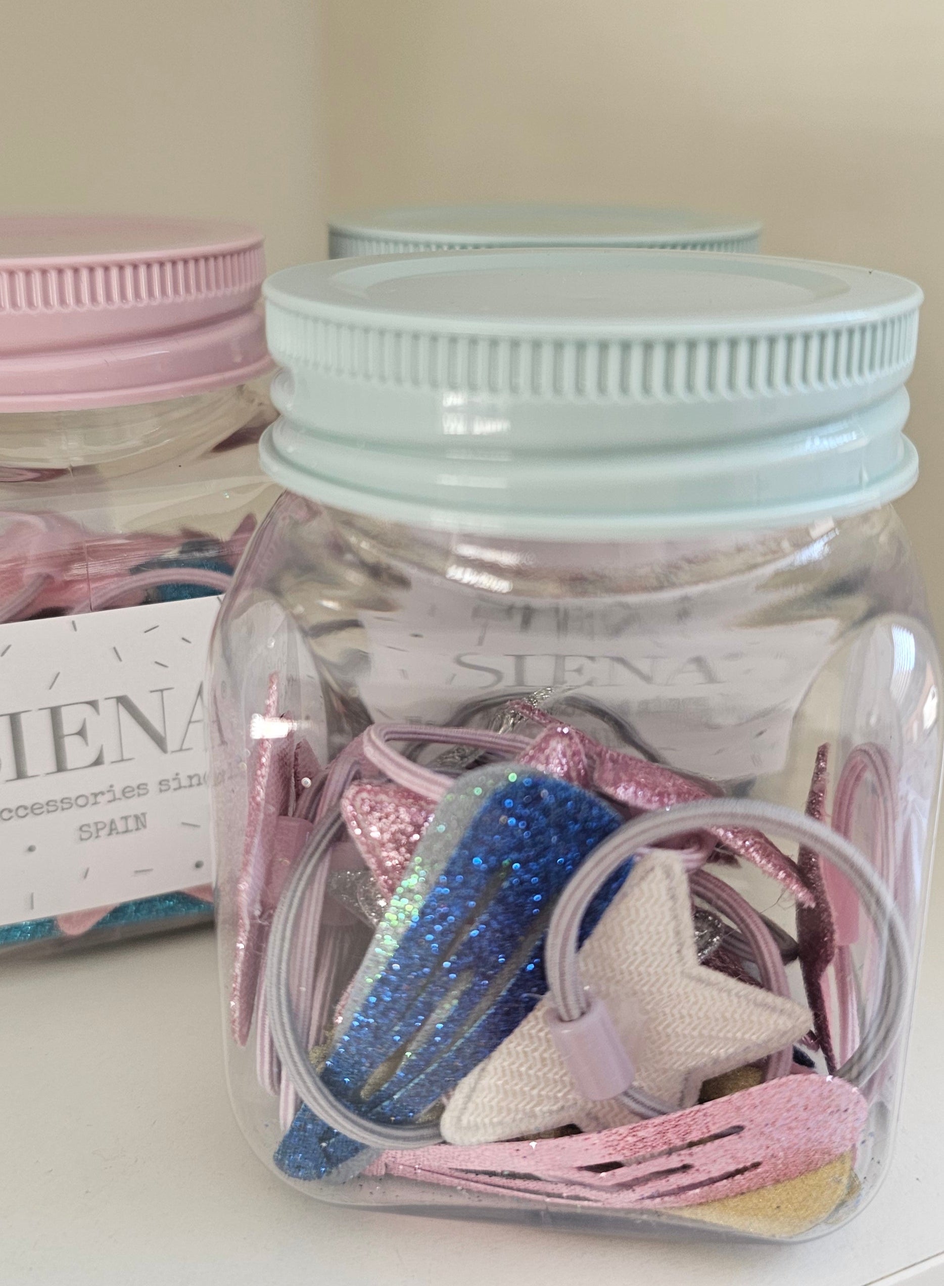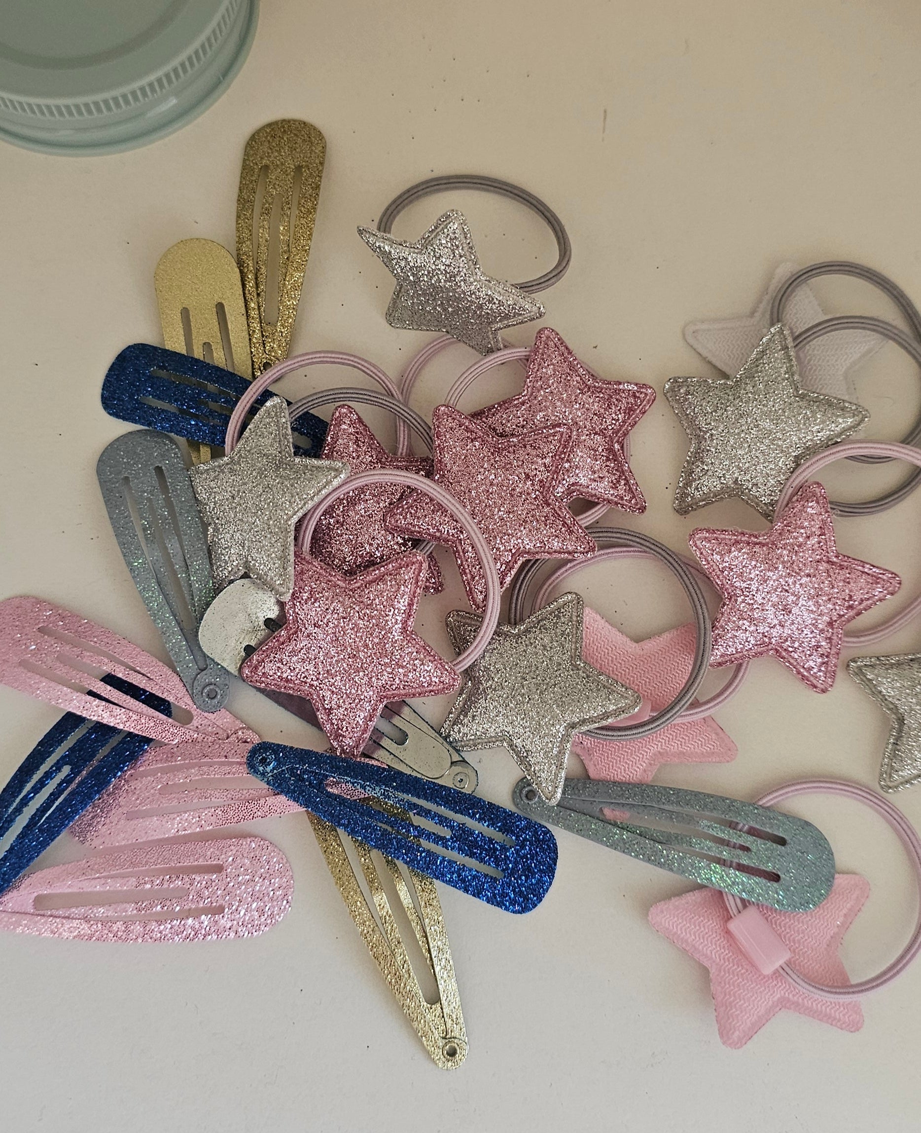 Este bote incluye 12 clips y gomas de estrellas con purpurina en diversos colores, ideales como regalo para niñas que disfrutan de los detalles brillantes y coquetos. Su diseño atractivo y colorido añade un toque divertido y elegante a cualquier look o conjunto de accesorios.
