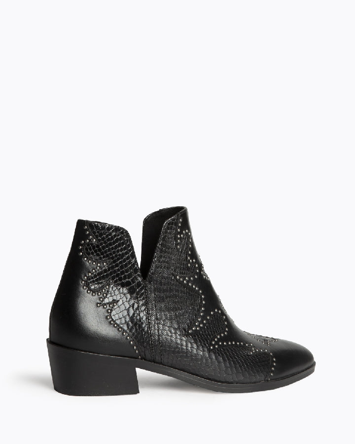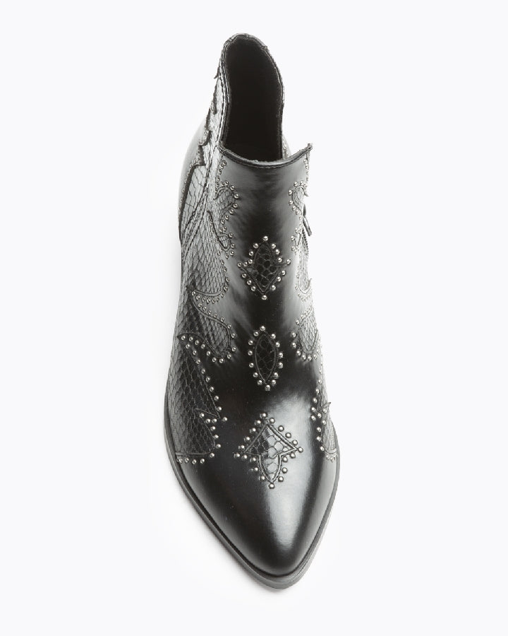 Botín tacón bajo, estilo cowboy. Cremallera en el lateral. Acabado en punta. Detalle de tachas en el corte.