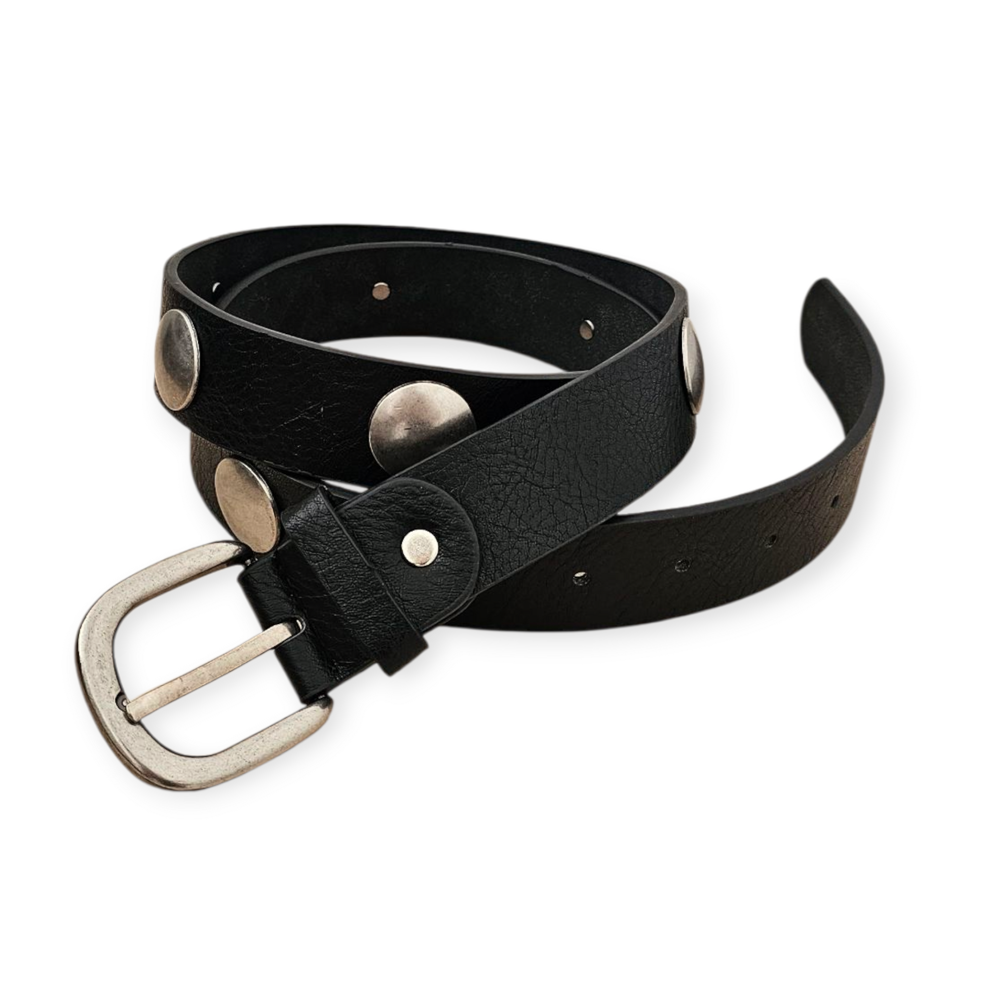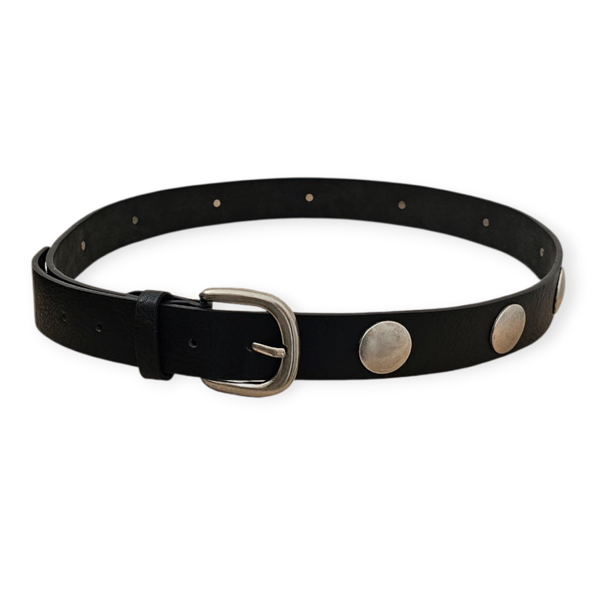 Cinturón de cuero adornado con aros metálicos plateados, disponible en colores marrón y negro.