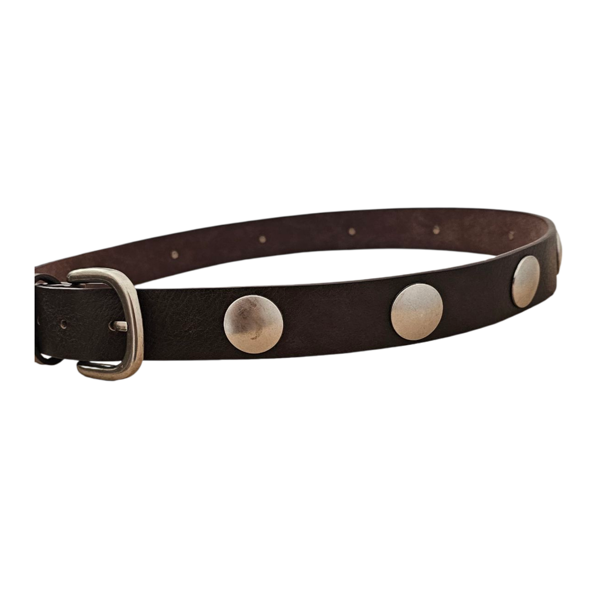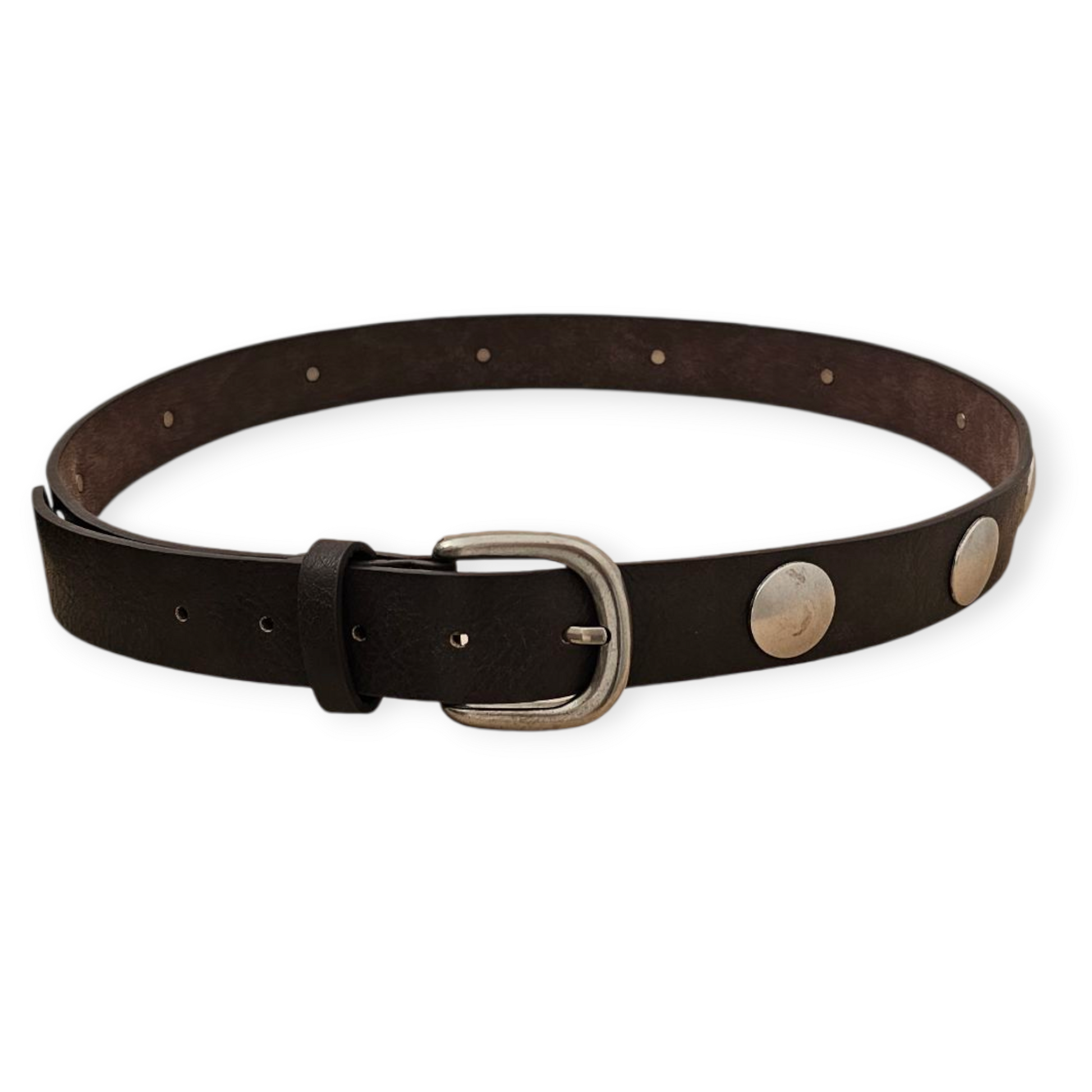 Cinturón de cuero adornado con aros metálicos plateados, disponible en colores marrón y negro.