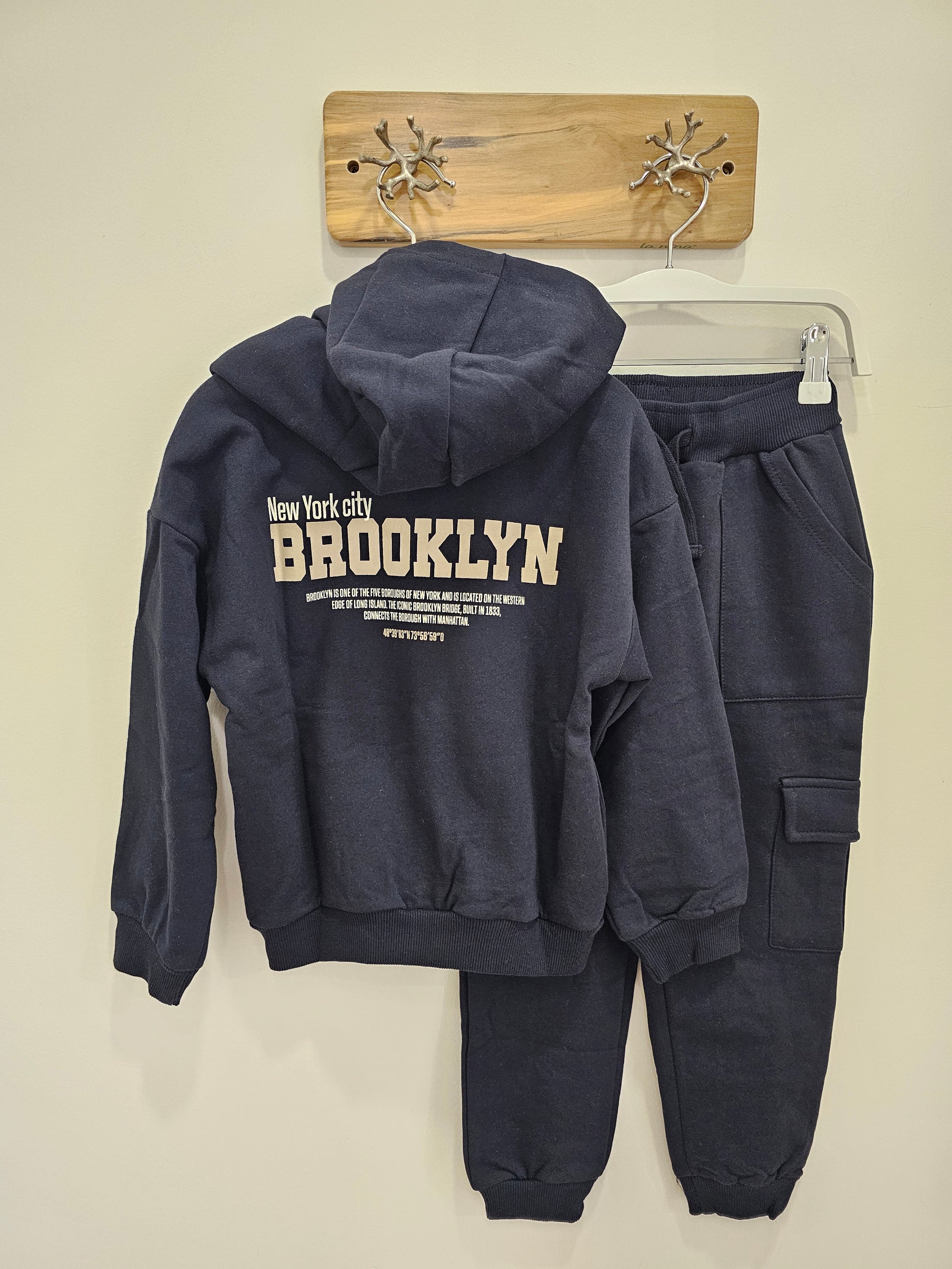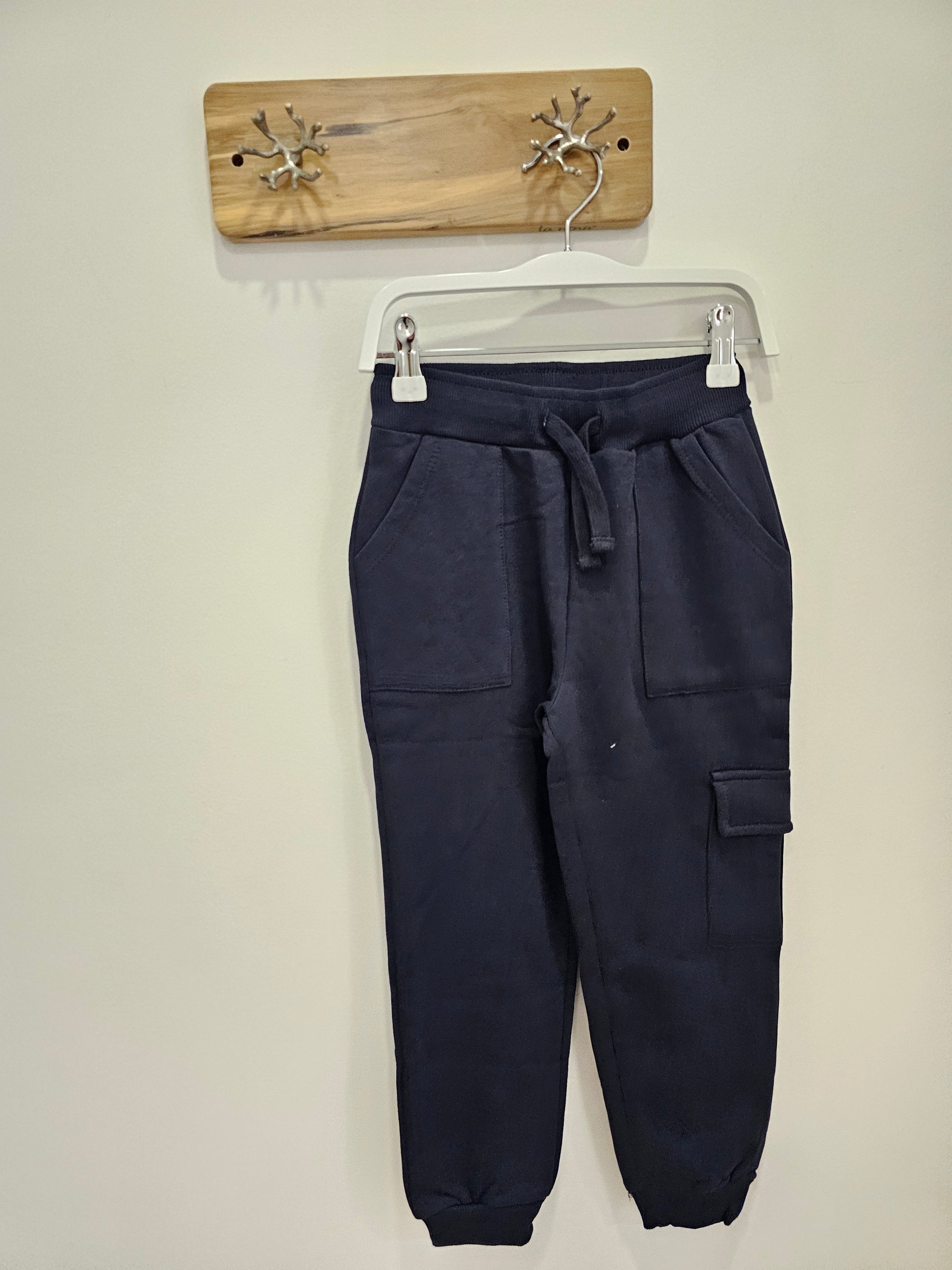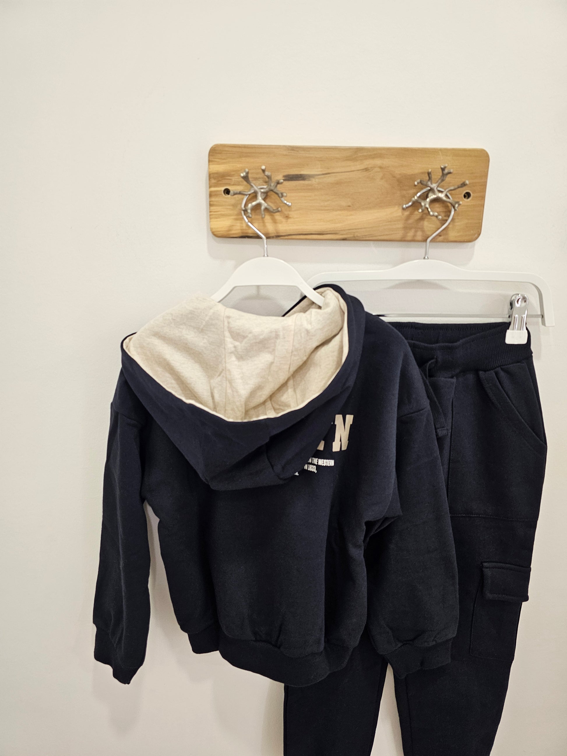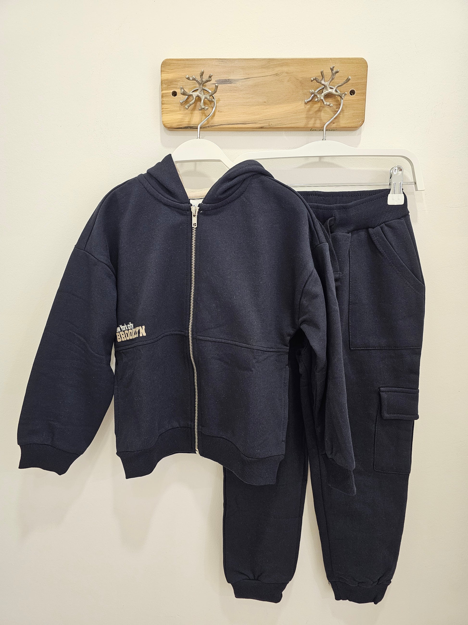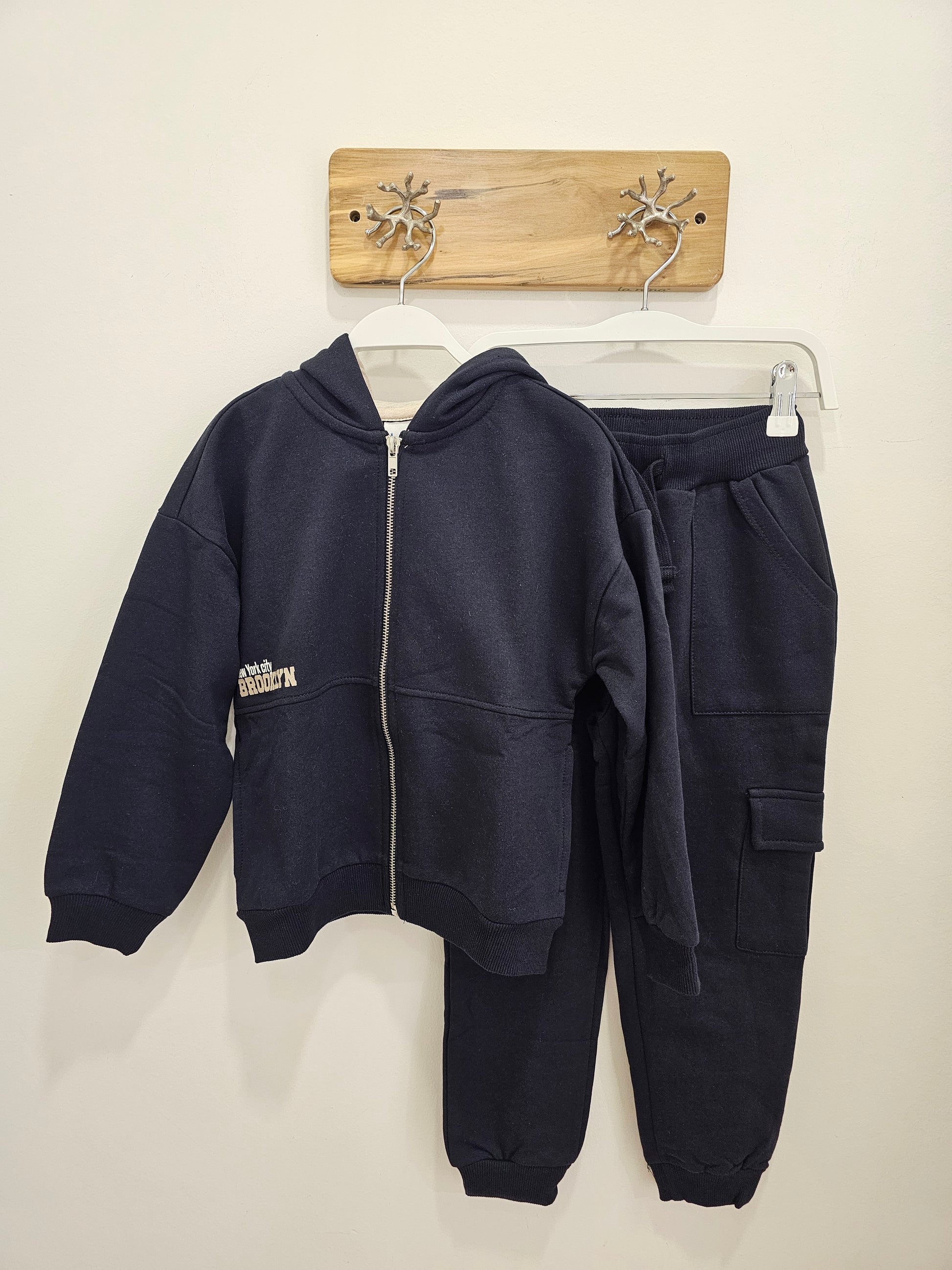 Este conjunto de chándal marino incluye una sudadera con capucha y cierre de cremallera, diseñada para ofrecer comodidad y facilidad de uso. El pantalón cargo cuenta con cintura elástica y cordón ajustable para un ajuste personalizado, además de puños en los tobillos que garantizan una sujeción óptima. Ideal para actividades deportivas o uso casual, combina funcionalidad y estilo en una prenda versátil y práctica.