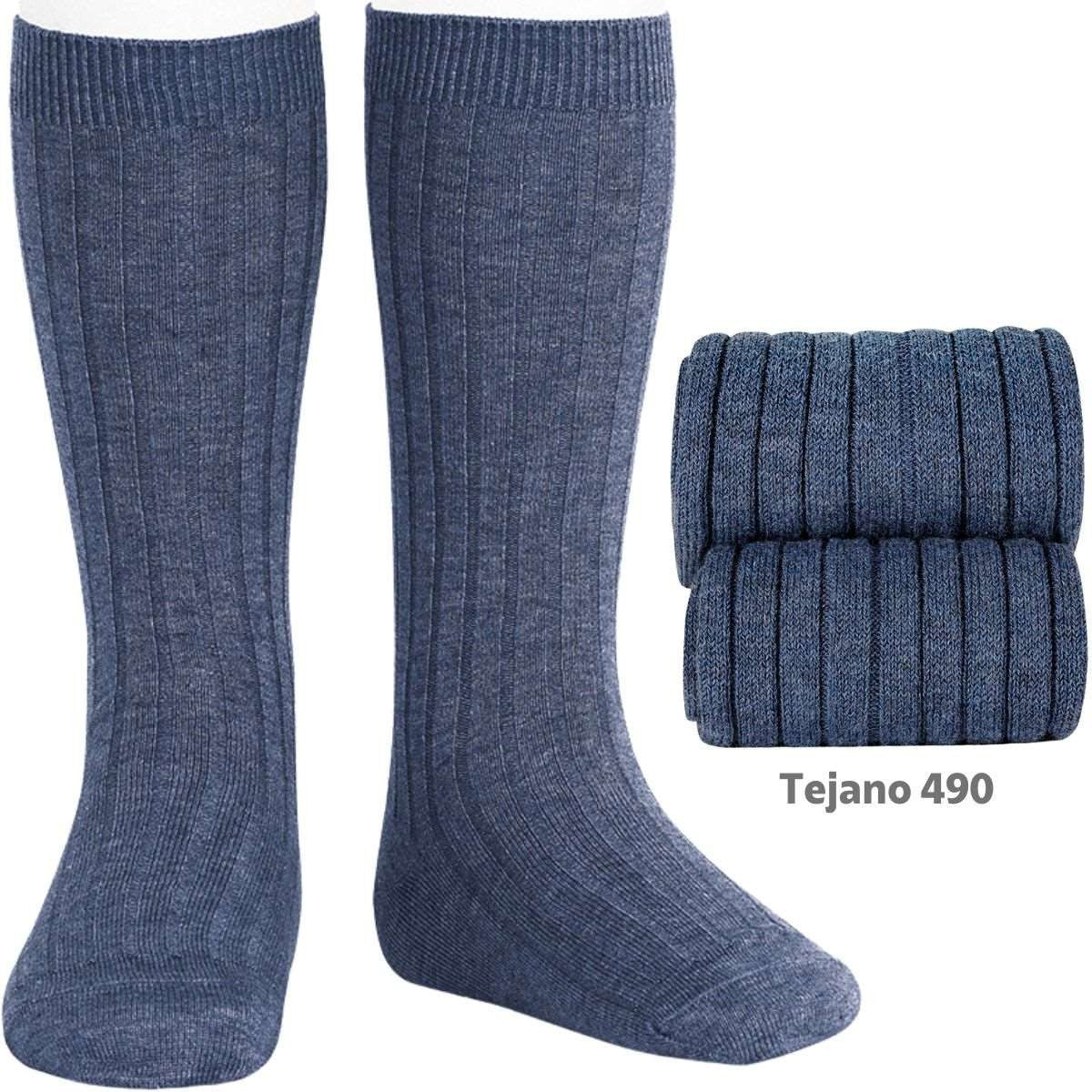 Calcetin alto de punto de canalé en color tejano.