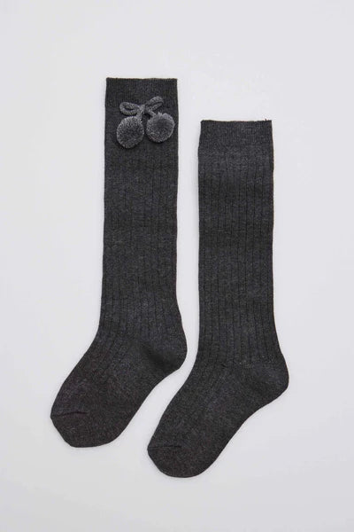 Calcetín infantil largo. Tejido con textura y decorado con bolas en el lateral. Un accesorio especial para los outfits más cuidados de los peques de la casa. Disponibles en variedad de colores.