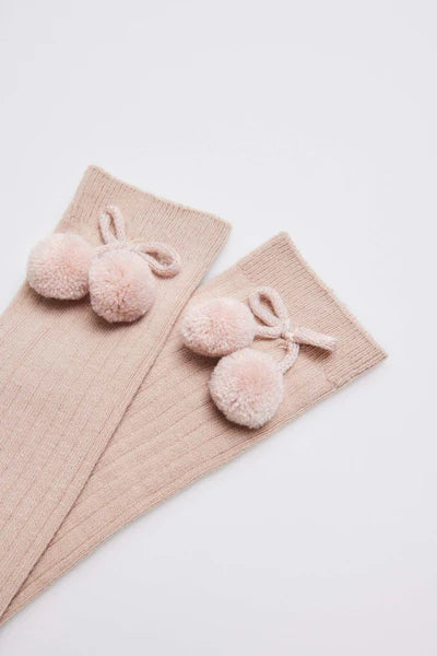 Calcetín infantil largo. Tejido con textura y decorado con bolas en el lateral. Un accesorio especial para los outfits más cuidados de los peques de la casa. Disponibles en variedad de colores.