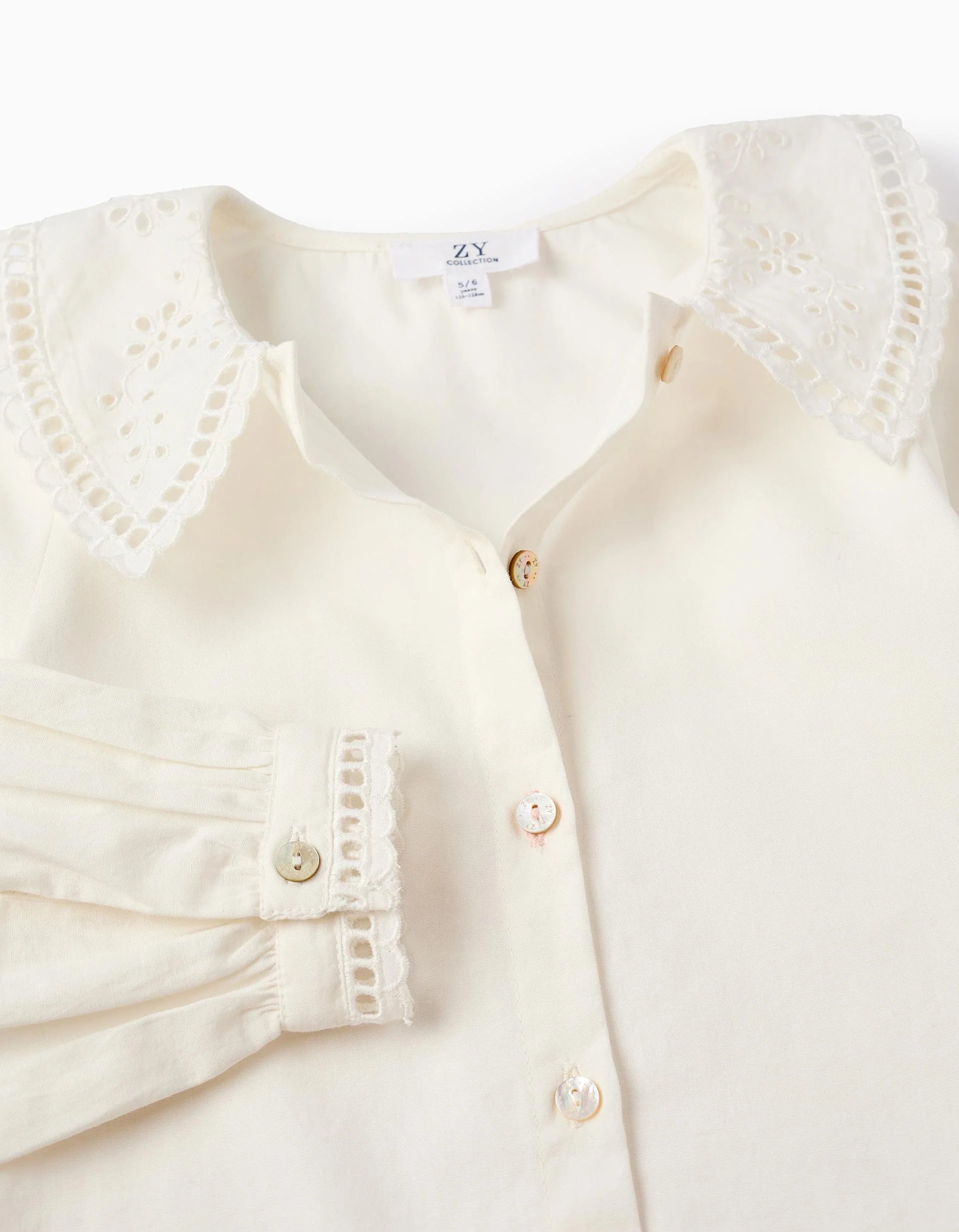 Camisa blanca para niña, con cuello de bordado inglés. Puños de encaje y con botón. Corte evasé. Un clásico del armario, para looks delicados. Big Me: un botón con hilo y ojal en contraste para que el niño identifique fácilmente dónde empezar a abotonar, promoviendo su autonomía.