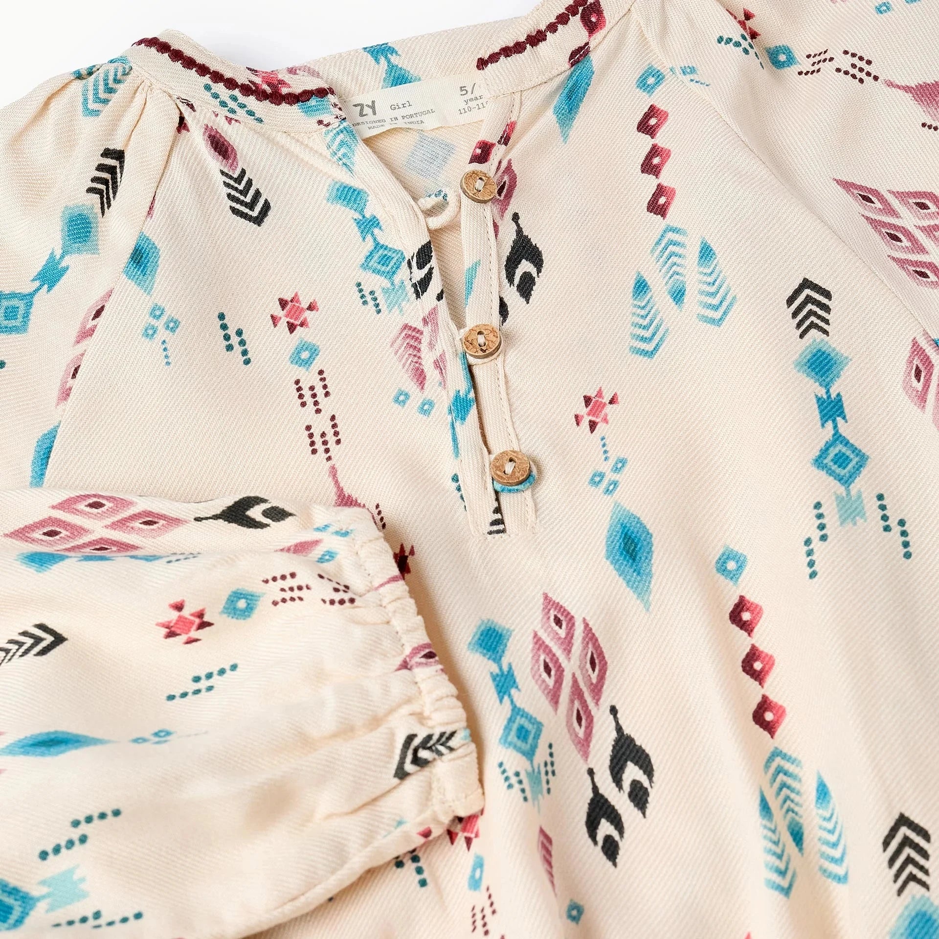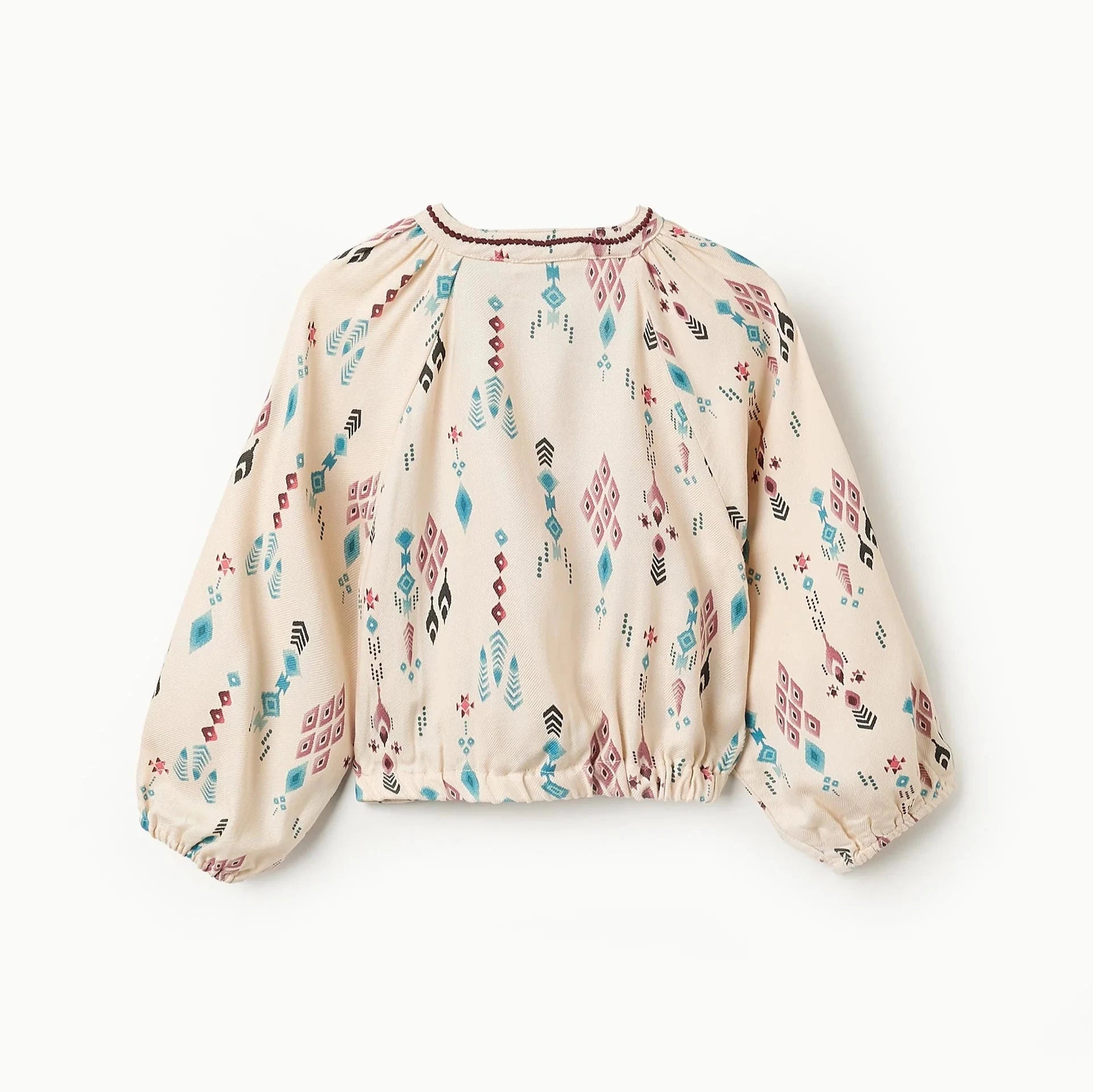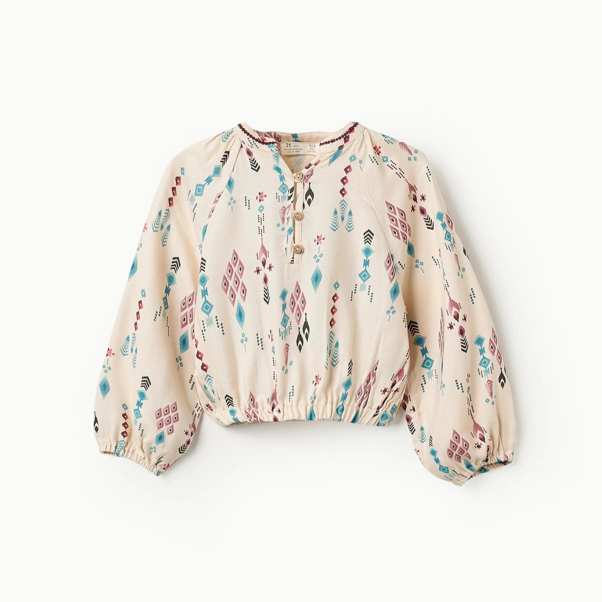 Camisa de manga larga beige estampada para niña. 100% algodón. Cuello mao y botones de lágrima. Mangas raglán abullonadas con puños elásticos. Base con acabado elástico y fruncido alrededor. ¡Una camisa original y de tendencia, para looks únicos!