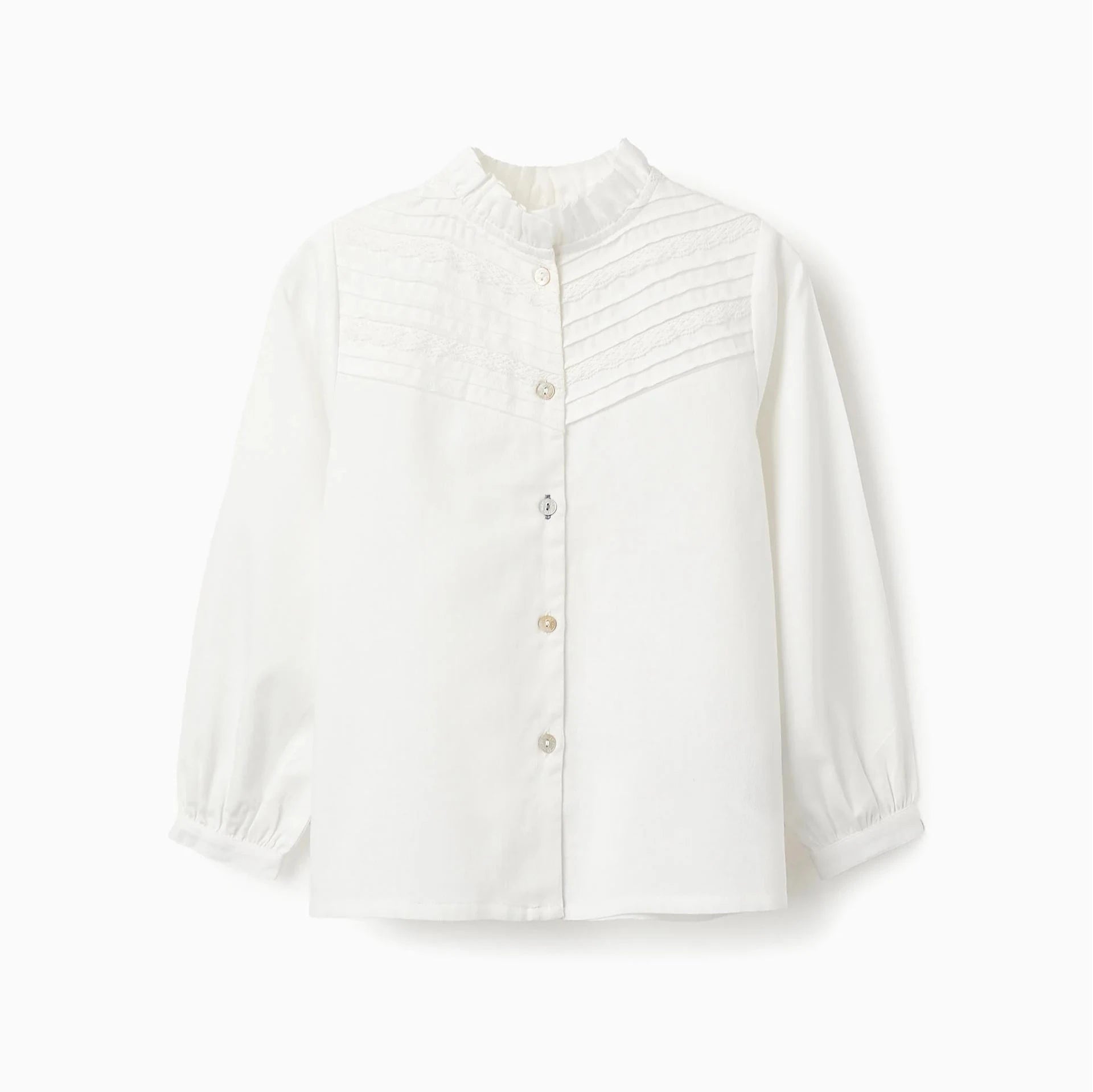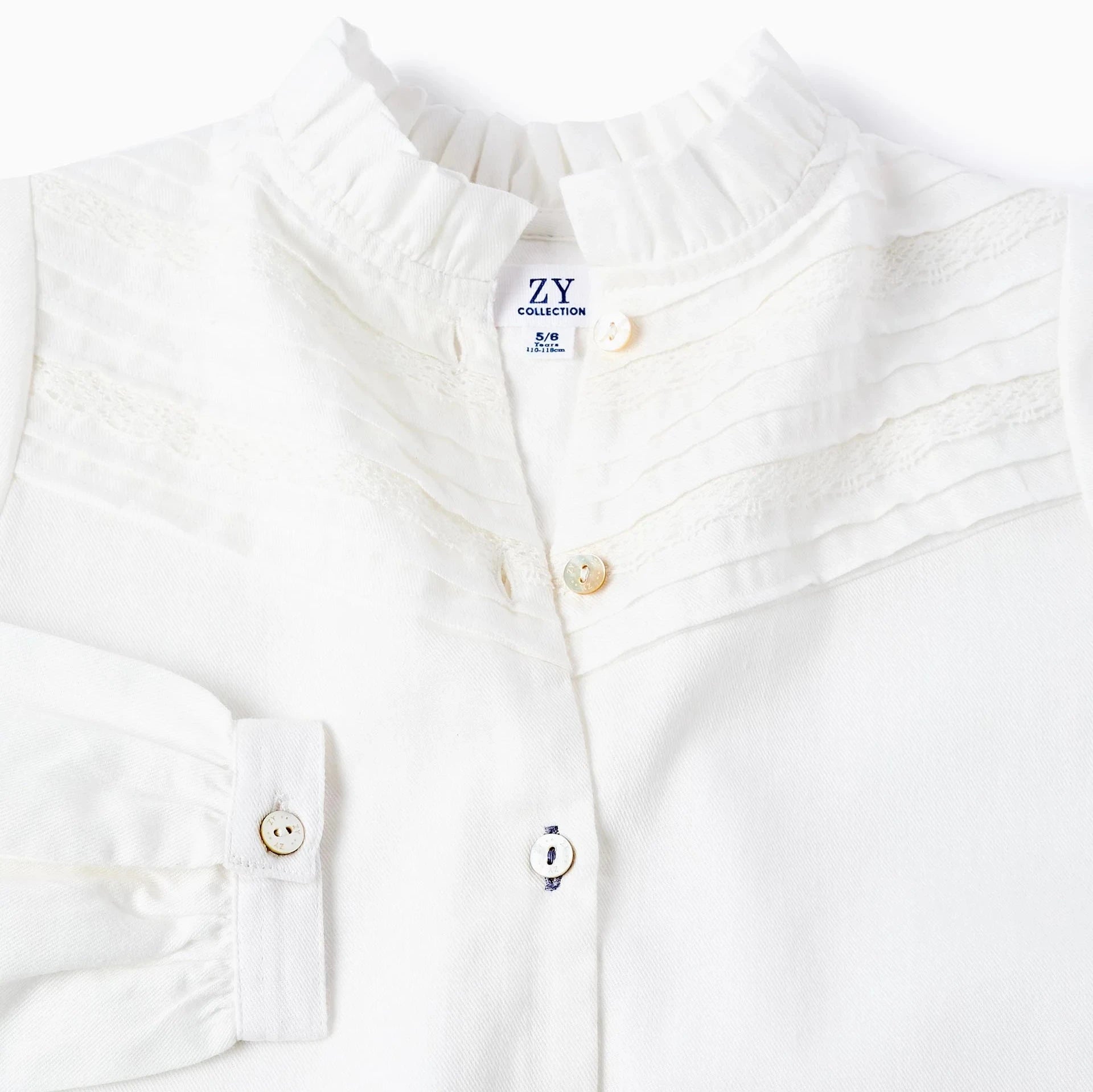 Camisa blanca de manga larga para niña, 100% algodón. Detalle de pliegues y encaje en el pecho. Cuello alto. Una camisa elegante con detalles originales.