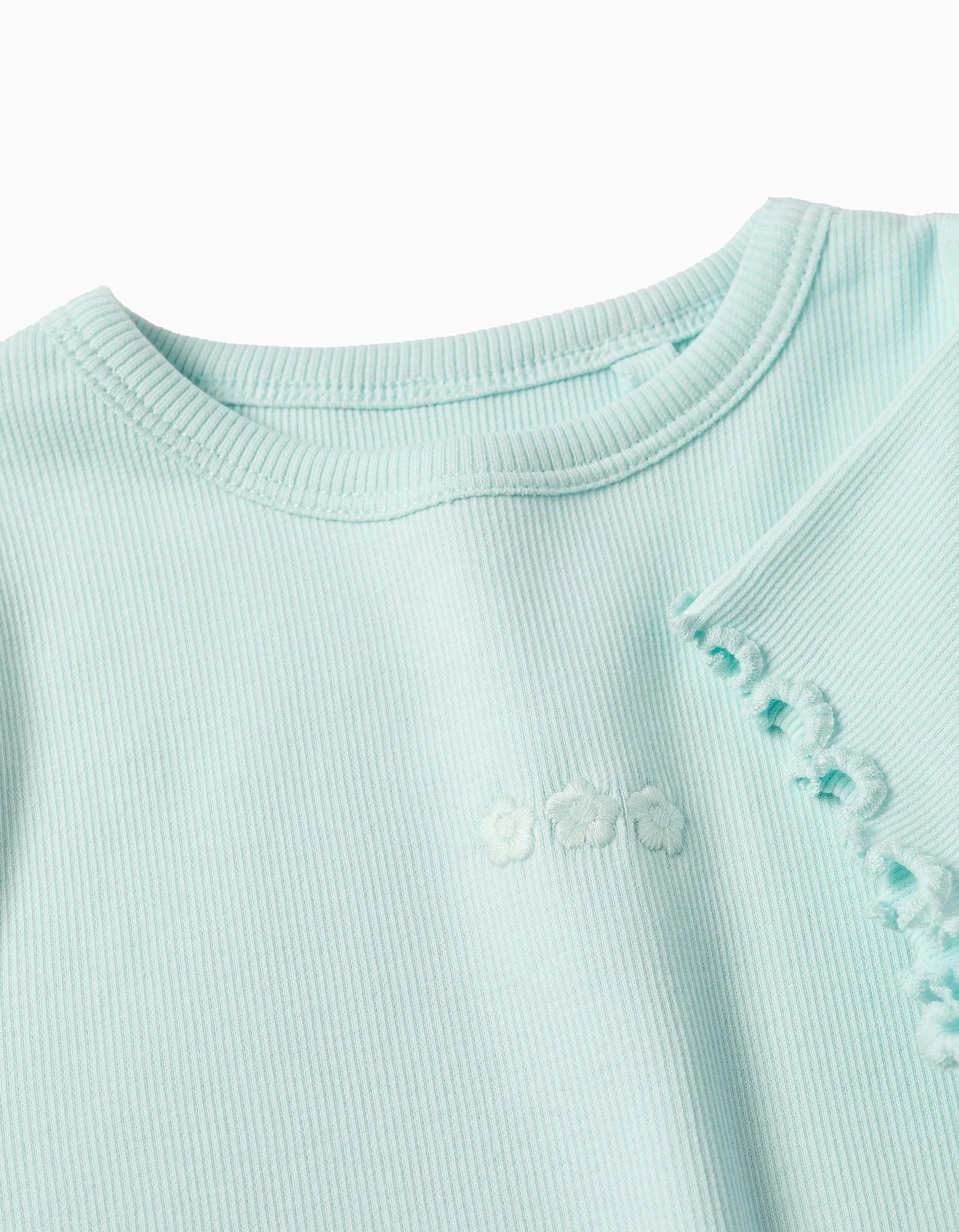 Camiseta azul claro acanalada para niña, con bordados de flores. Fabricada en algodón con un toque de elasticidad para mayor comodidad y libertad de movimiento. Extremos ondulados para un toque femenino. Etiqueta interior estampada para no irritar la piel.