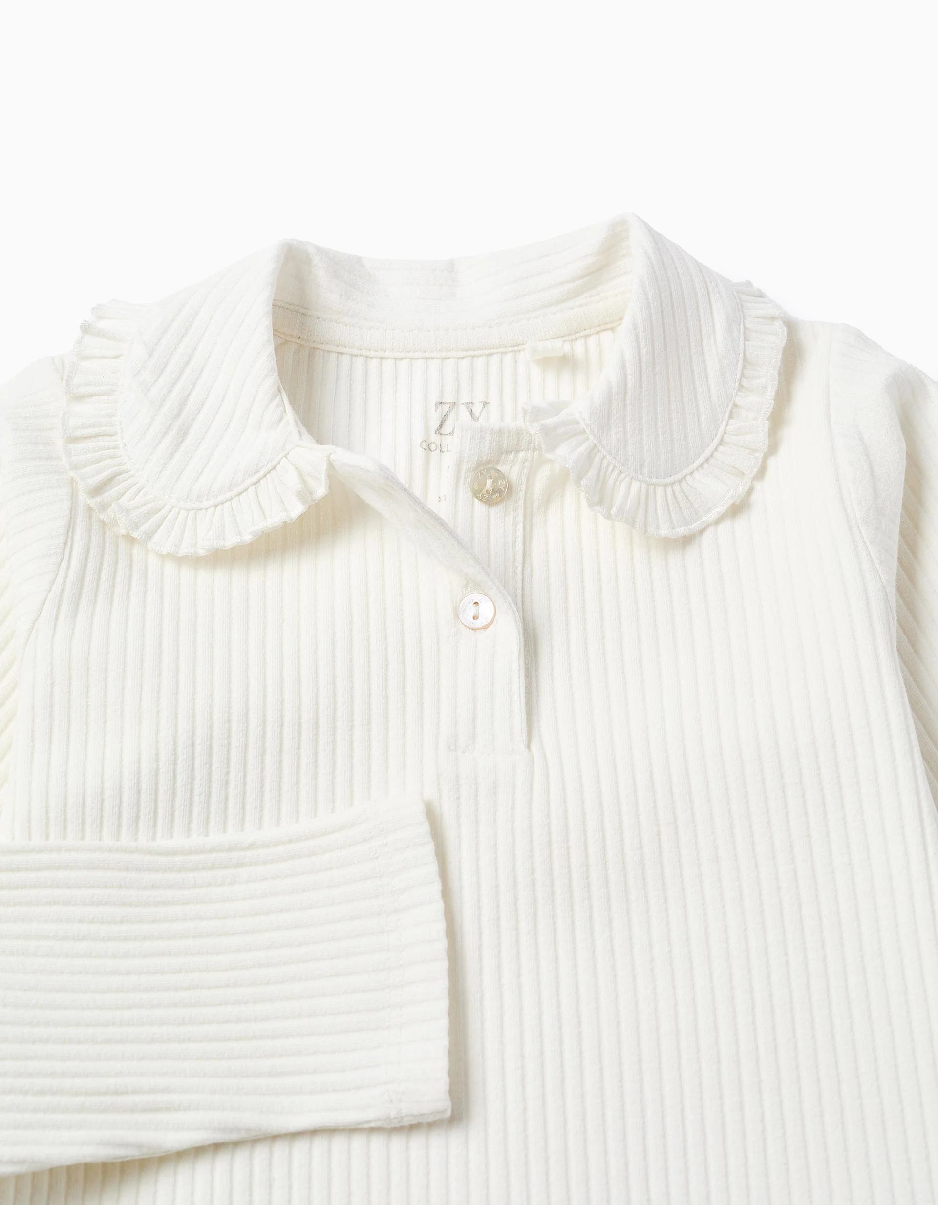 Camiseta de manga larga de canalé beige para niña, de algodón con un toque de elástico para mayor comodidad y libertad de movimientos. Cuello Peter Pan con contorno fruncido y botones. Etiqueta interior estampada para no irritar la piel. Cómoda y elegante, ¡perfecta para combinar con jerséis y vestidos!