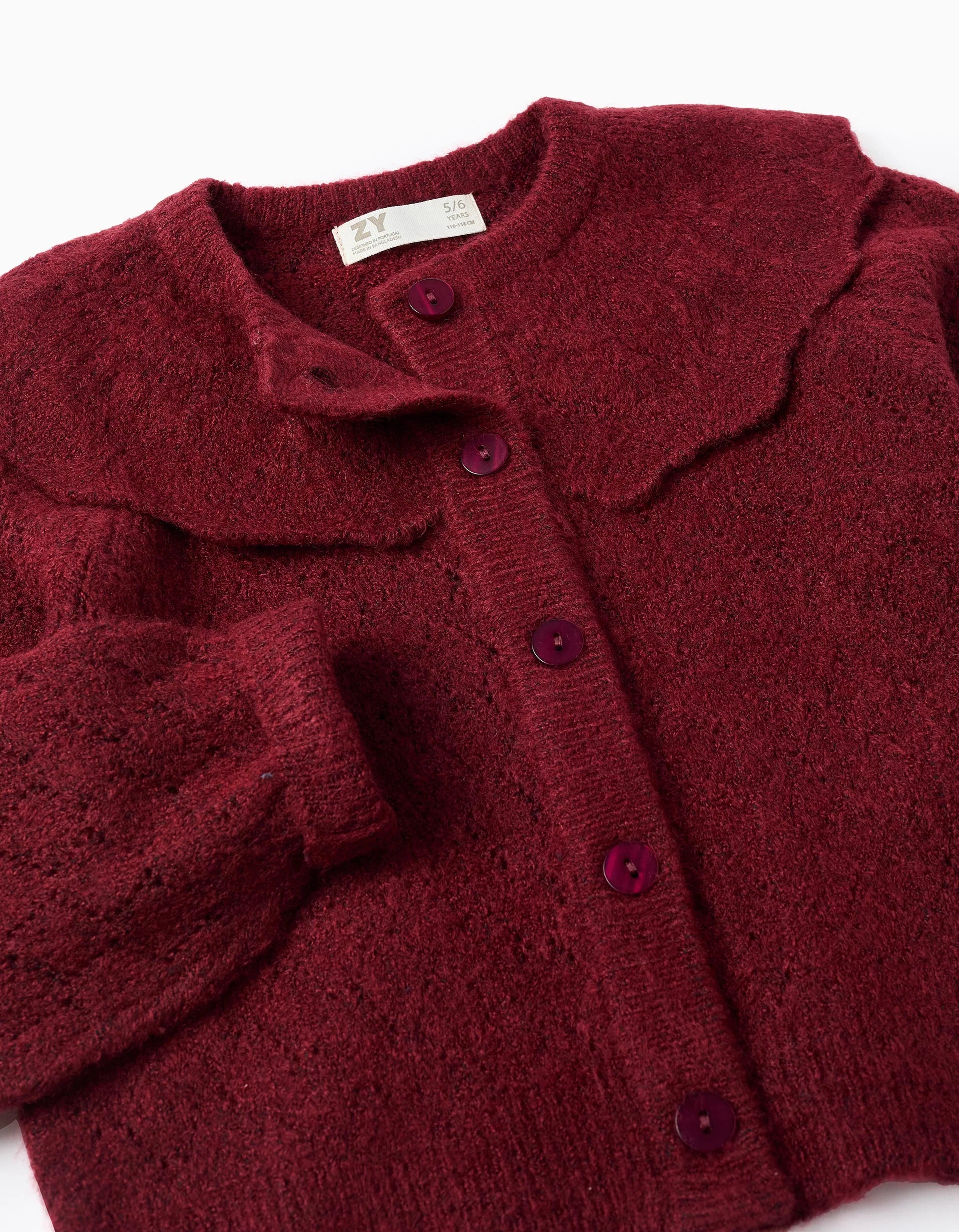 Esta chaqueta de punto calado burdeos, adornada con un delicado cuello con volantes, es perfecta para los días más fríos, asegurando que tu niña se sienta cómoda y elegante al mismo tiempo. Es perfecta para complementar looks de invierno, combinando bien con blusas y vestidos. ¡La chaqueta ideal para las pequeñas fashionistas que valoran la comodidad y el estilo!