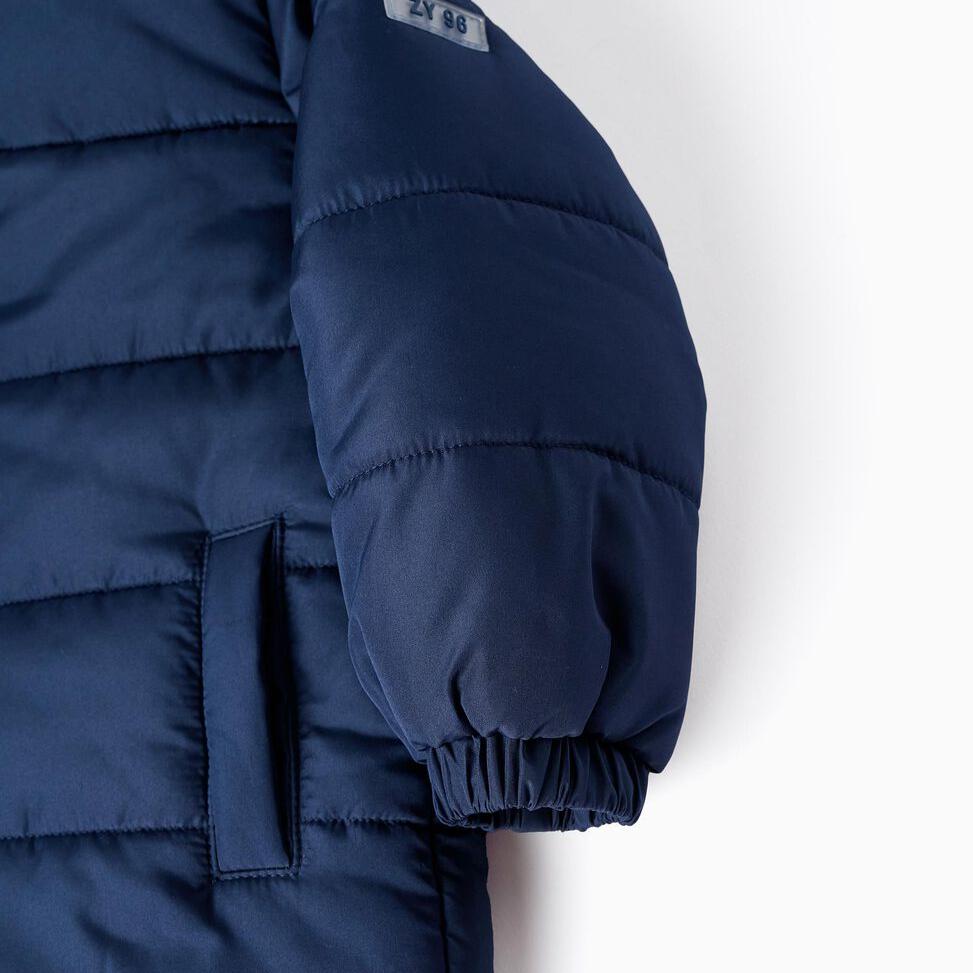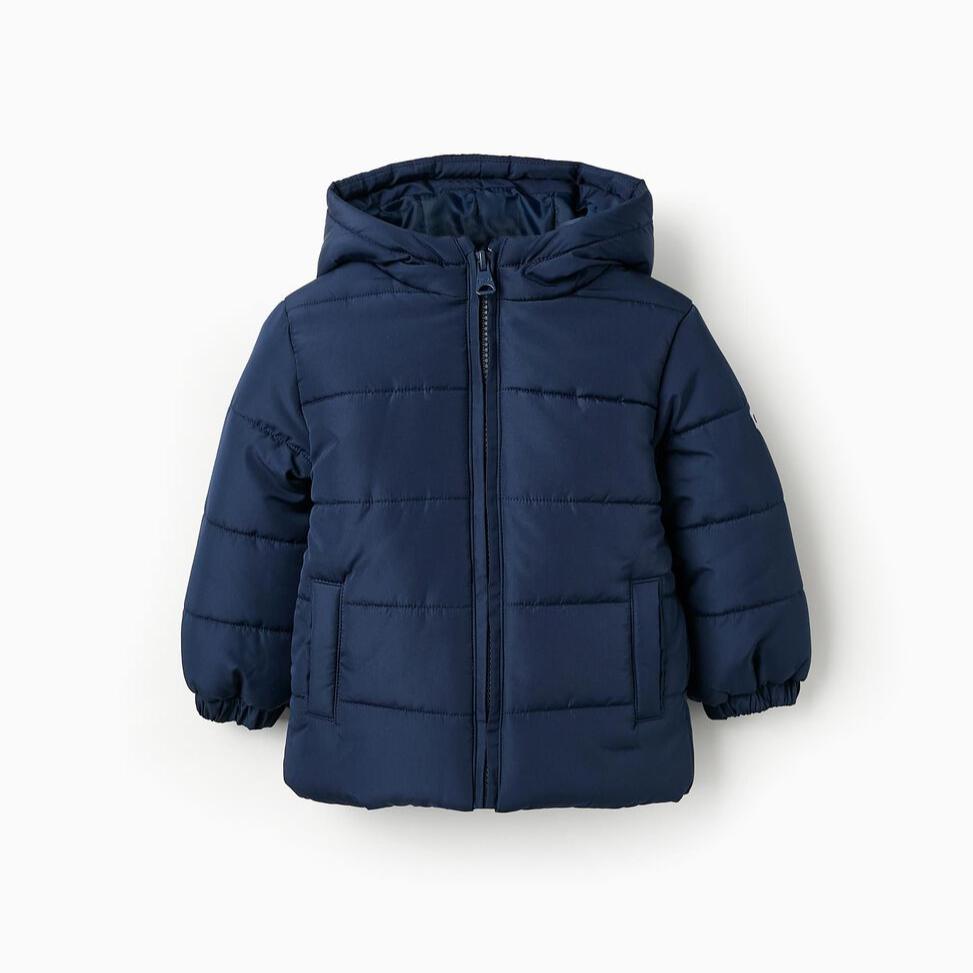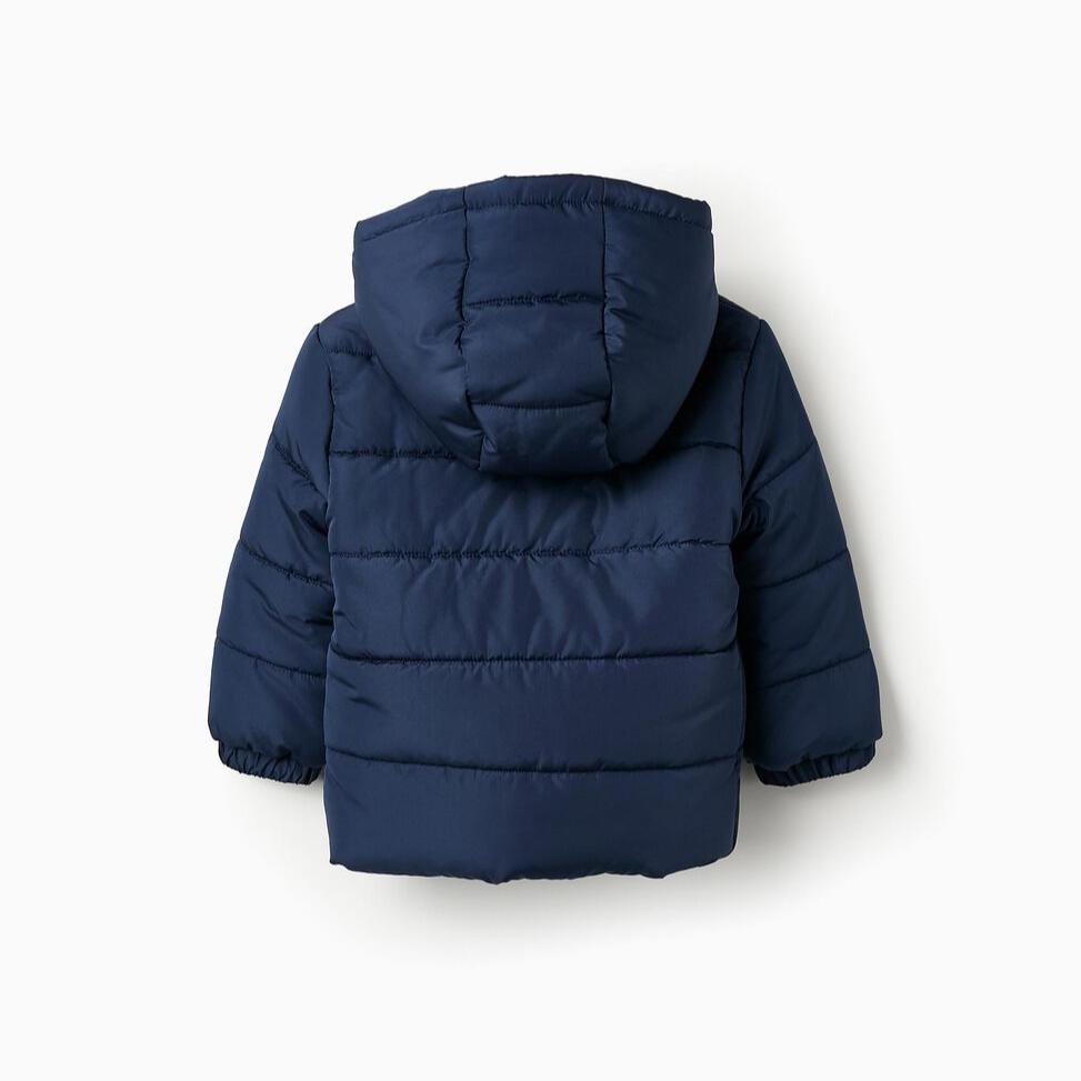 Chaqueta acolchada azul oscuro para bebé niño, con capucha. Se abrocha con cremallera para vestir fácilmente. Puños elásticos para un ajuste perfecto. Etiqueta en el interior para poner la identificación del niño. Una prenda versátil y cómoda, perfecta para los días más frescos.