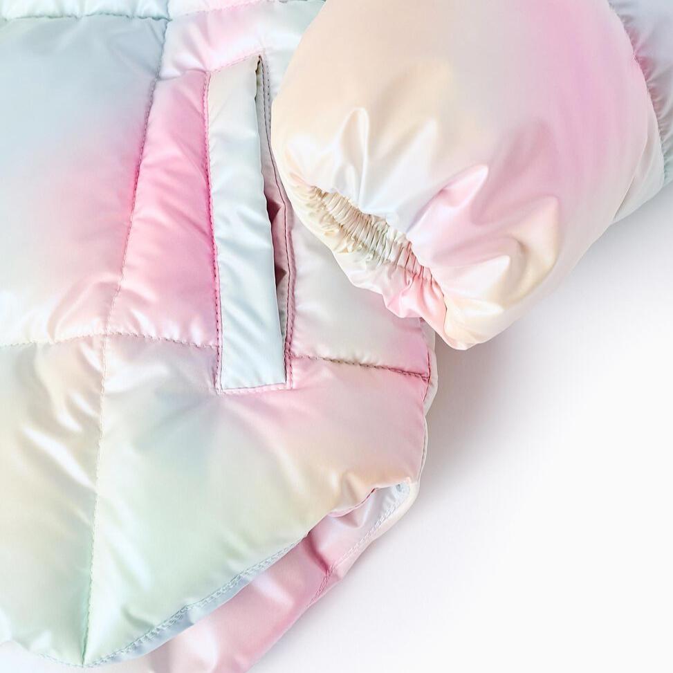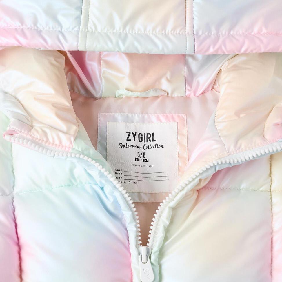 Chaqueta acolchada iridiscente para niña, con capucha. Bolsillos laterales. Puños elásticos para un ajuste perfecto. Etiqueta interior para poner la identificación del niño. Se abrocha con cremallera. Una chaqueta práctica y cómoda para el día a día, llena de color y personalidad.