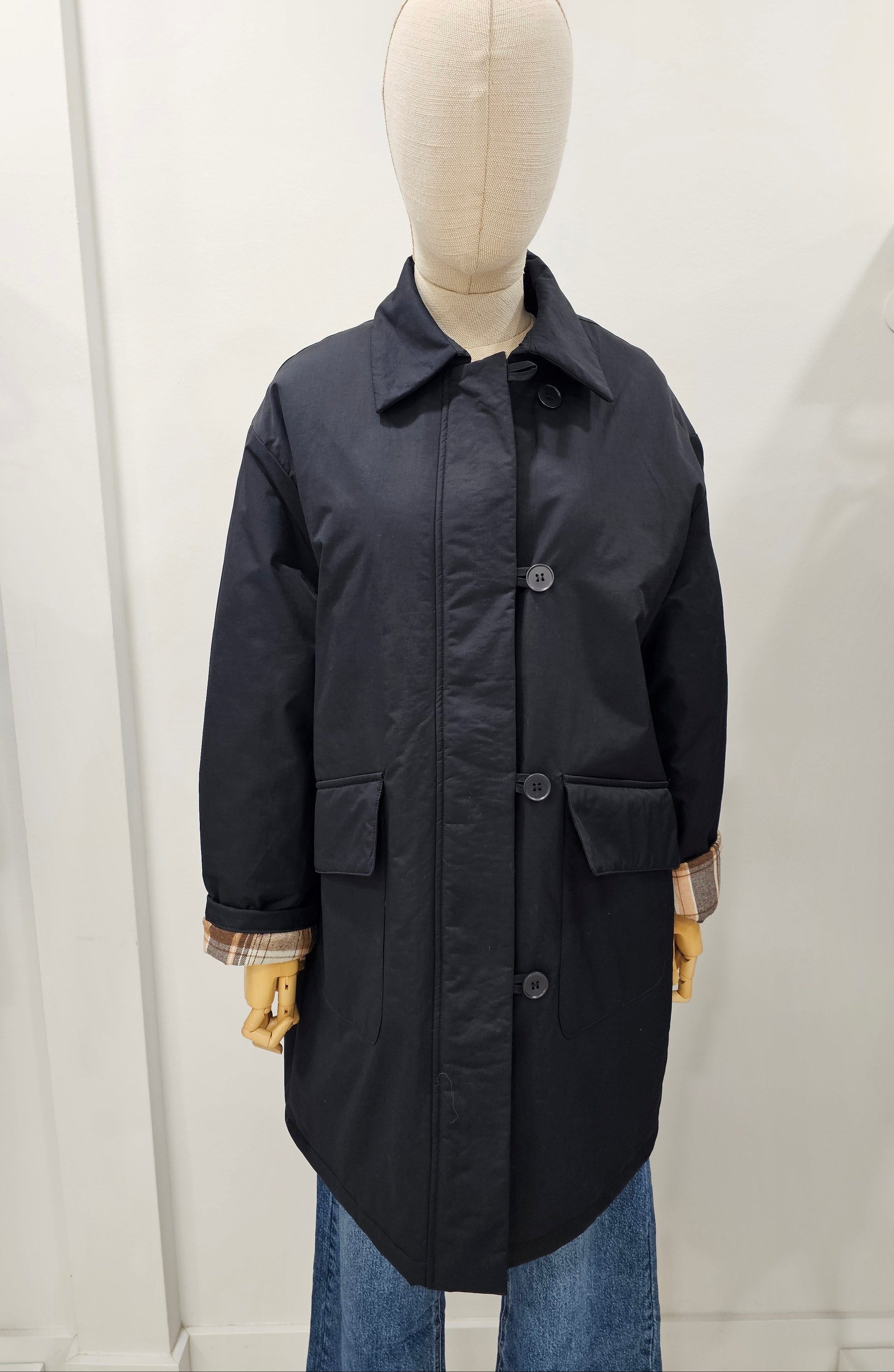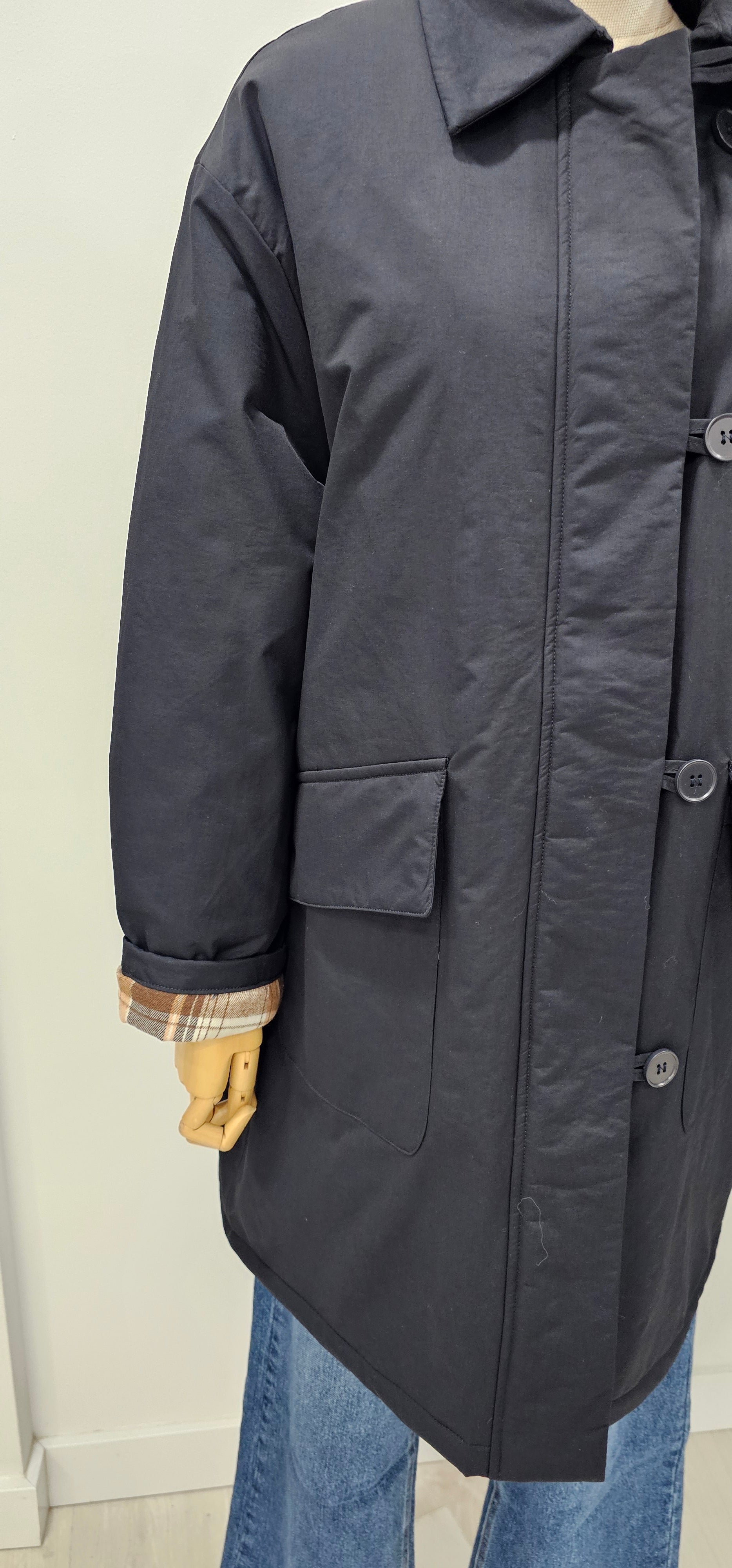 Prenda versátil diseñada con doble sistema de cierre que combina botones y cremallera para máxima funcionalidad. El acolchado interior proporciona calidez sin añadir volumen excesivo. Los puños internos, revestidos con tejido de cuadros, permiten ajustar la prenda al remangarse mientras exhiben detalles decorativos. La abertura estratégica en la espalda facilita la movilidad y proporciona versatilidad en su uso.