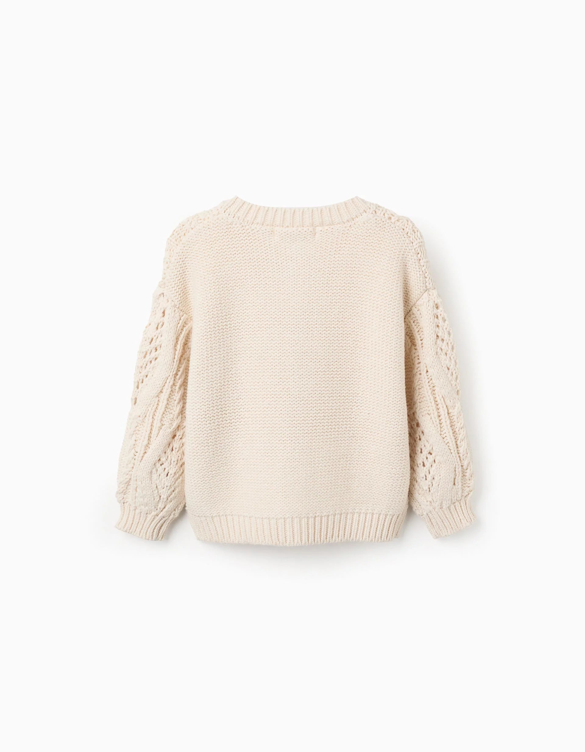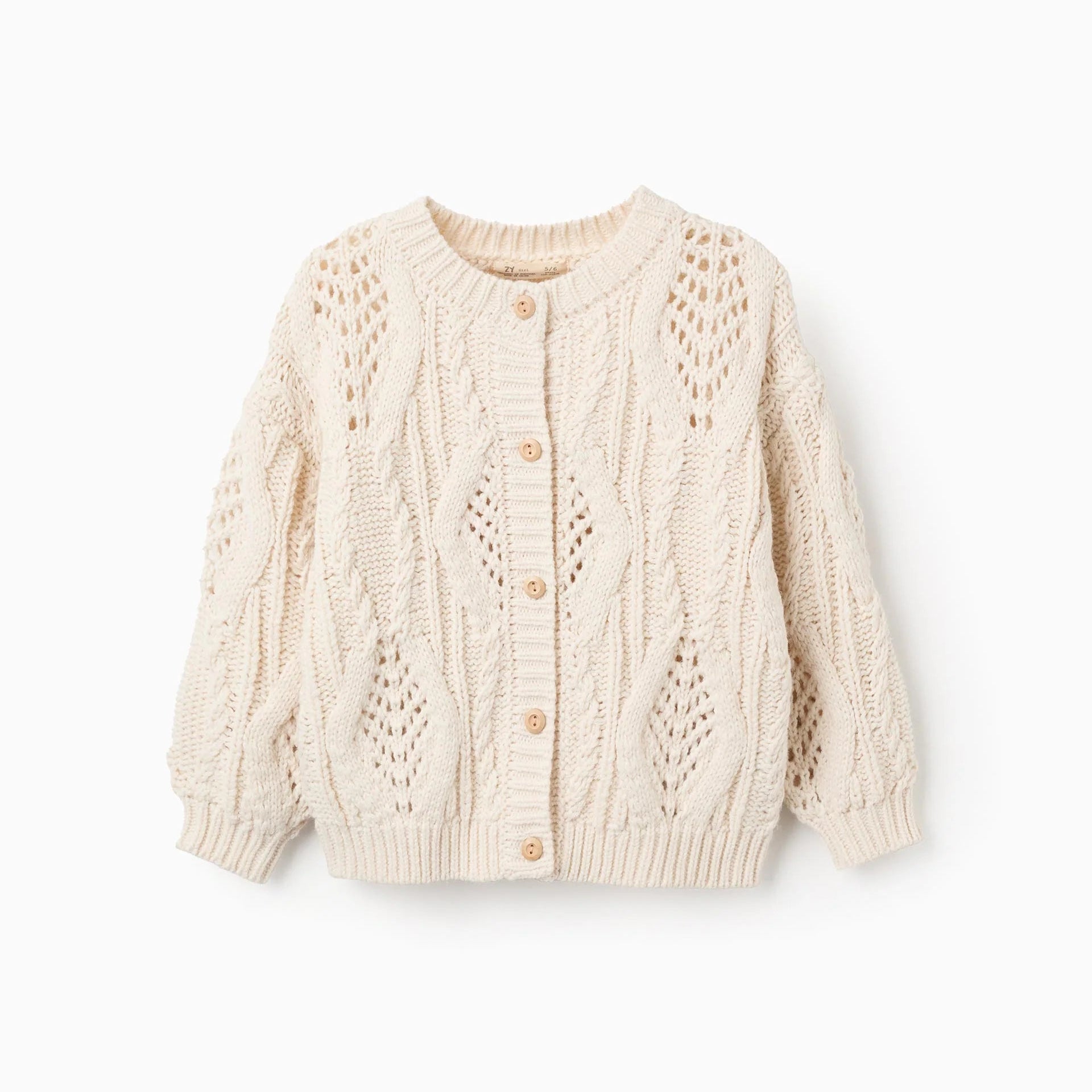 Chaqueta de punto grueso beige para niña, con diferentes efectos. Extremos acanalados para un ajuste perfecto. Botones de imitación de madera.