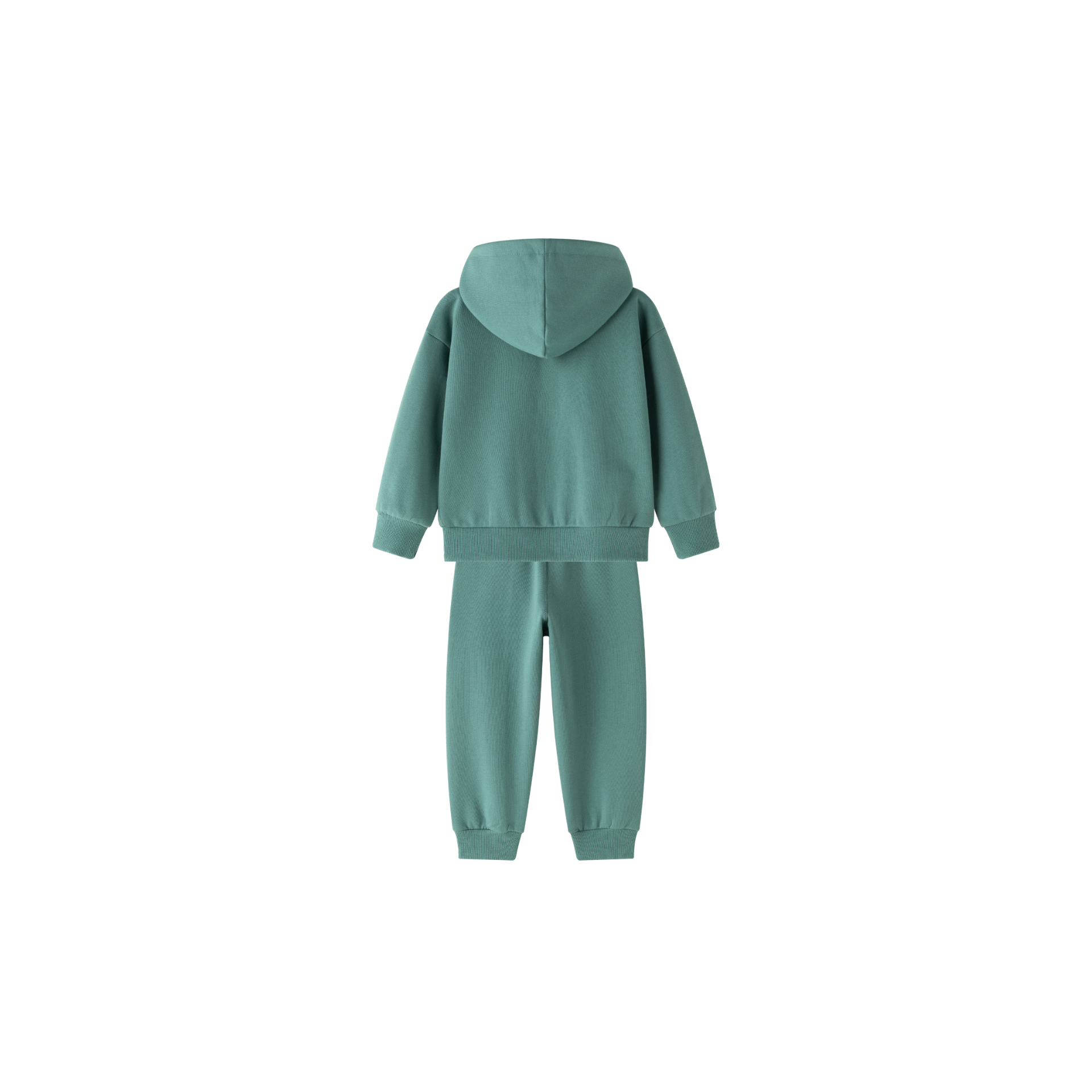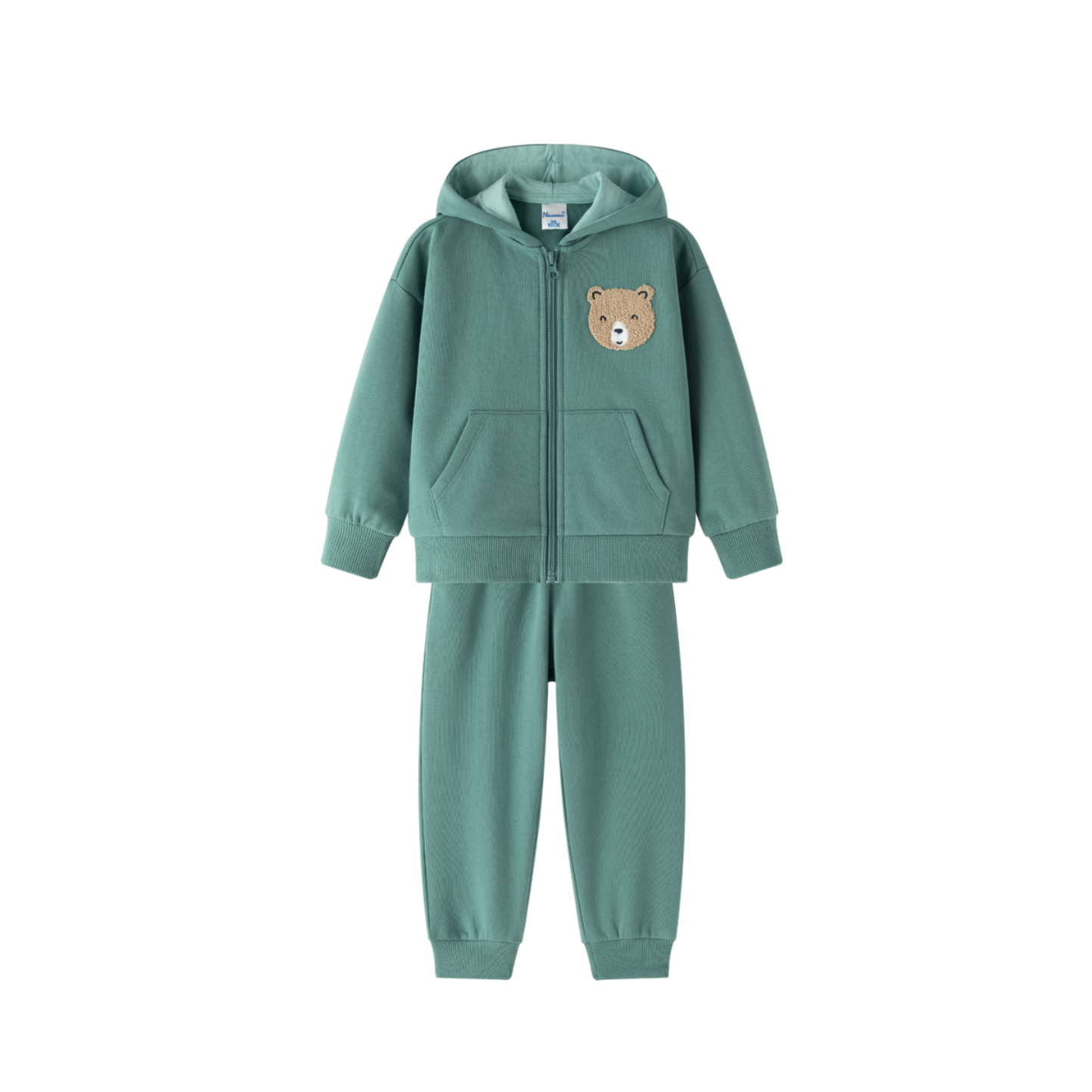 Conjunto bebé niño chaqueta con capucha felpa y pantalón largo afelpado. Chaqueta de manga larga cuello a la caja, con cremallera, capucha y bolsillo canguro delanteros. Con un parche chenille de osito. Pantalón largo de felpa perchado con cinturilla de goma elástica.