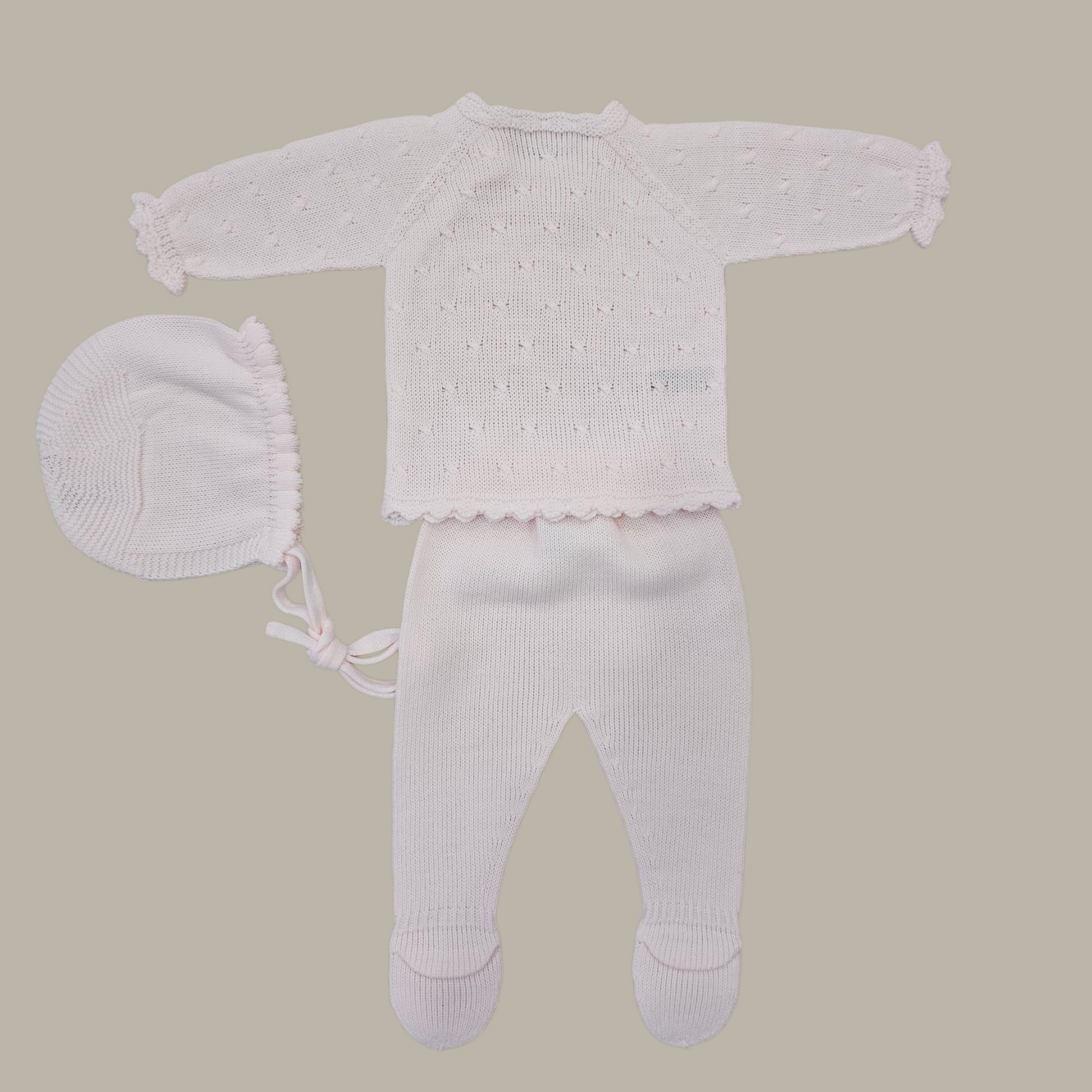 Tres piezas que incluyen jersey, polaina y capota confeccionadas en tejido Dralón, con cierre de botones de madera. Disponible en un delicado rosa empolvado, perfecto para combinar con nuestro body de bambula.