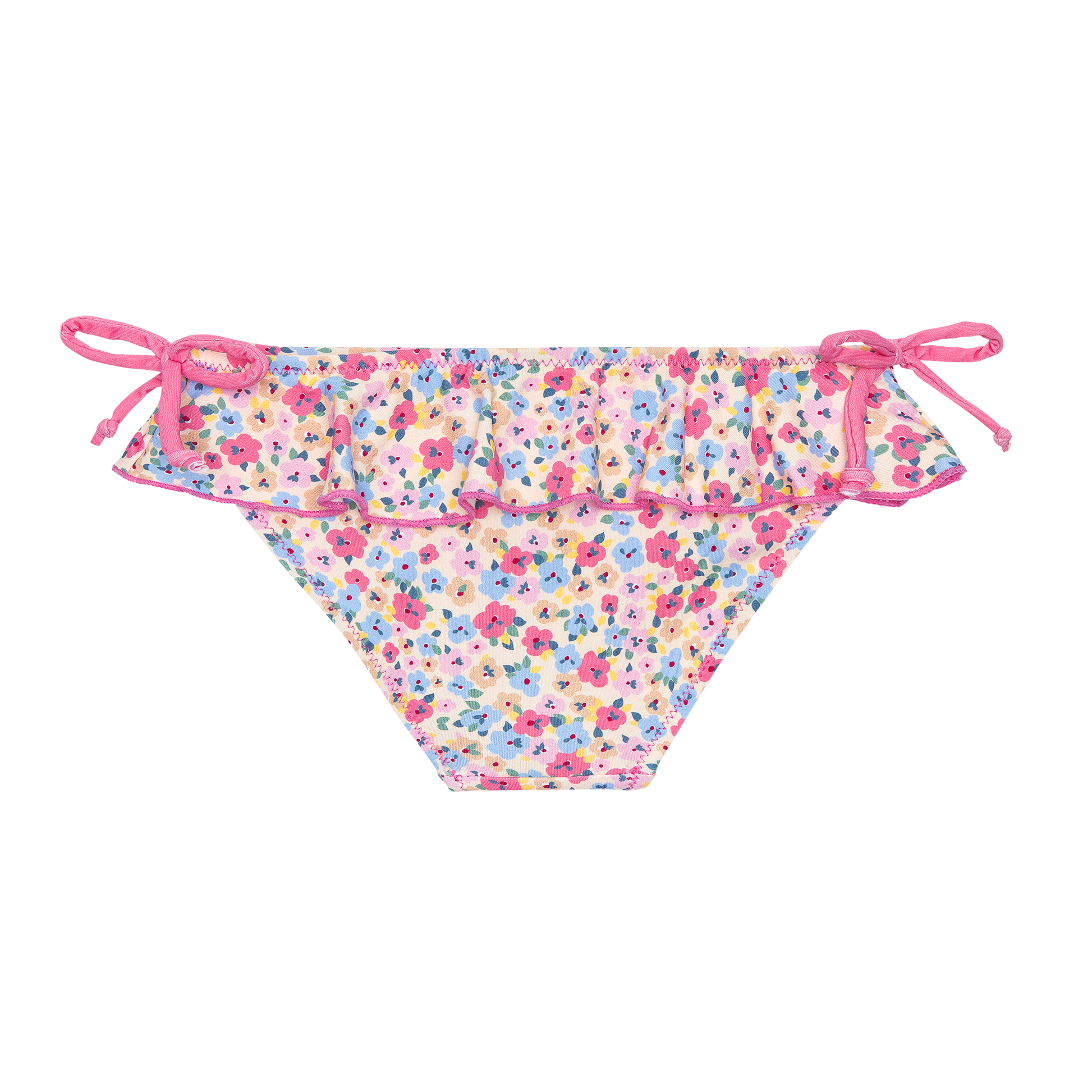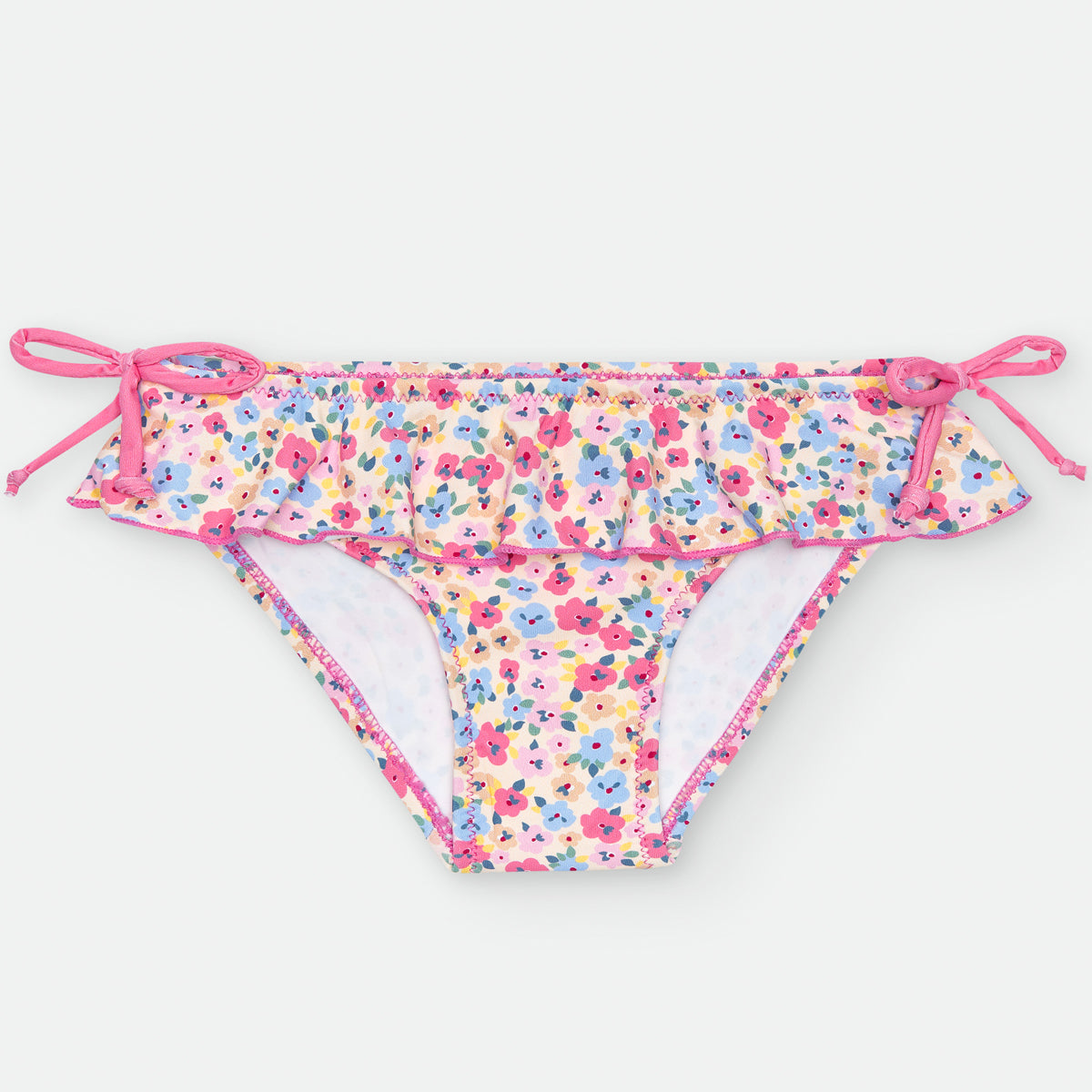BRAGUITA DE BAÑO CON CINTURILLA ELÁSTICA, VOLANTE Y LAZOS EN LOS LATERALES.