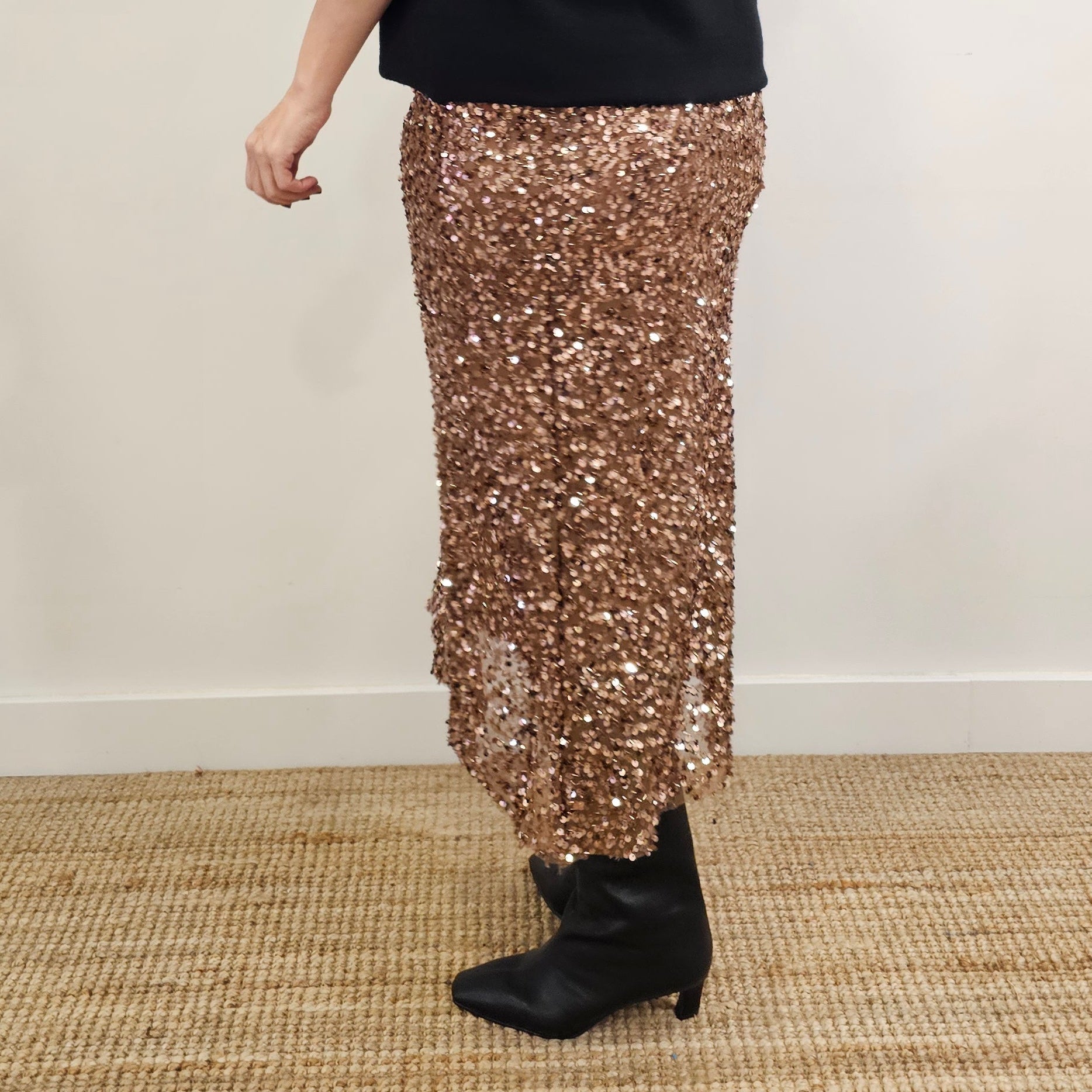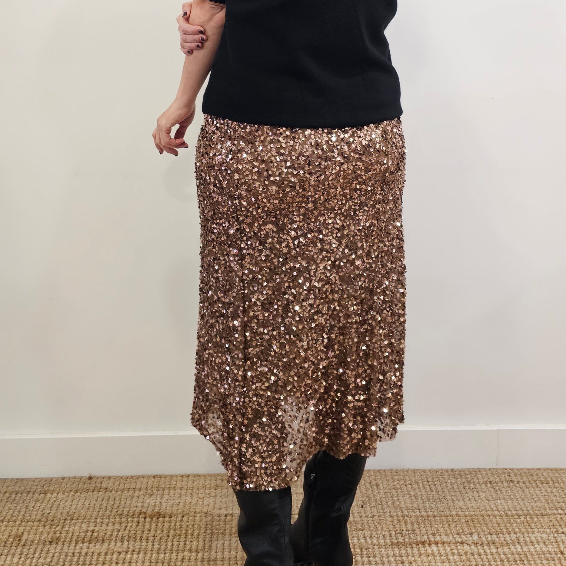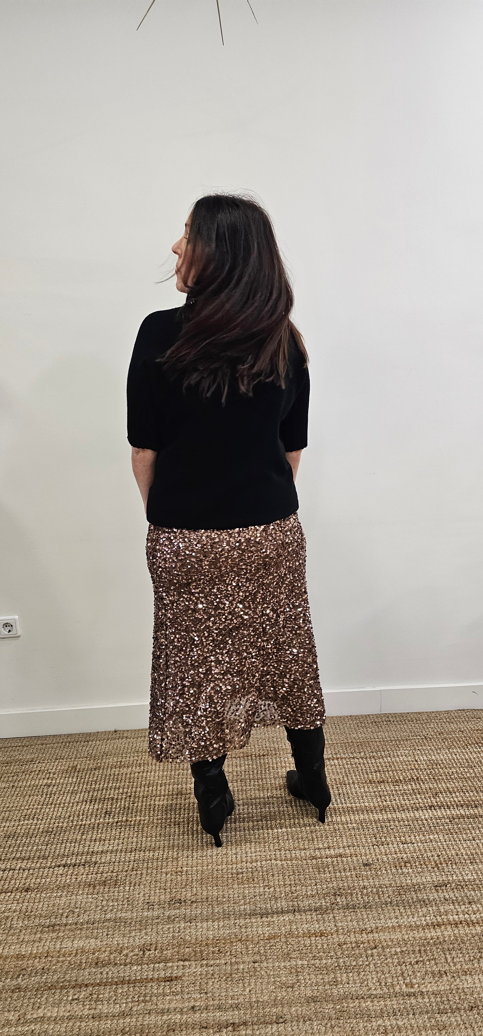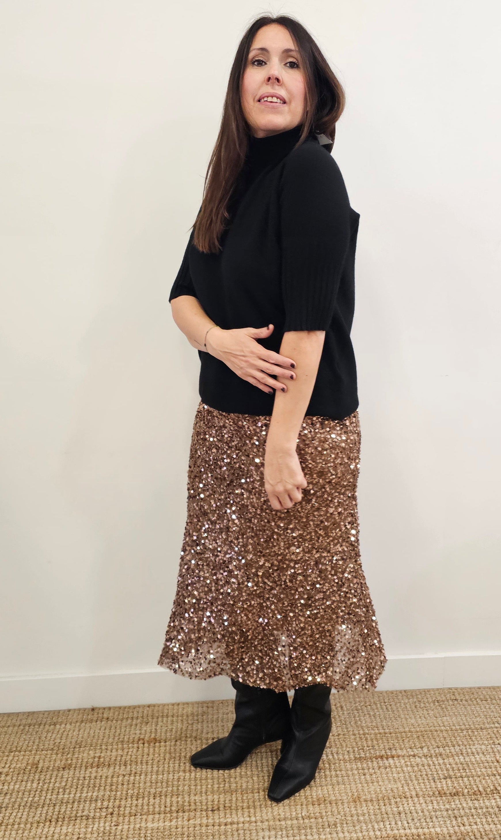 Descubre nuestra falda midi con ese toque brillante que te hará destacar. Confeccionada en tejido de lentejuelas, esta prenda versátil combina comodidad y glamour en una sola pieza. Con forro interior para mayor confort y un corte que se adapta a tallas XS, S y M, es el complemento perfecto para noches especiales o cuando quieras sentirte radiante.