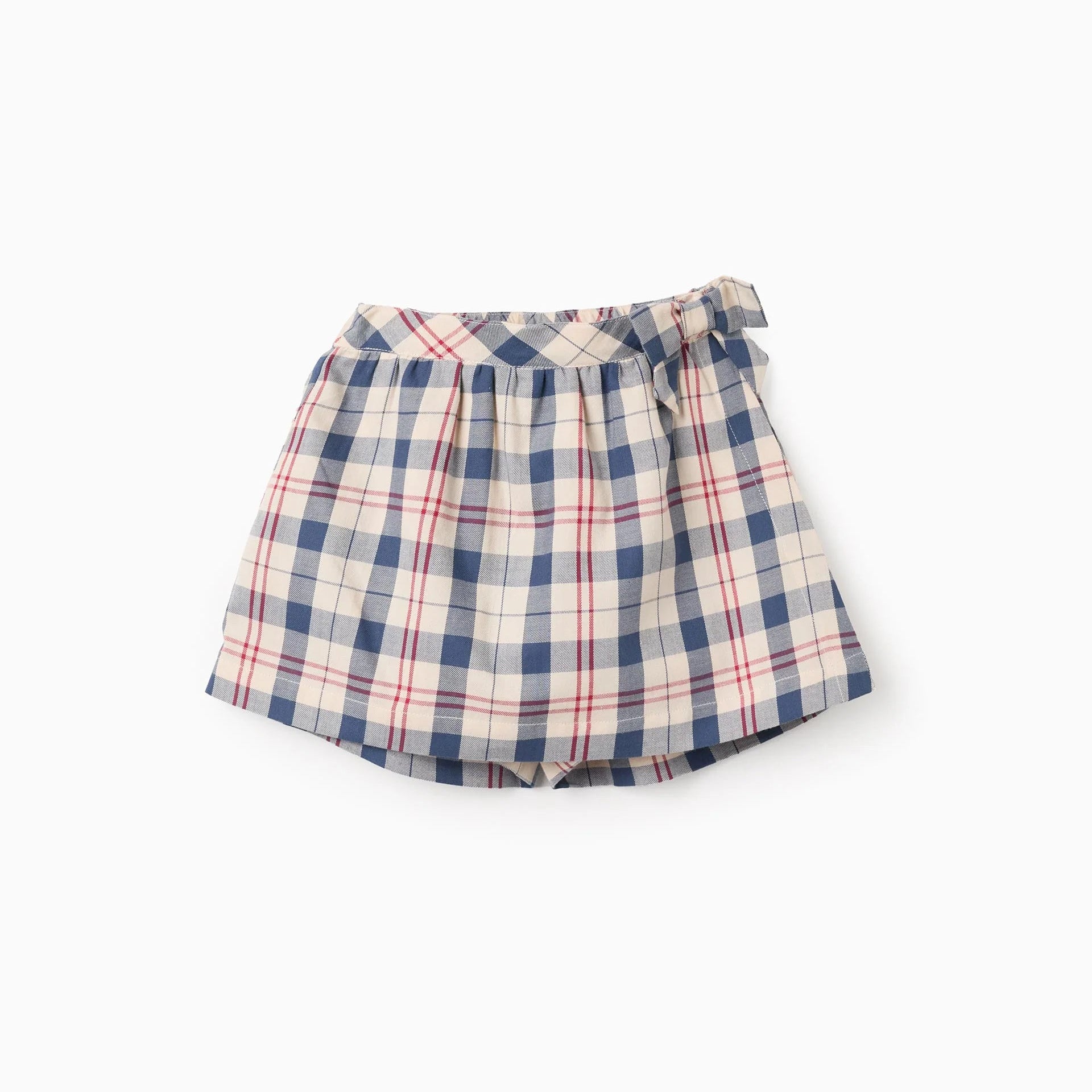 Colección Brothers & Sisters. Falda pantalón para niña con estampado de cuadros en tonos beige, azul y rojo. 100% algodón. Pantalón corto integrado debajo. Cintura elástica y cómoda con cremallera invisible en el lateral, ajustable en el interior con gomas y botones. Detalle de lazo en el lateral. Forrado. ¡Para looks adorables entre hermanos!