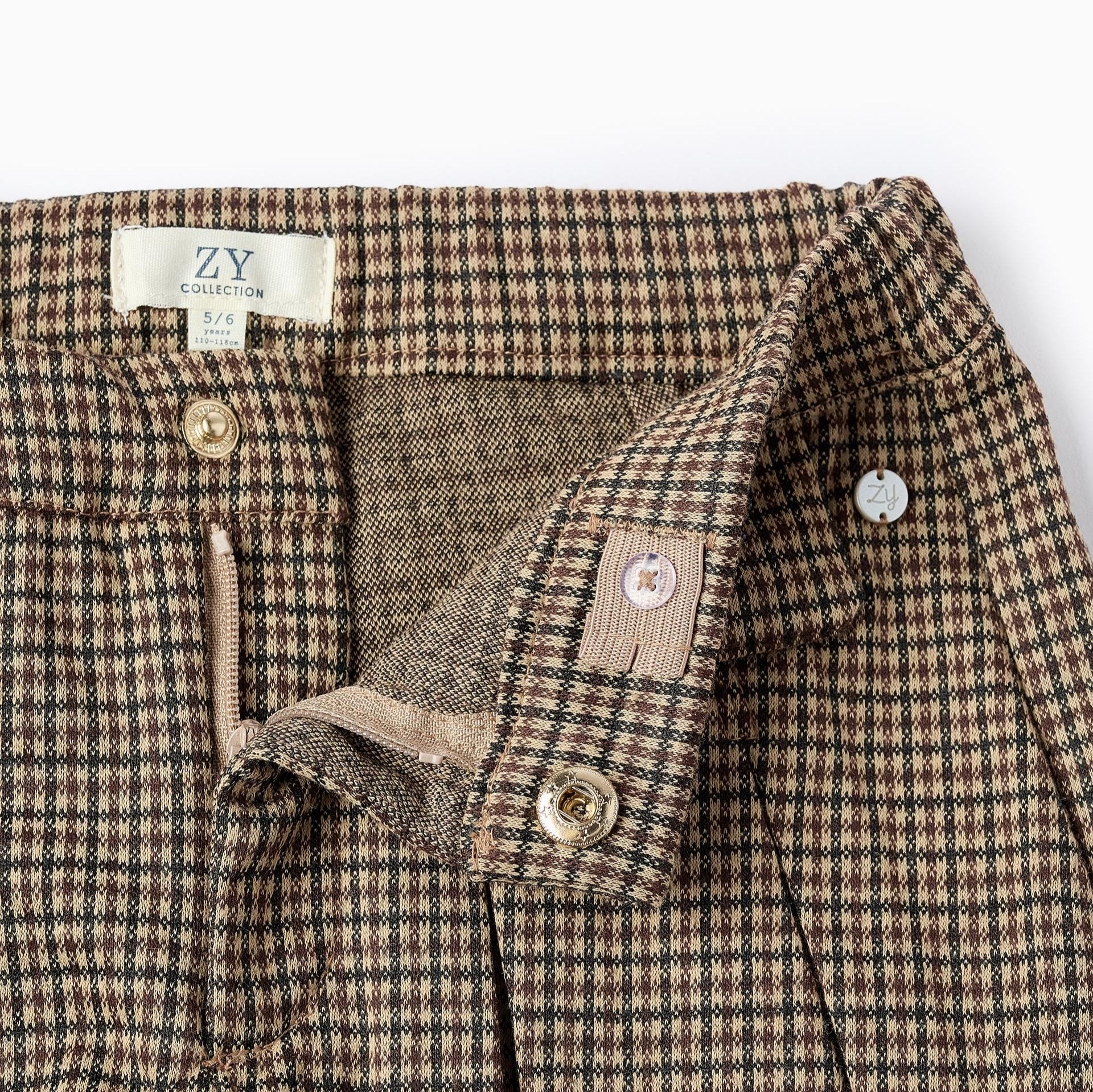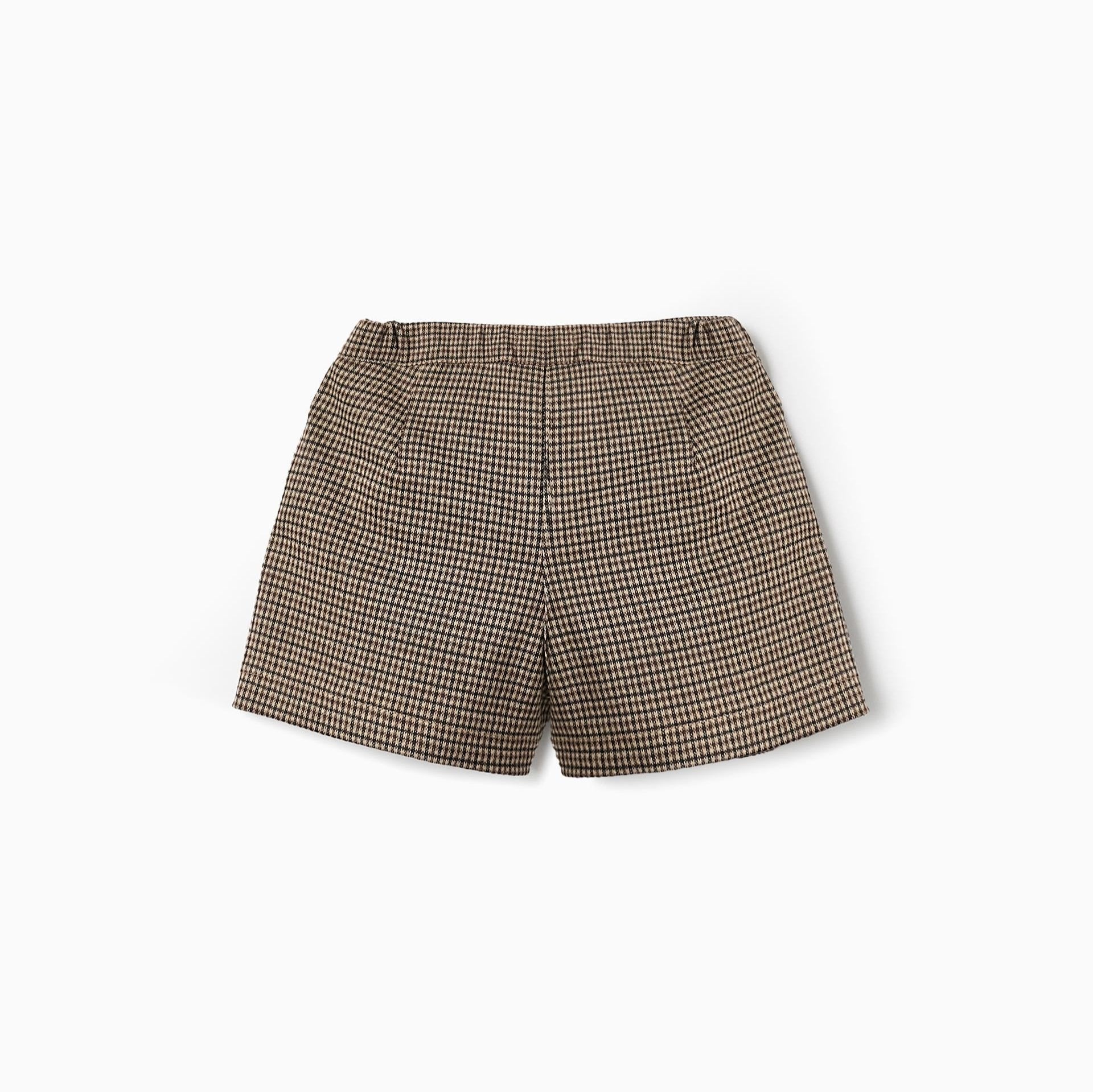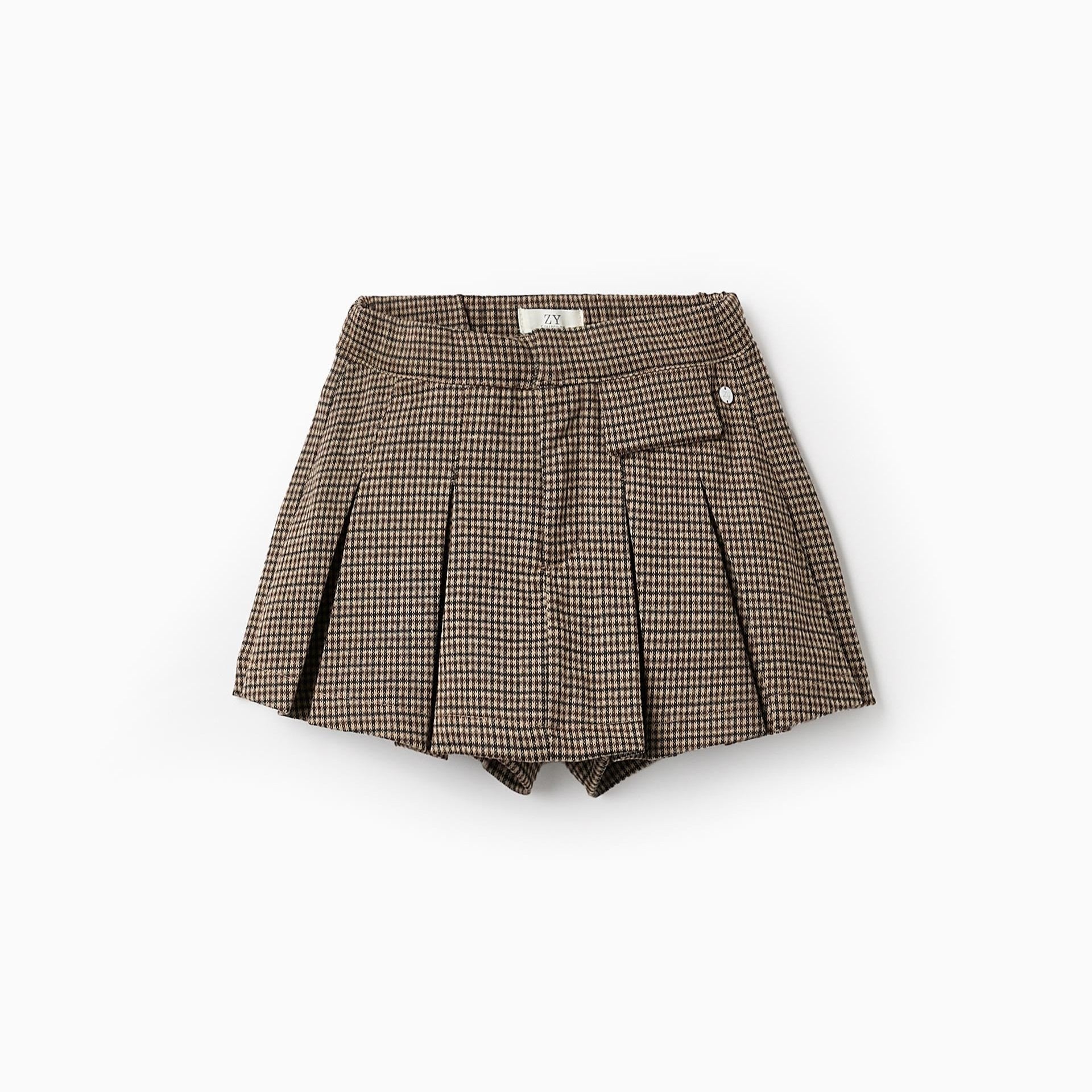 Falda-pantalón para niña, con estampado pied de poule en tonos beige, marrón y negro. Cintura ajustable en el interior con elásticos y botones. Se abrocha fácilmente con botón automático. Bolsillo decorativo con solapa. Una pieza elegante y original con un toque tradicional.