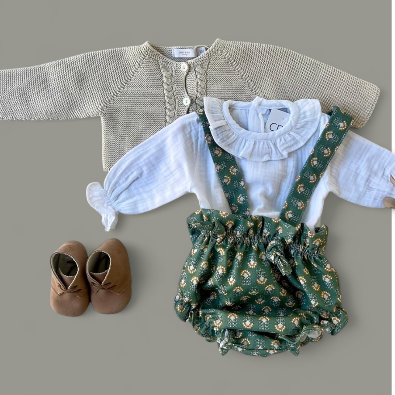 Braguita cubre pañal con tirantes ajustables mediante nudo, que incorpora gomas elásticas en cintura y piernas para un mejor ajuste. Fabricada en tejido con delicadas florecitas azules, disponible en múltiples estampados. Gracias a sus elásticos, se adapta a diversas tallas. Combínala fácilmente con nuestro body de bambula, así como con calcetín alto o leotardos en tonos coordinados.