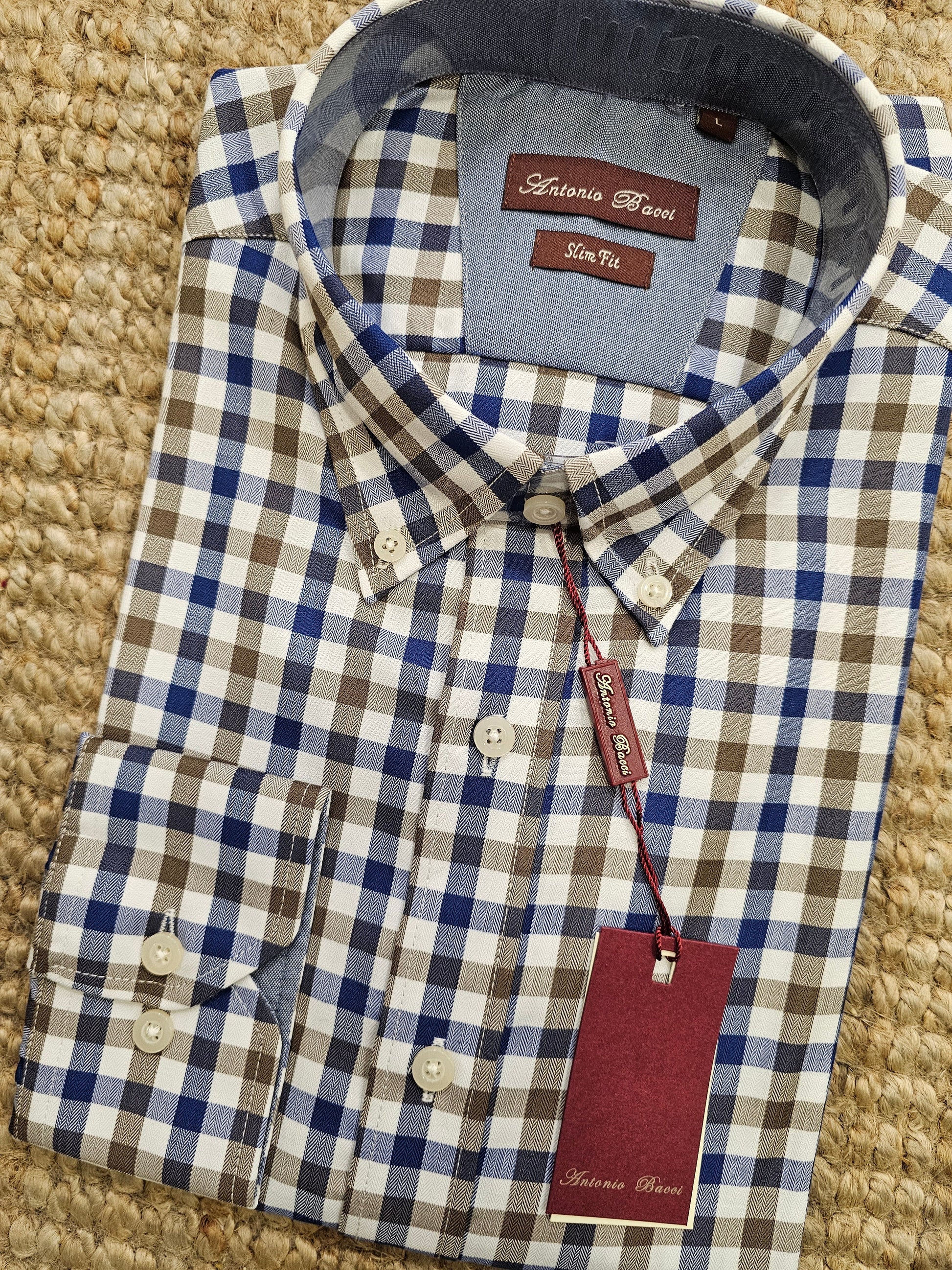 Descubre nuestra camisa Oxford de cuadros en tonos blanco, azul y caramelo. Corte slim fit que abraza tu silueta con elegancia. Diseñada en Madrid por Antonio Bacci, esta prenda combina precisión artesanal con un toque desenfadado. Perfecta para elevar tu look casual o llevarlo al siguiente nivel en ocasiones más formales.