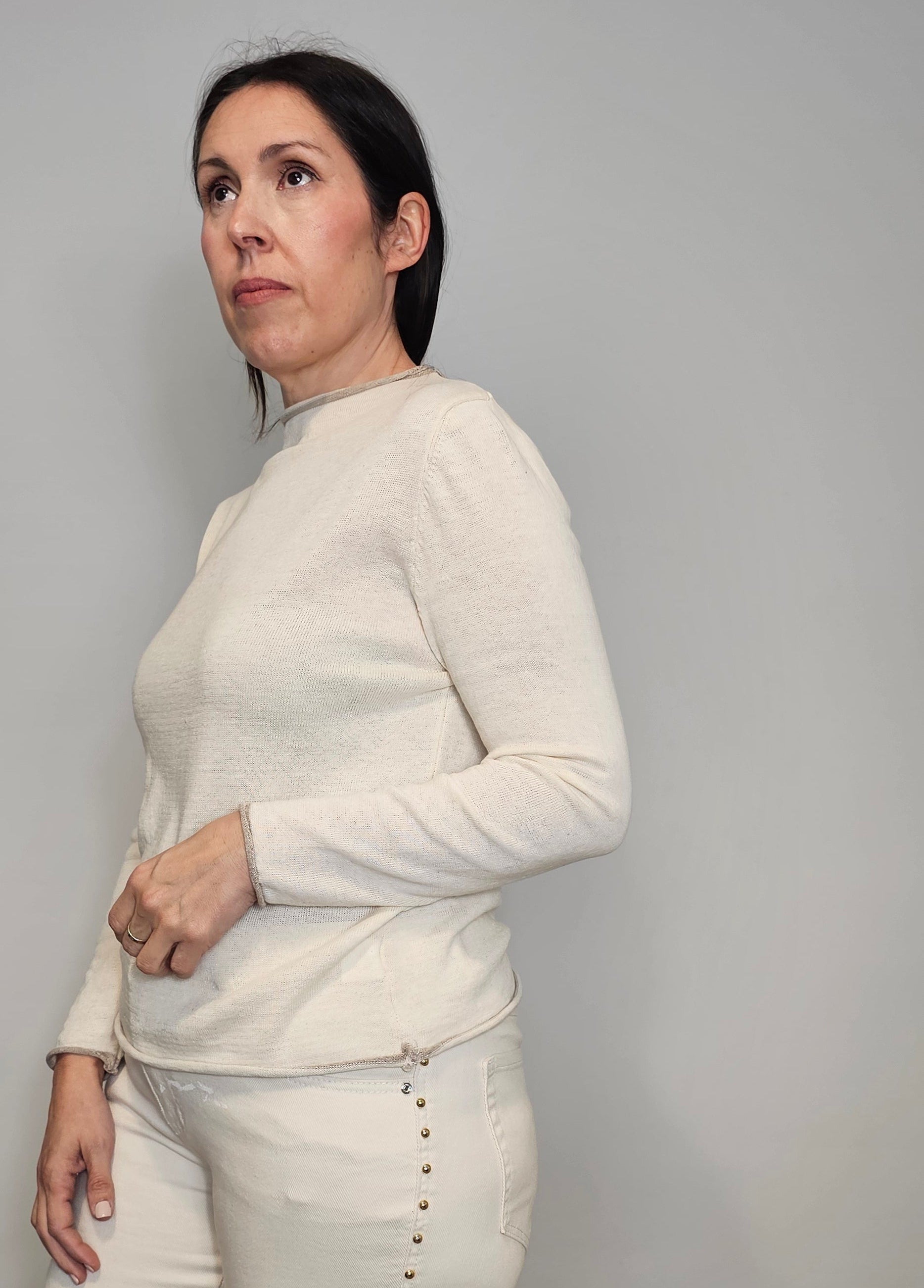 Tejido de punto muy fino con ribetes en tono camel en cuello y mangas