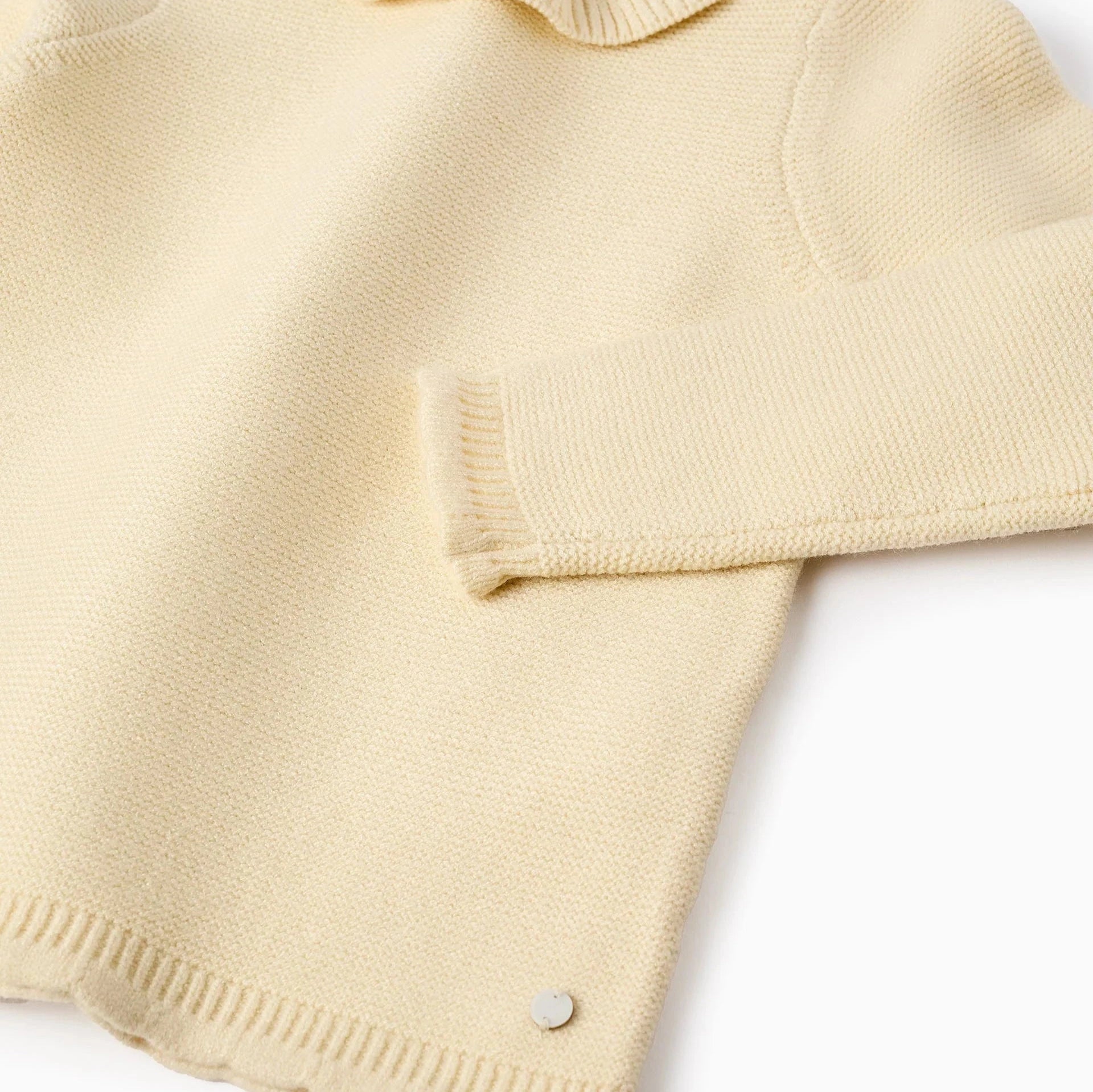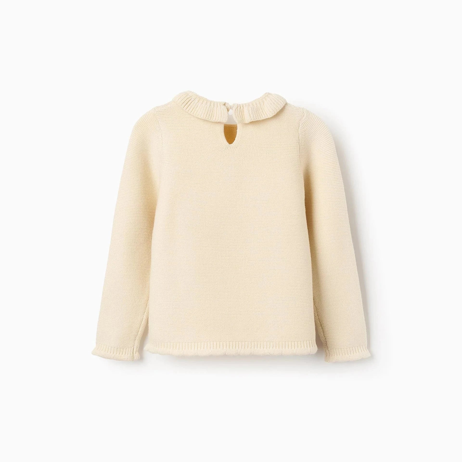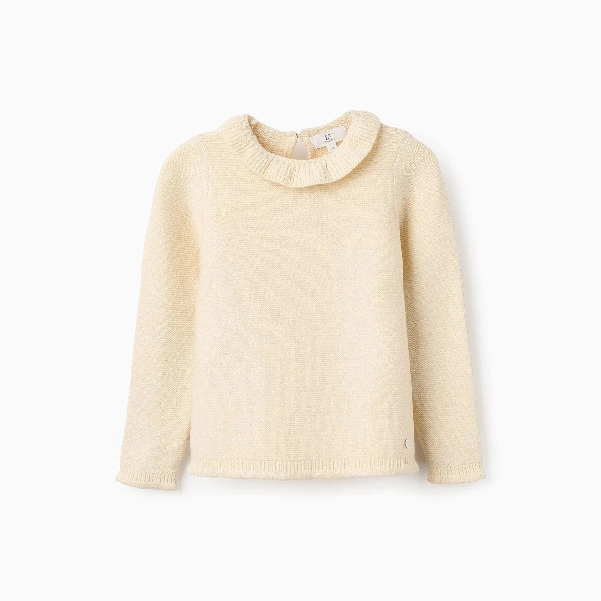 Jersey de punto beige para niña, con cuello de volante. Base y puños acanalados y con acabado ondulado para un ajuste perfecto. Botón en la espalda. Un jersey elegante, versátil y atemporal.