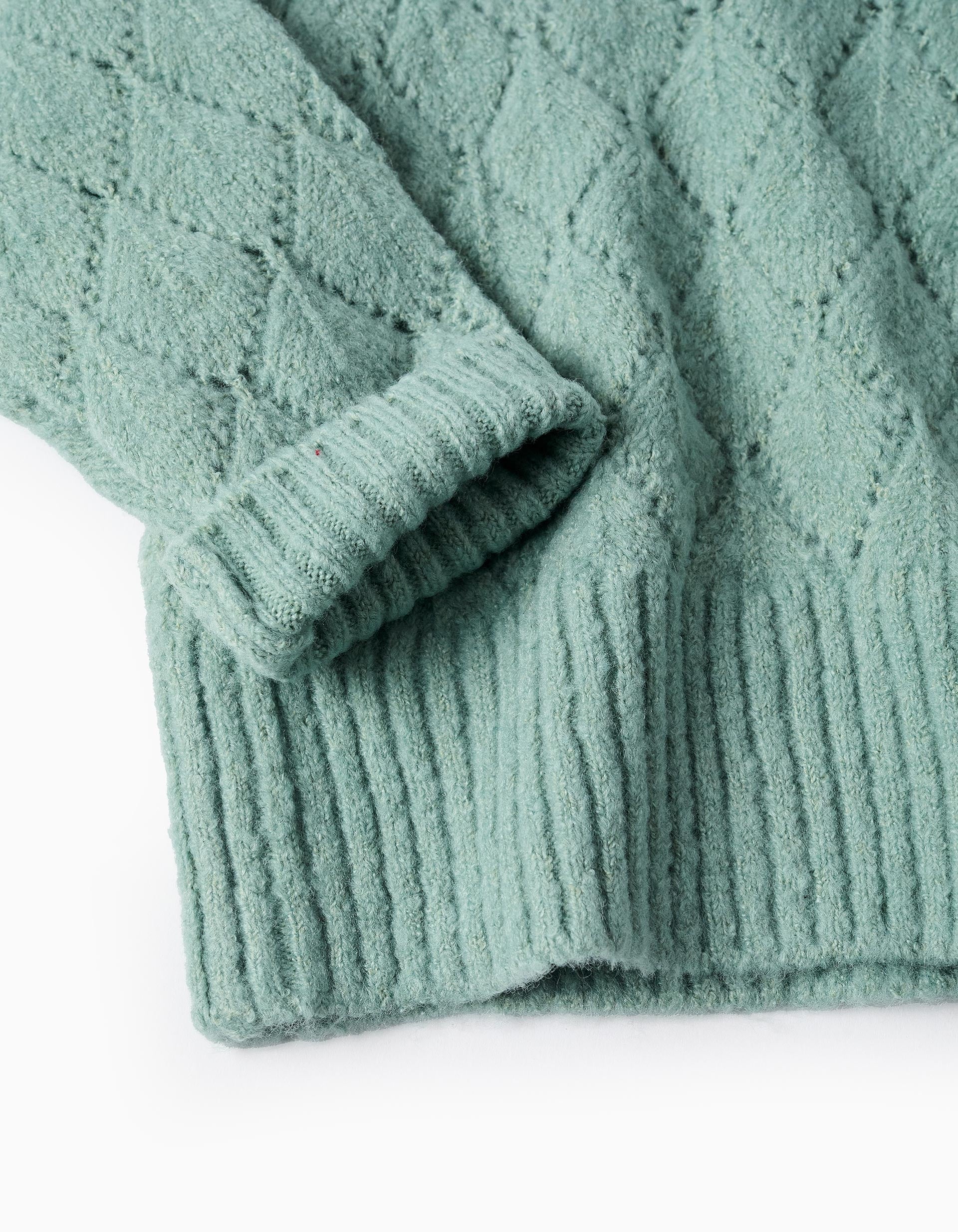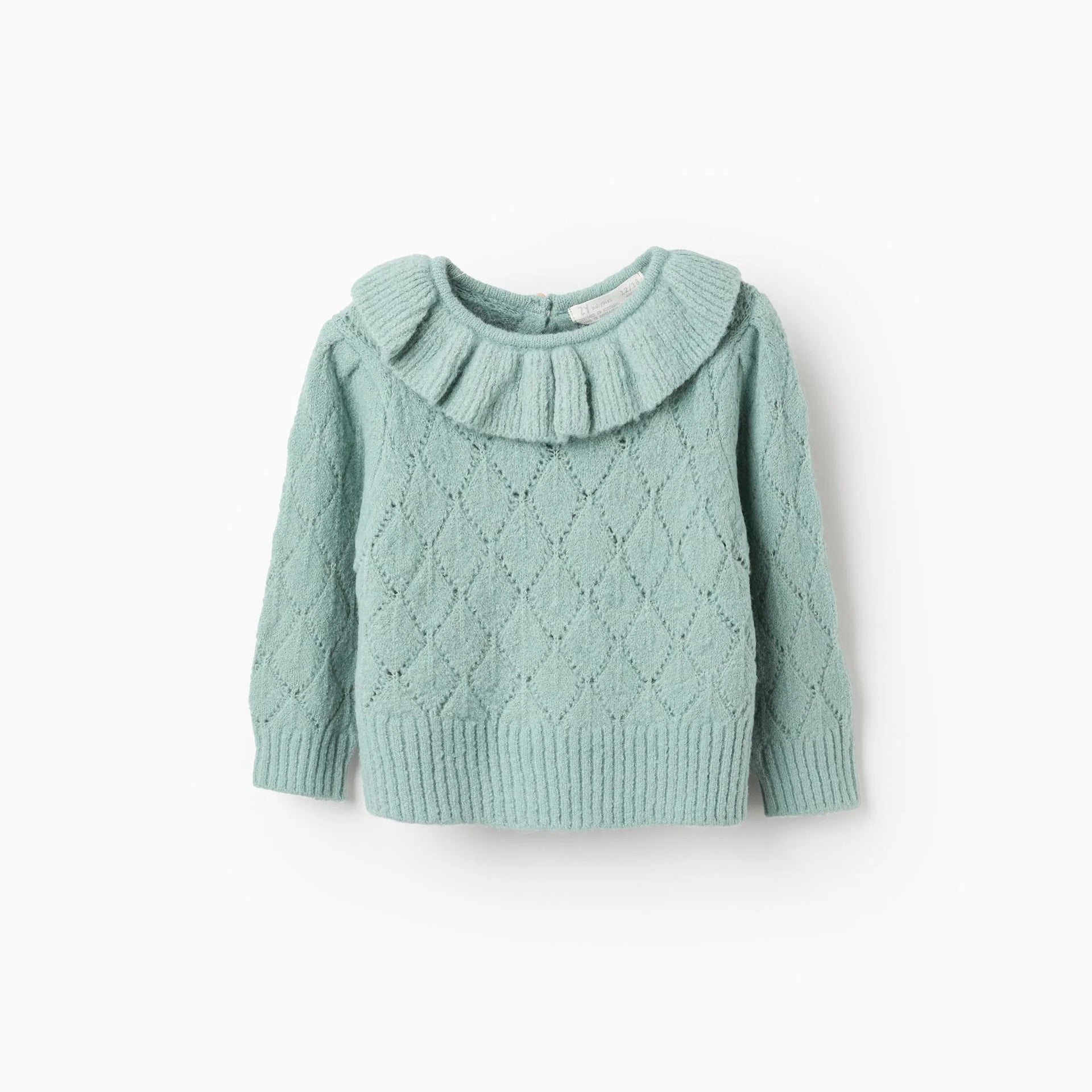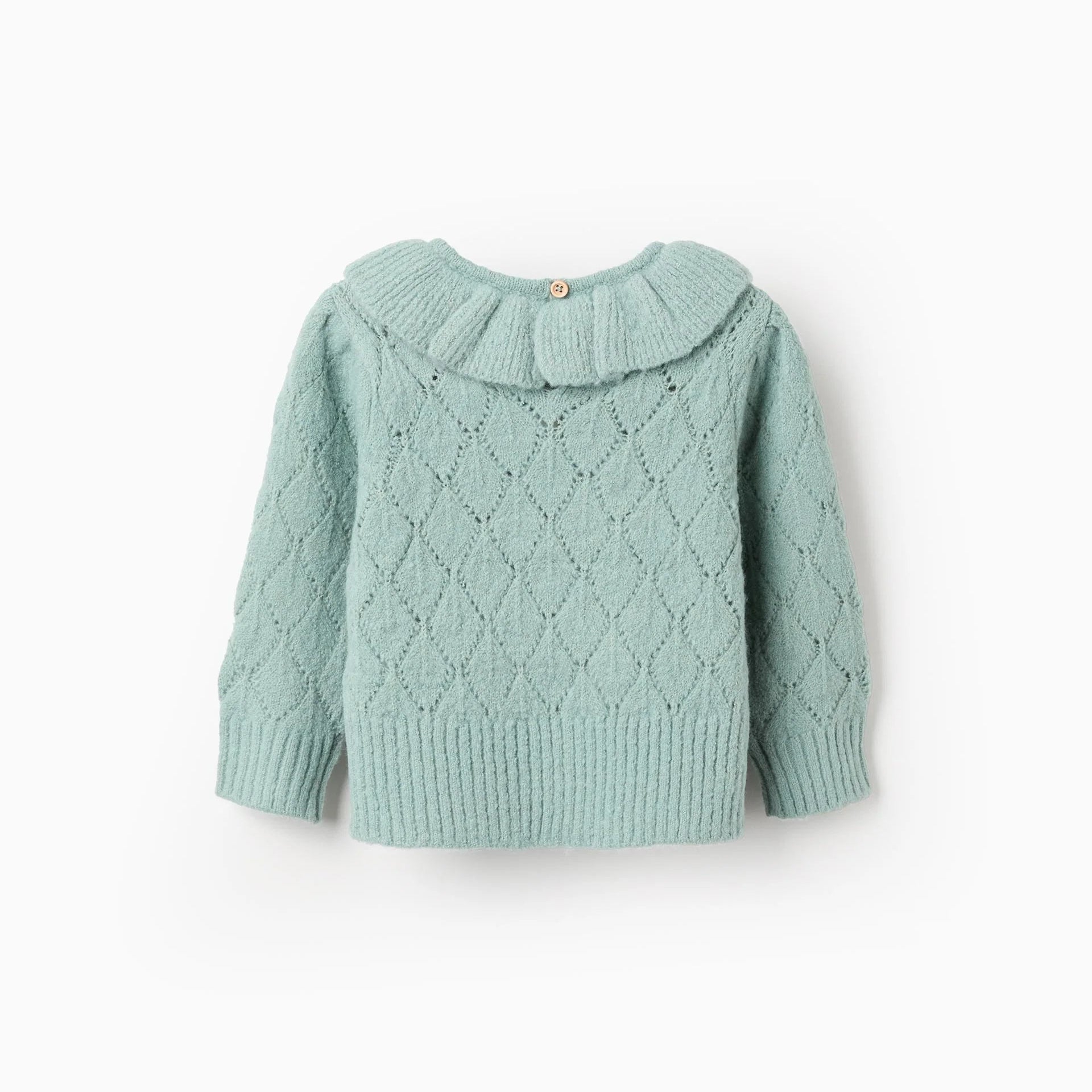 Jersey de punto calado verde para bebé niña, suave y confortable. Cuello con volantes. Puños acanalados para un ajuste perfecto. Botón en la espalda para vestir fácilmente.