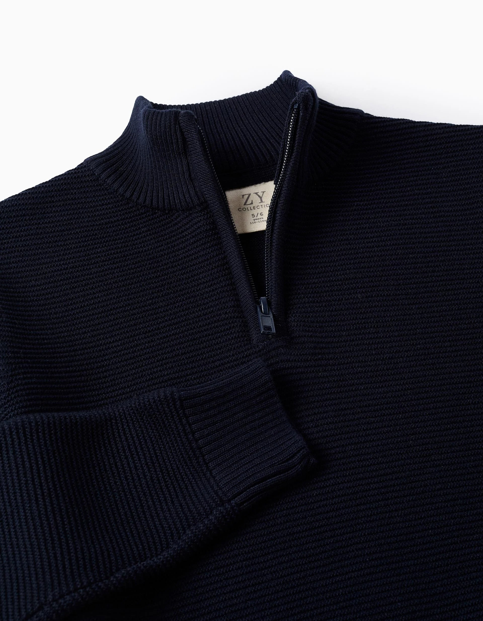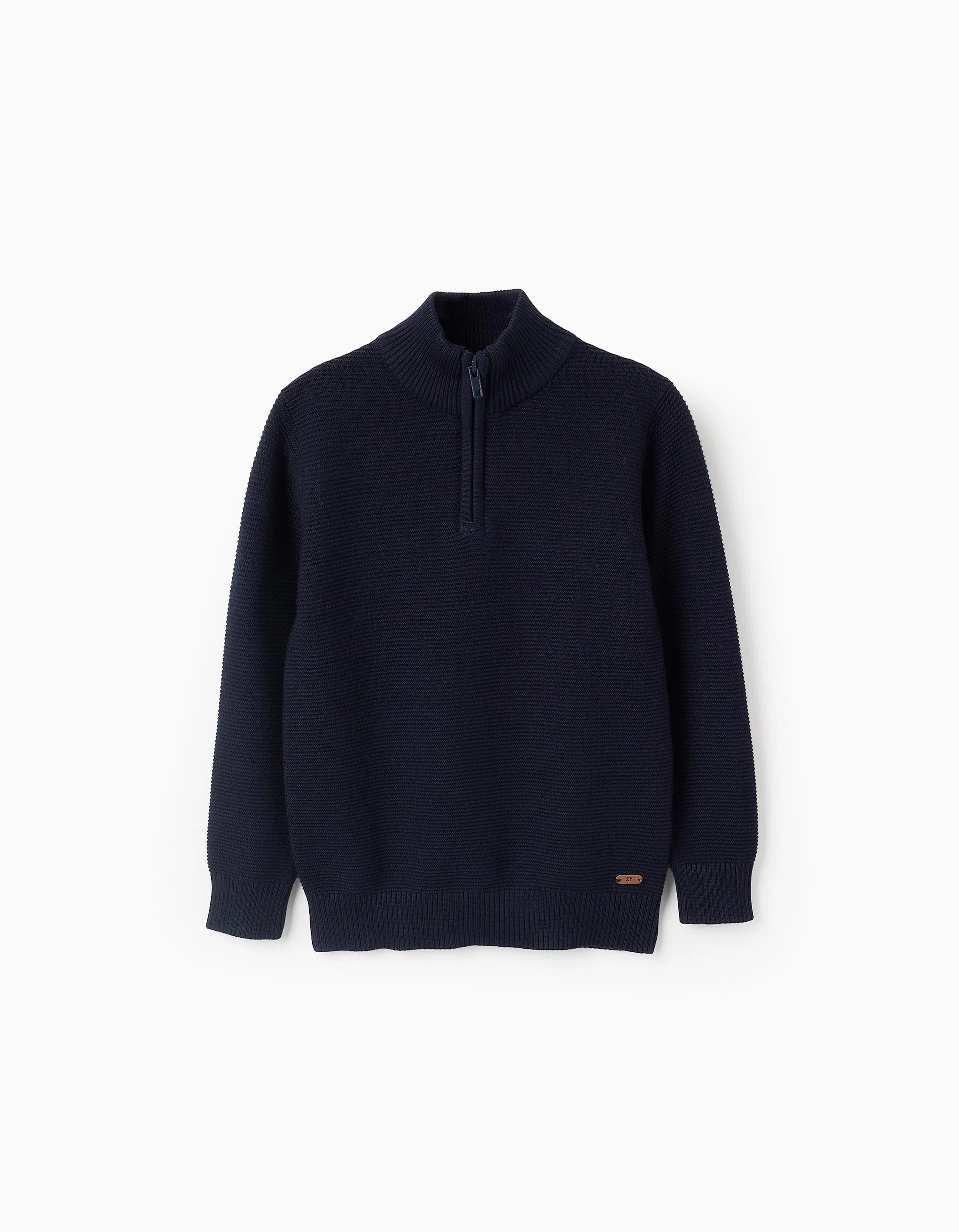 Jersey de punto azul marino para niño, con textura de 100% algodón. Cuello alto y acanalado, con cierre de cremallera. Extremos acanalados para un ajuste perfecto.