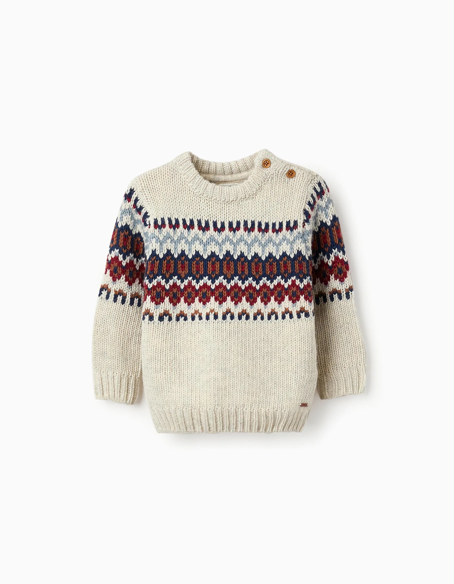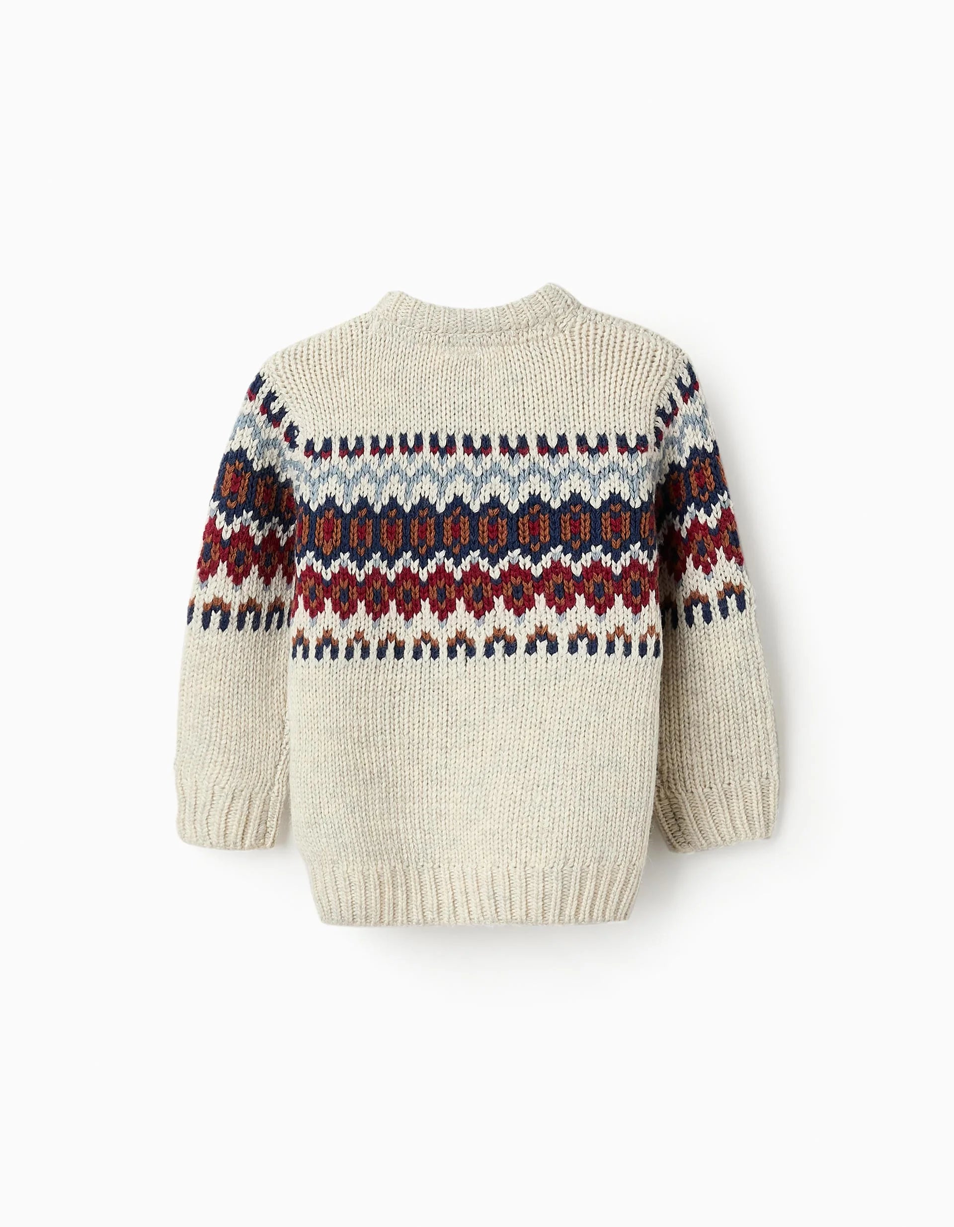 Jersey de punto grueso beige para bebé niño, con jacquard multicolor en tonos de azul, marrón y rojo. Cuello redondo y botones en el hombro para vestir con facilidad. Puños acanalados para un ajuste perfecto. Etiqueta decorativa en la base. Un jersey clásico y acogedor, perfecto para cualquier ocasión.