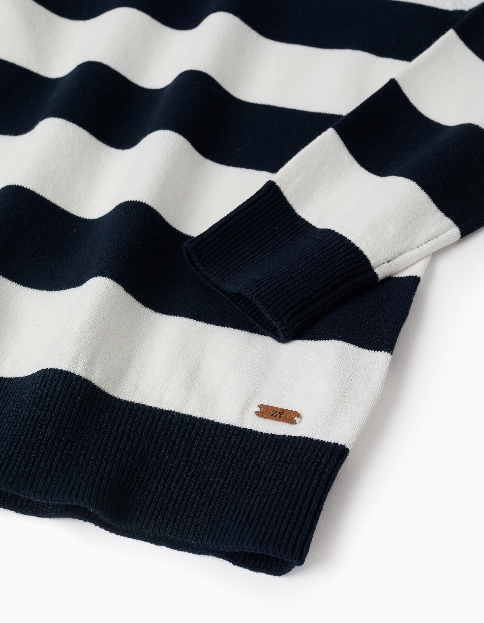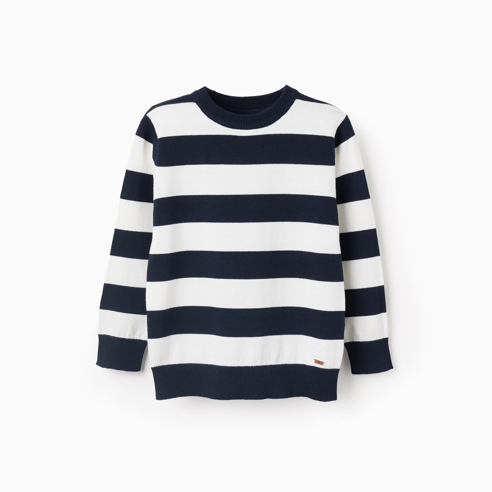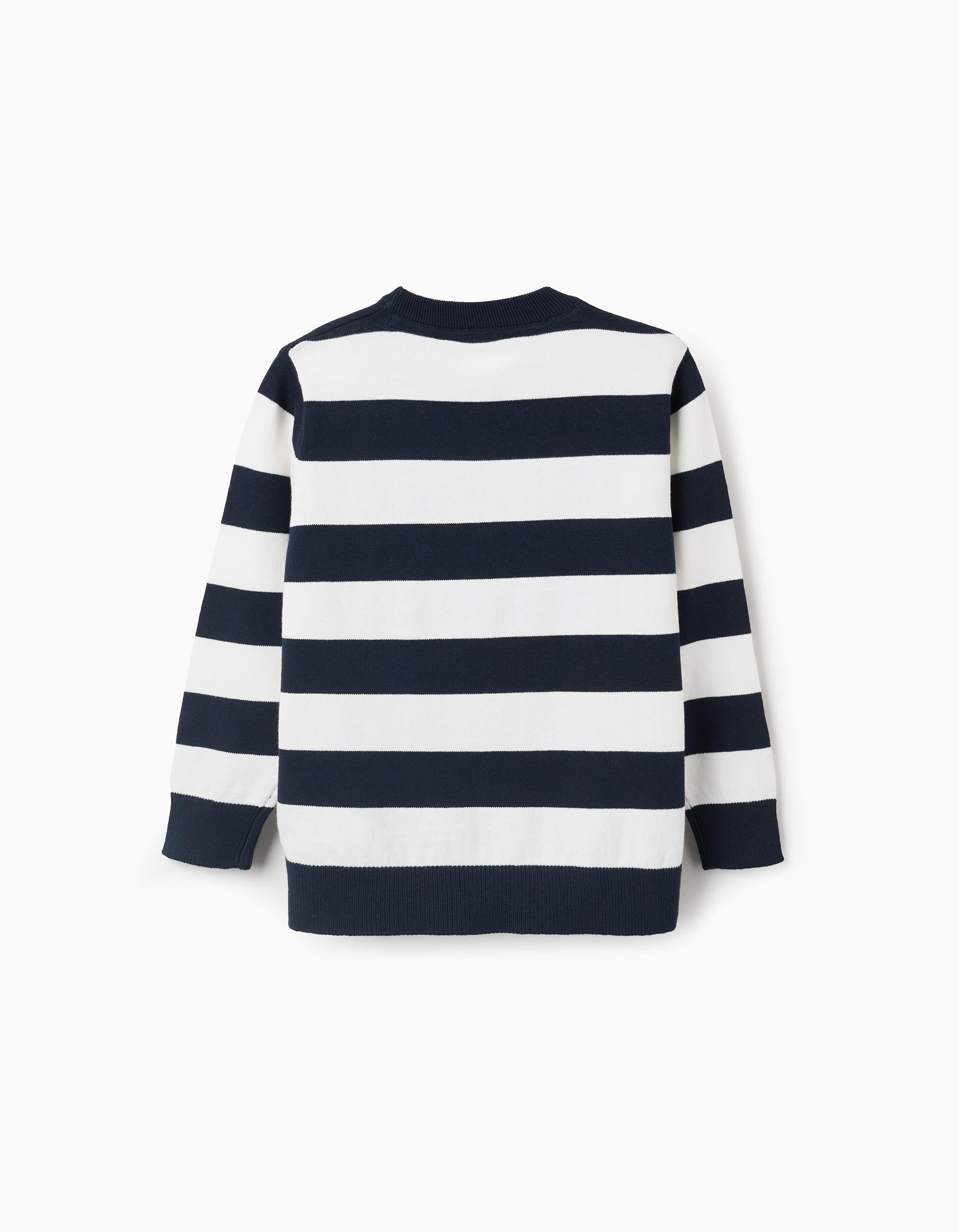 Jersey de punto fino para niño, fabricado en mezcla de algodón. Patrón a rayas en tonos blanco y azul oscuro. Extremos acanalados para un ajuste perfecto. ¡Una opción versátil y atemporal!