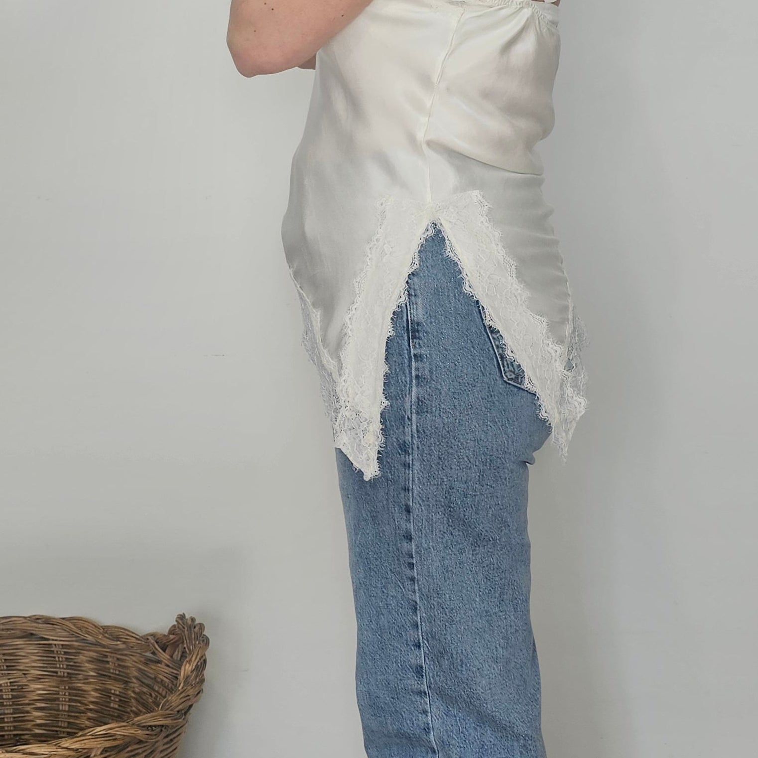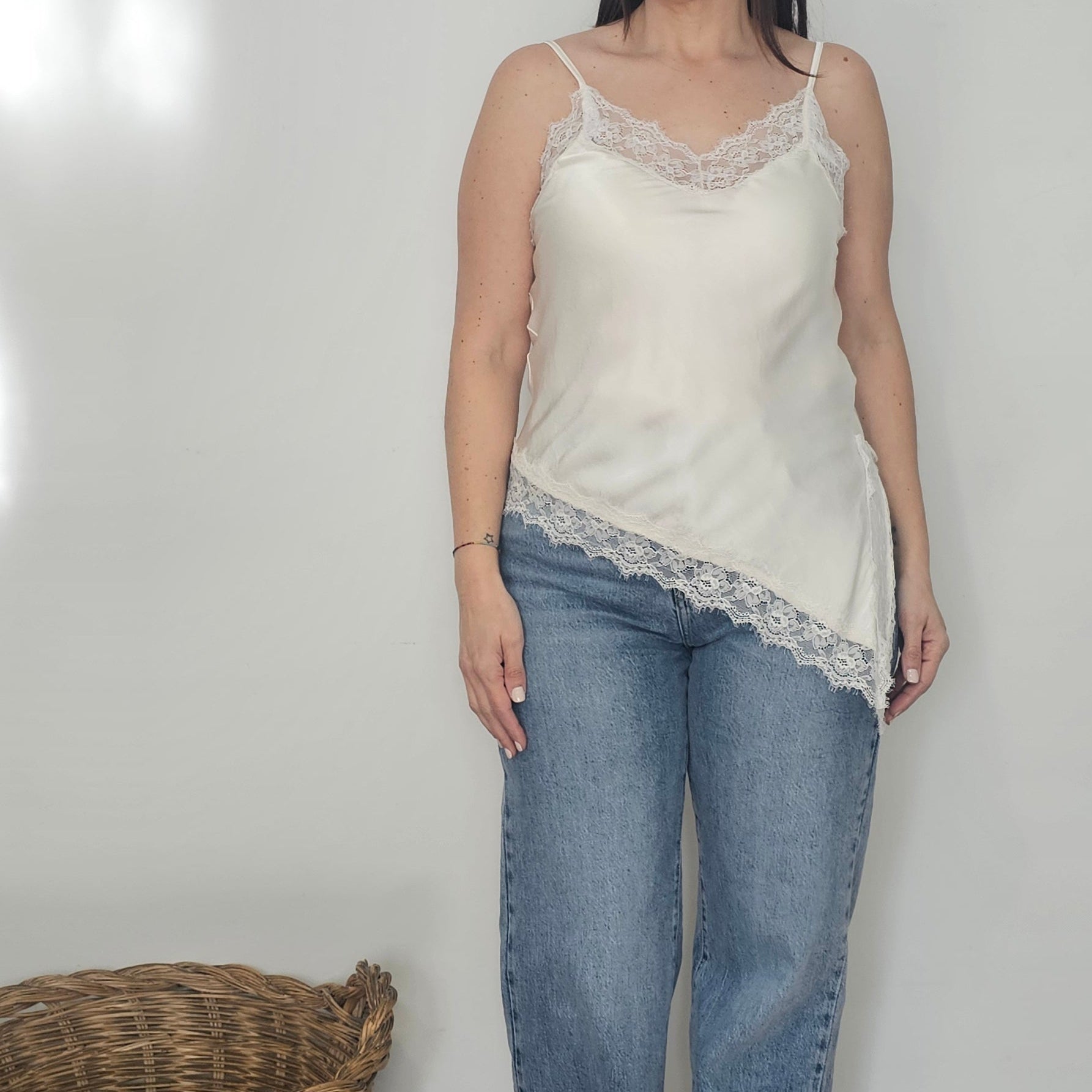 Talla única que abarca desde XS hasta M. Confeccionado en un tejido de calidad superior y caída impecable. Perfecto para combinar con un jersey corto que deje visible el delicado encaje y el diseño asimétrico con corte en pico en un solo lateral.