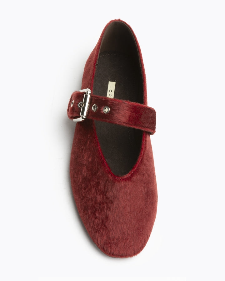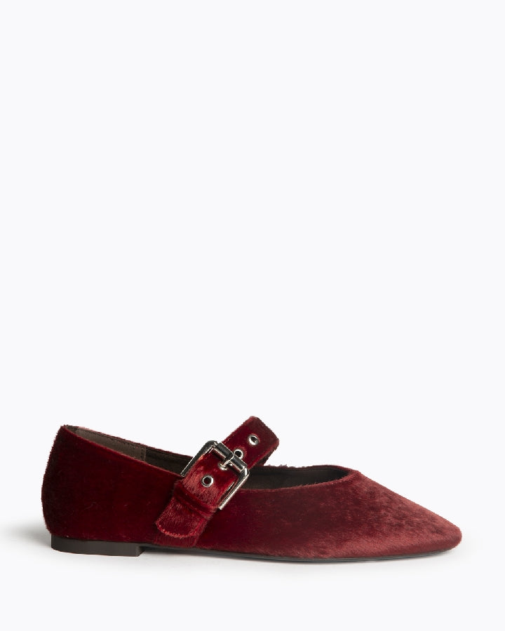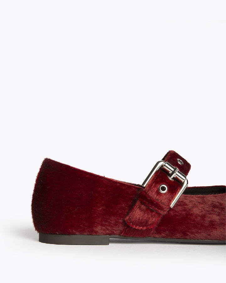 Bailarina plana tipo Mary Jane. Cierre mediante hebilla en lateral del empeine. Acabado en punta redonda. Corte de pelo.