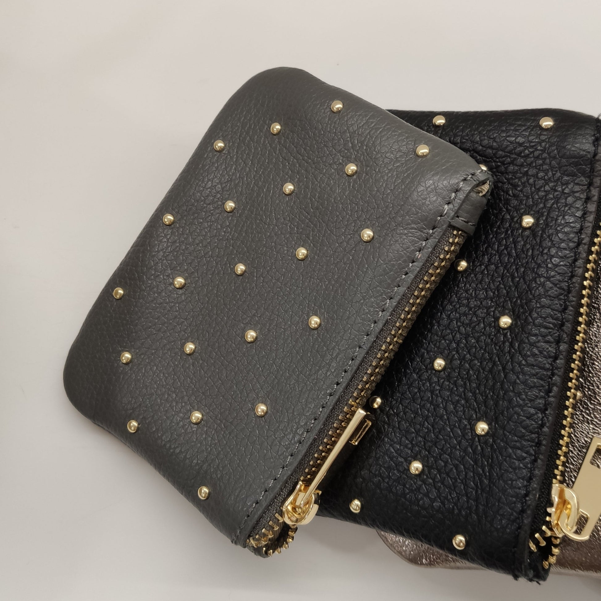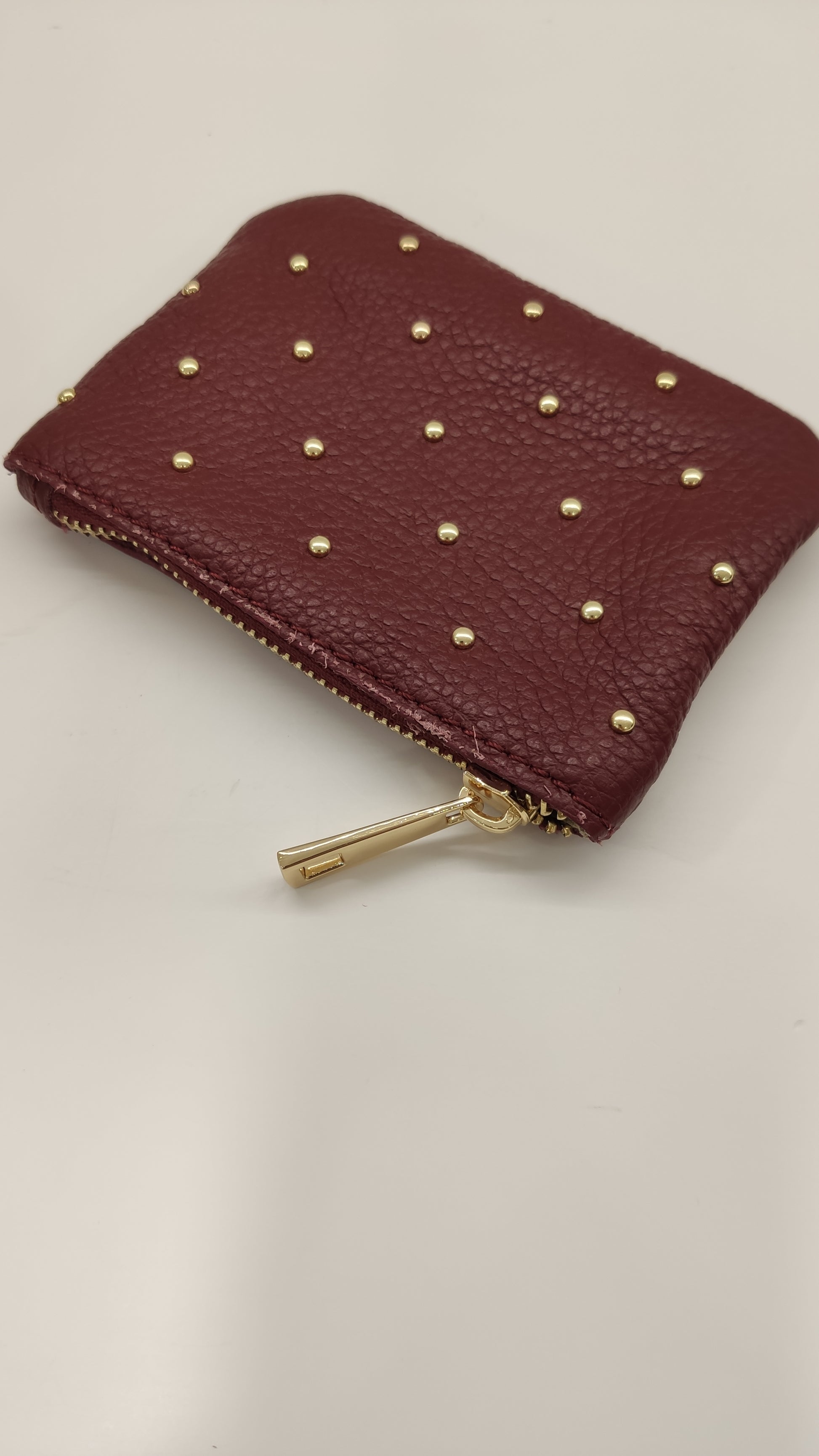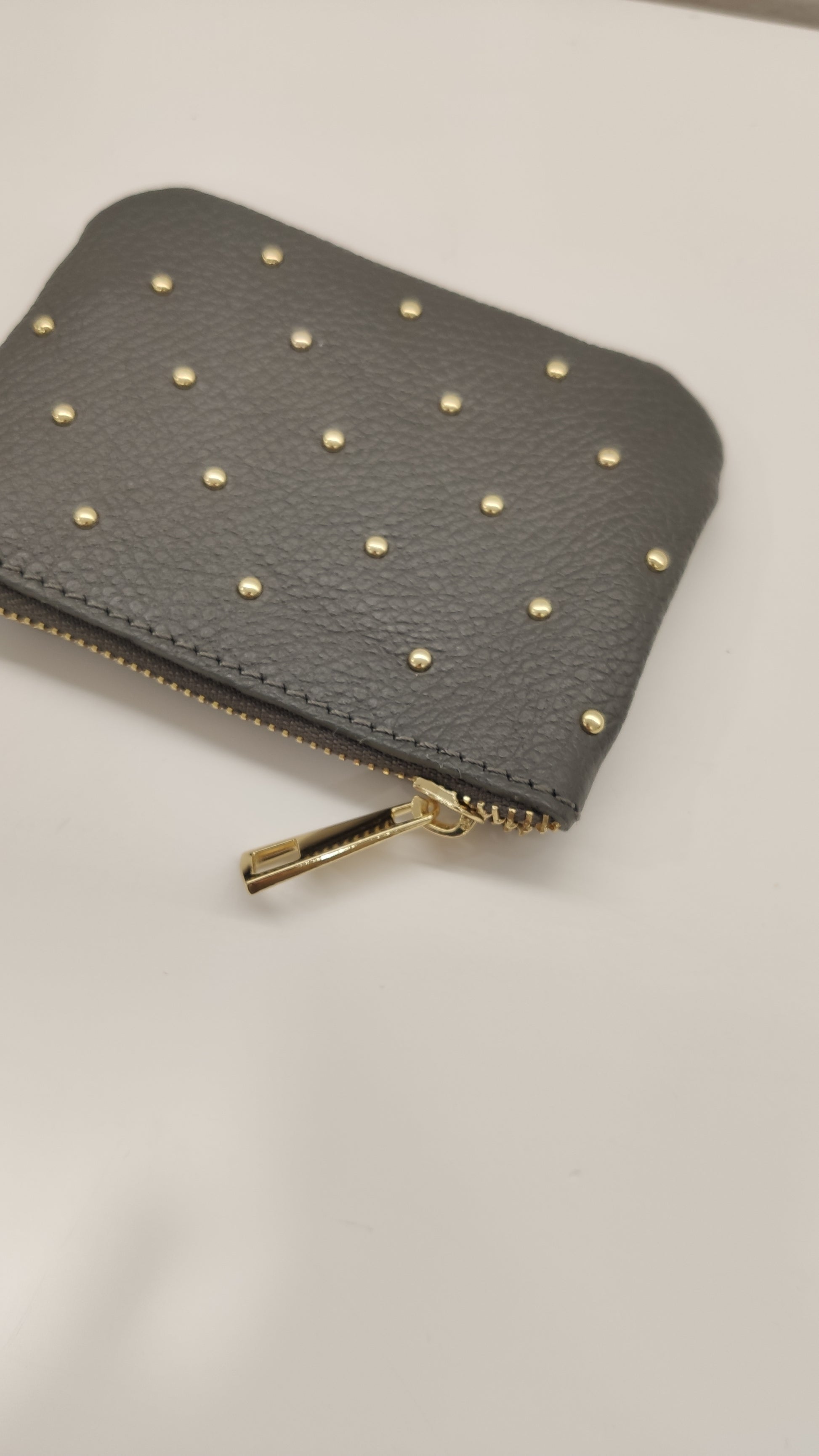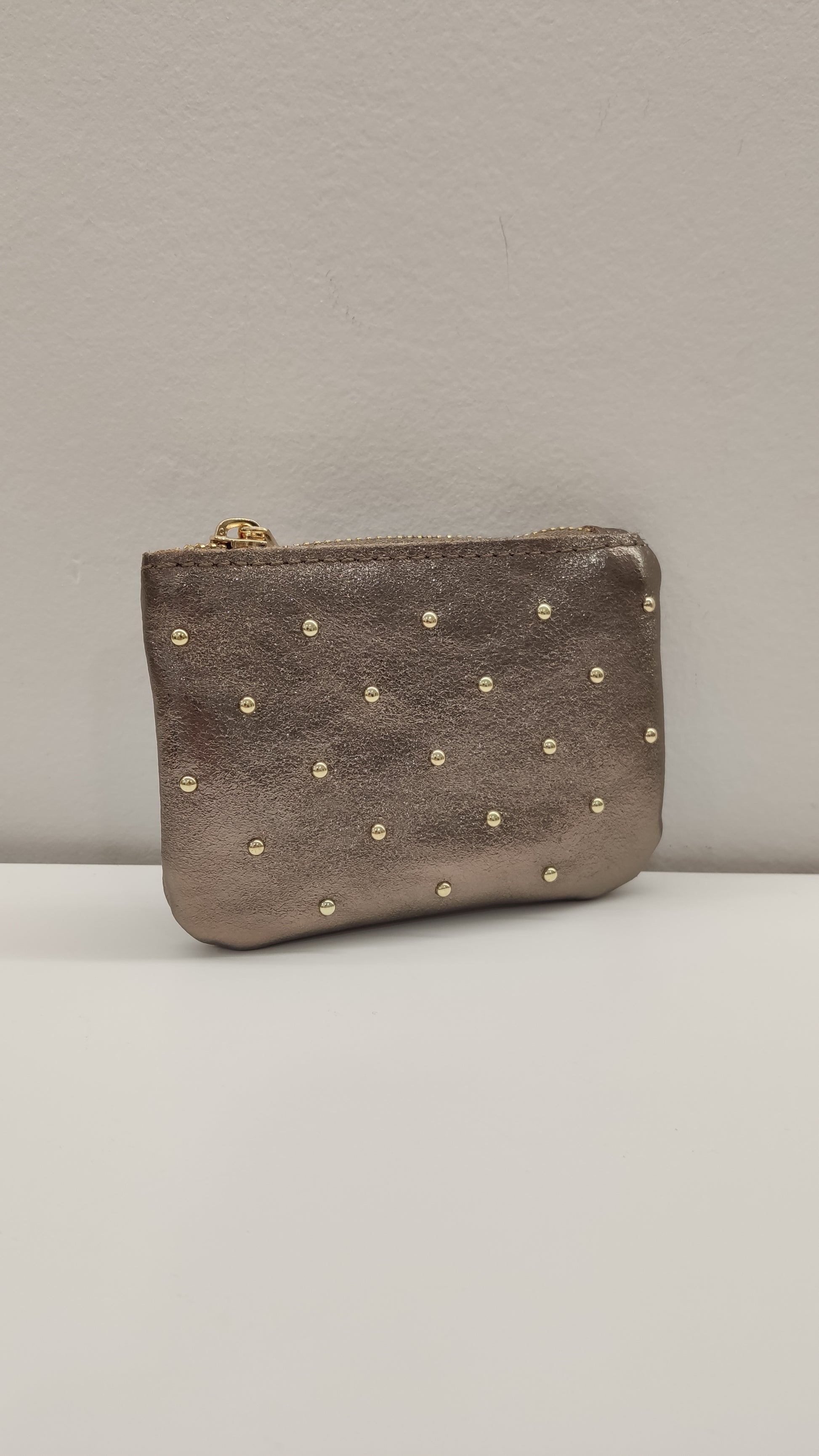 Guarda tus monedas con estilo en este monedero de piel auténtica. Diseño compacto de 14 x 9,5 cm con cierre de cremallera seguro y detalles de tachuelas doradas que le dan un toque rockero. Disponible en tonos lisos y acabados metalizados para que elijas el que mejor refleje tu personalidad.