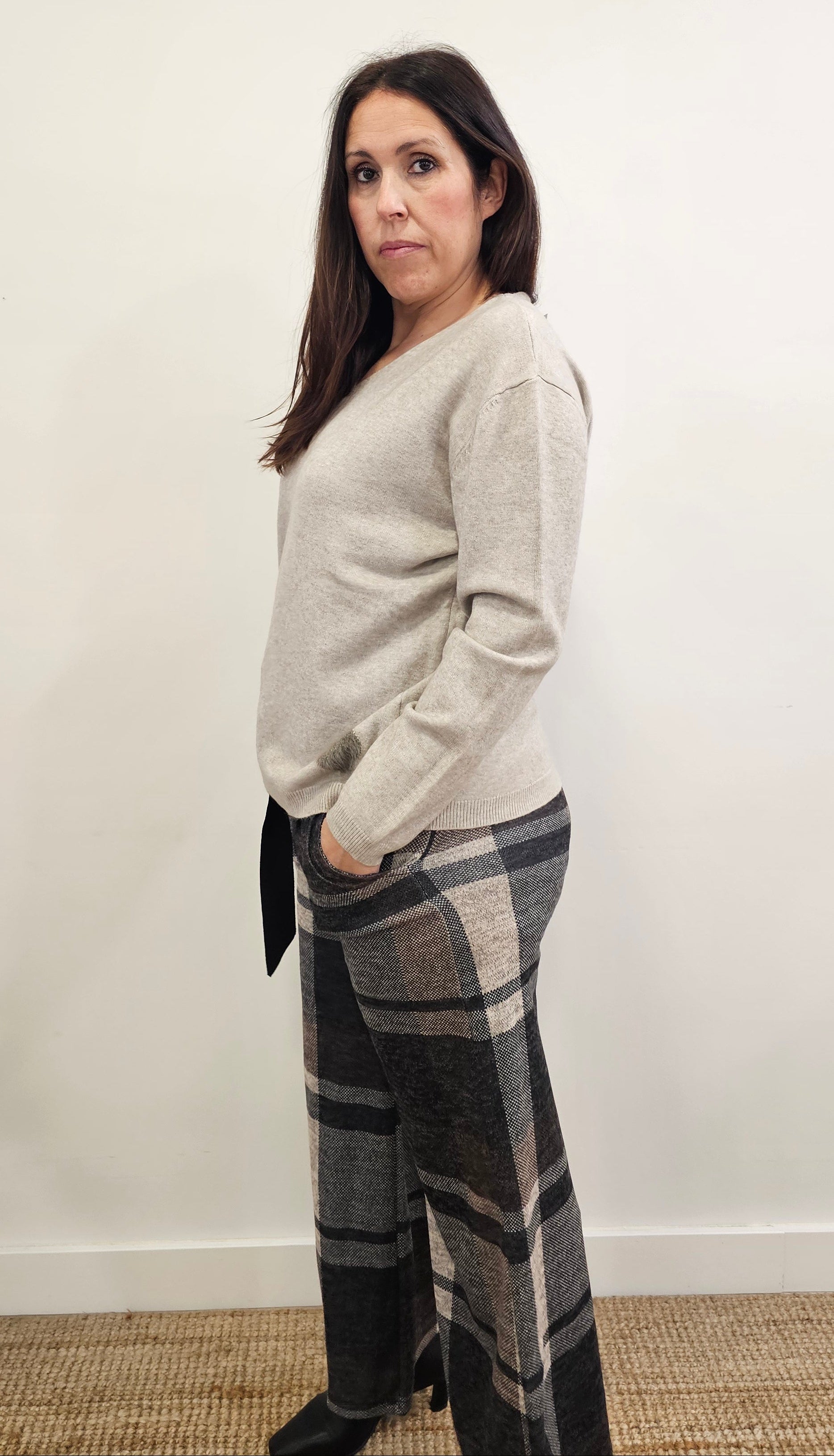 Descubre nuestro pantalón de tejido gordito con ese toque desenfadado que buscabas. Equipado con prácticos bolsillos laterales, lazo de raso negro para jugar con el estilo como cinturón, trabillas y goma elástica trasera que se adapta a ti. Talla única pensada para XS, S y M. Comodidad y versatilidad en un solo diseño.