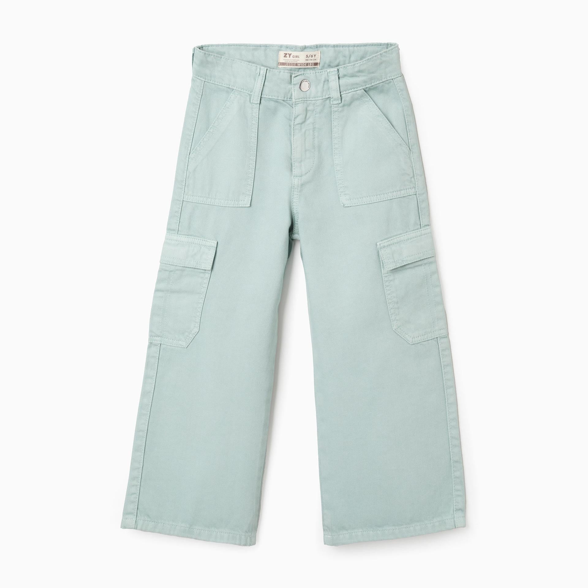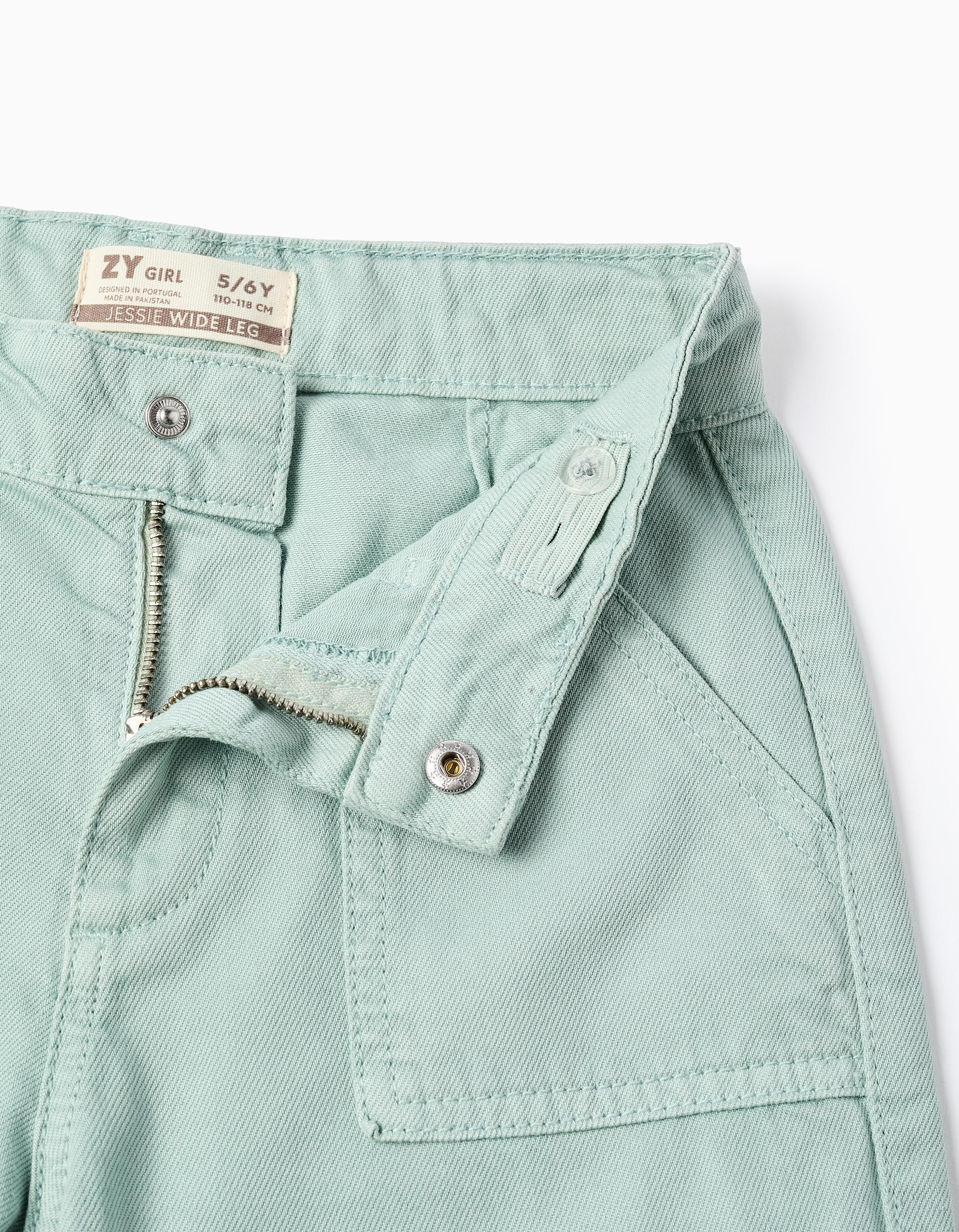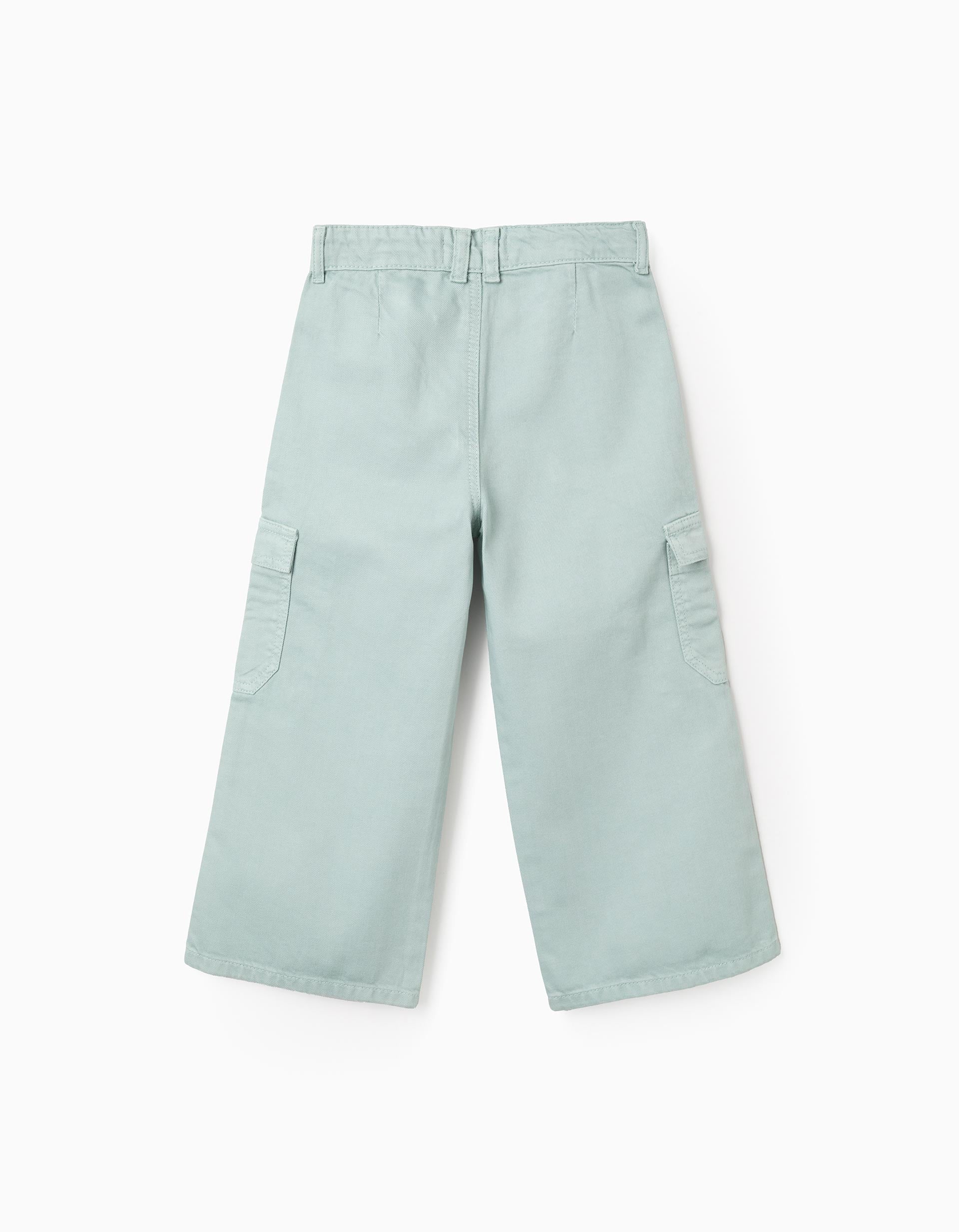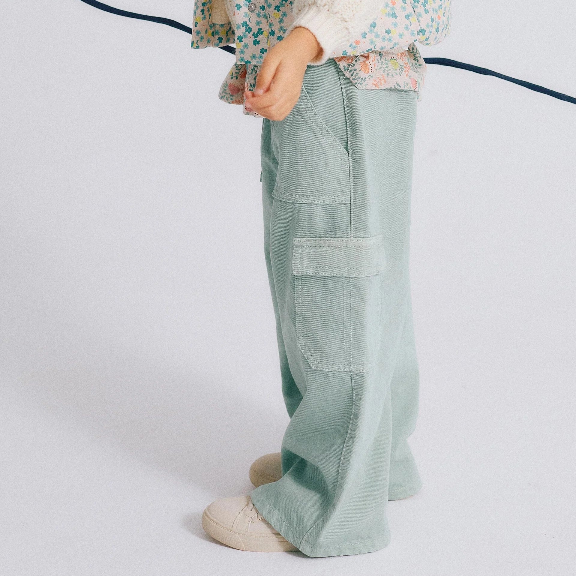 Pantalón de niña de sarga verde agua, 100 % algodón, pernera ancha. Bolsillos cargo con solapa. Cintura interior ajustable con elástico y botones. Una opción colorida y moderna. Big Me: se abrocha con un botón a presión bajo un botón decorativo hasta la talla 8/9, para facilitar el vestido y favorecer la autonomía de tu hija.