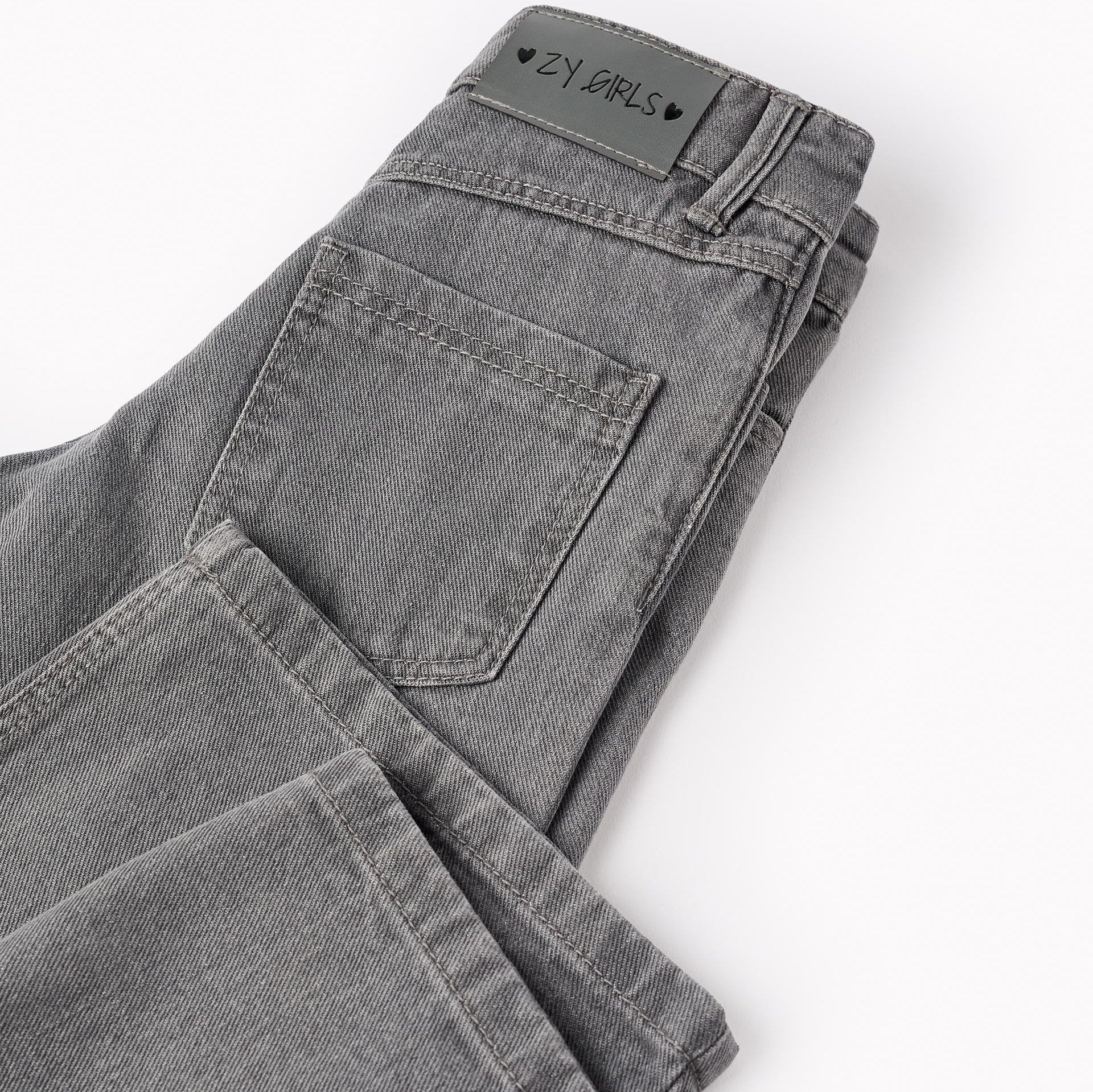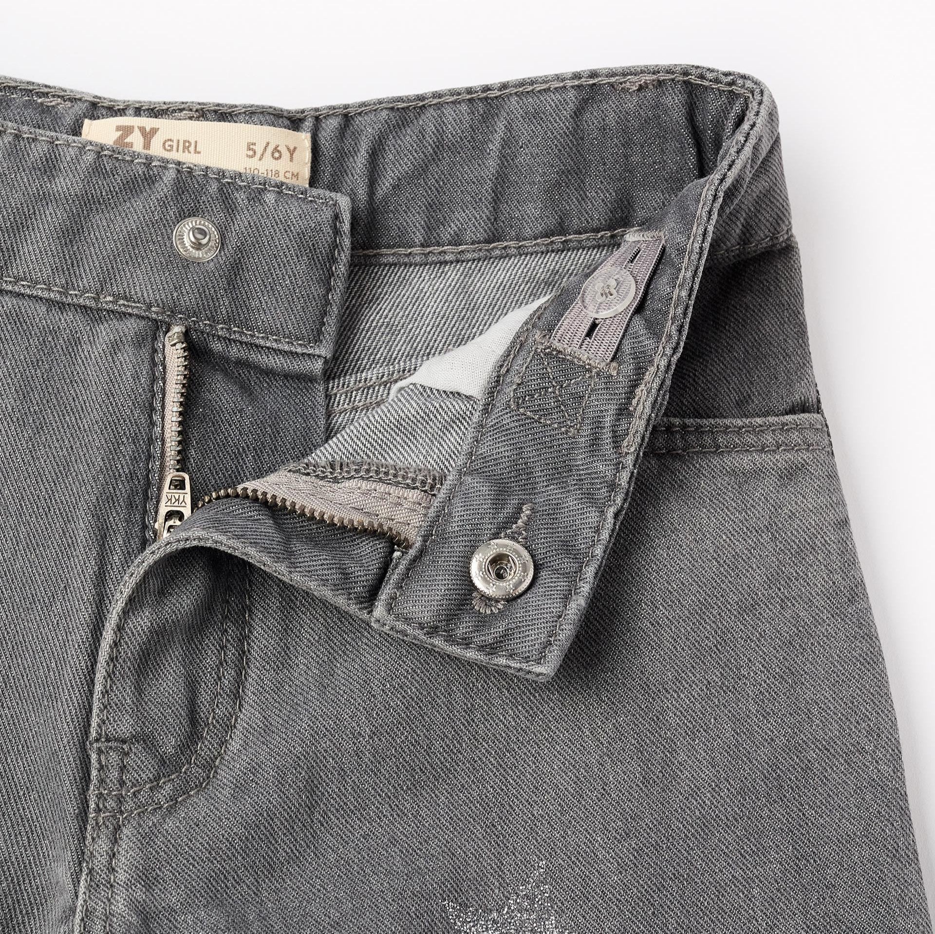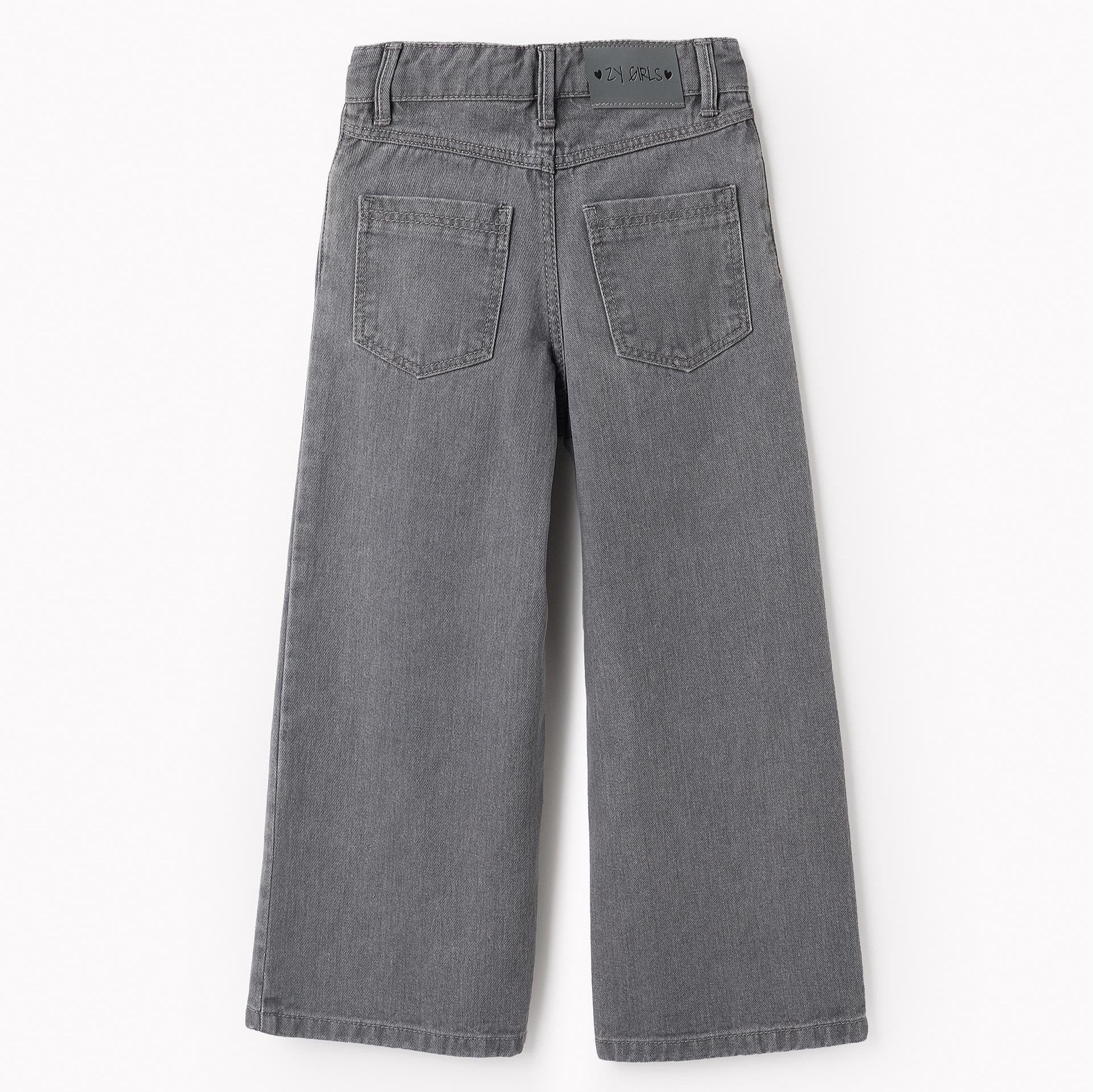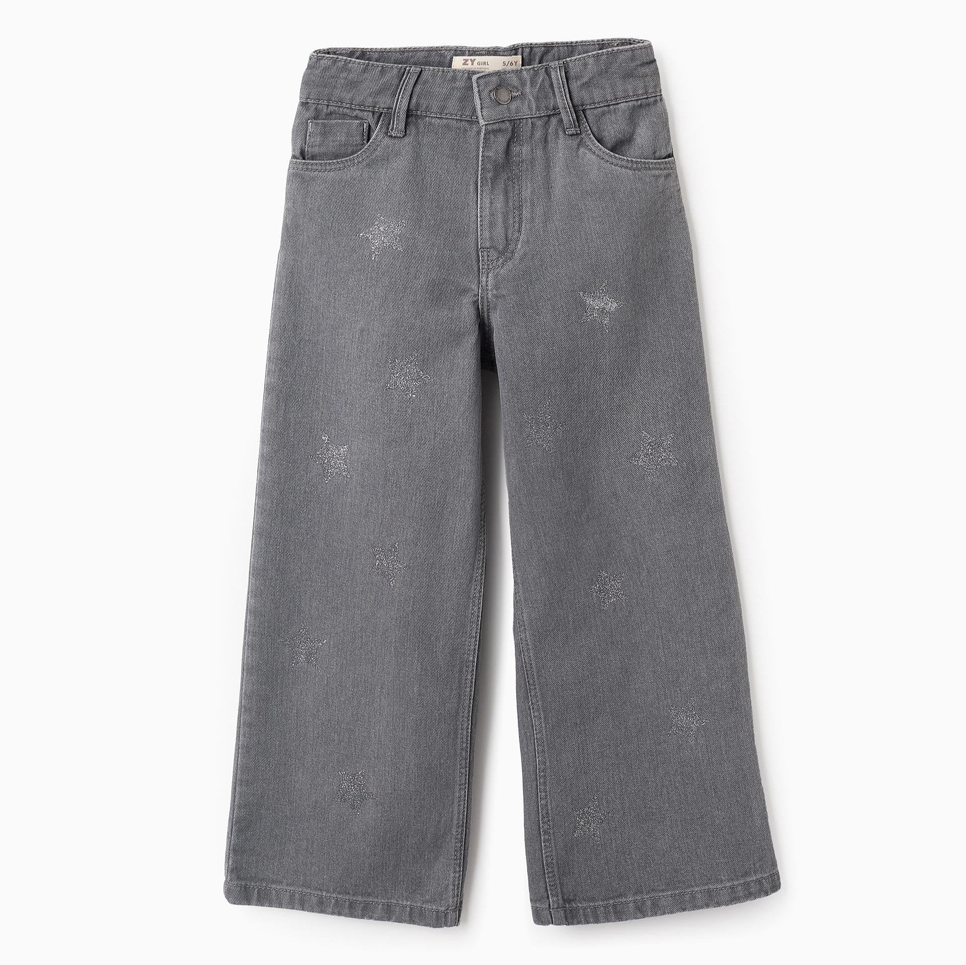 Pantalón vaquero gris para niña, 100% algodón, modelo wide leg. Con estrellas de purpurina. Cinco bolsillos. Cintura ajustable en el interior con elásticos y botones. Big Me: se abrocha con automático bajo botón decorativo hasta la talla 8/9, para facilitar el vestir y promover la autonomía de su niña.