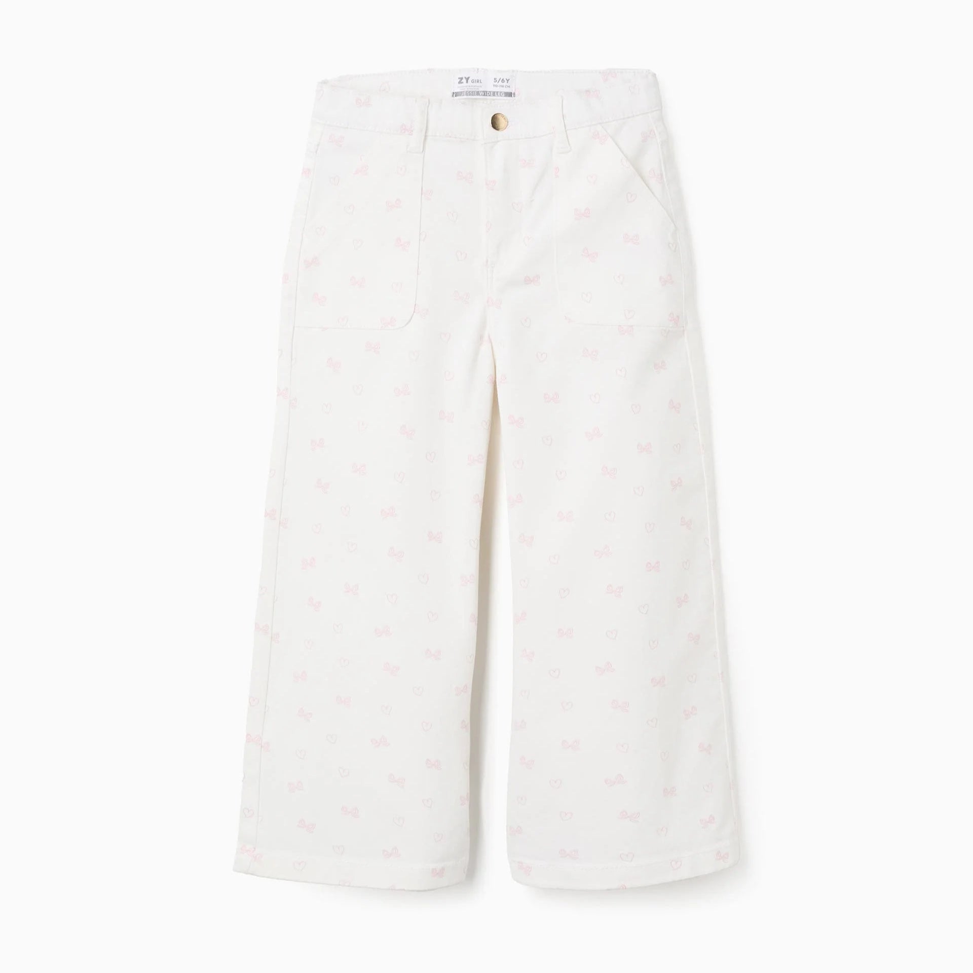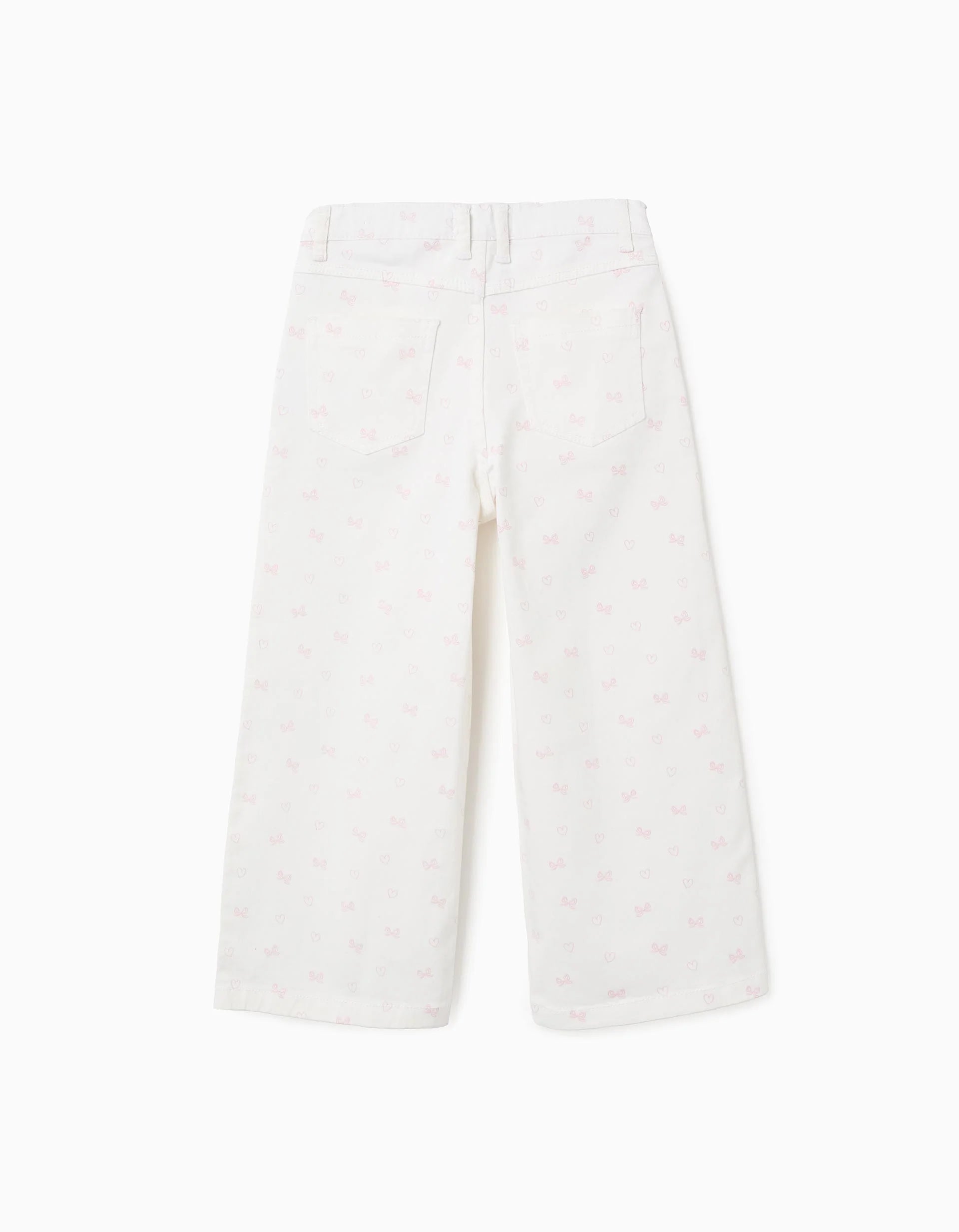 Pantalón blanco de sarga con motivo de lazos y corazones rosa para niña. Fabricado en sarga de algodón con un toque de elasticidad para mayor comodidad y libertad de movimiento. Modelo wide leg. Cintura ajustable en el interior con elásticos y botones. ¡Para looks relajados, femeninos y siempre a la moda! Big Me: se abrocha con automático bajo botón decorativo hasta la talla 8/9, para facilitar el vestir y promover la autonomía de su niña.
