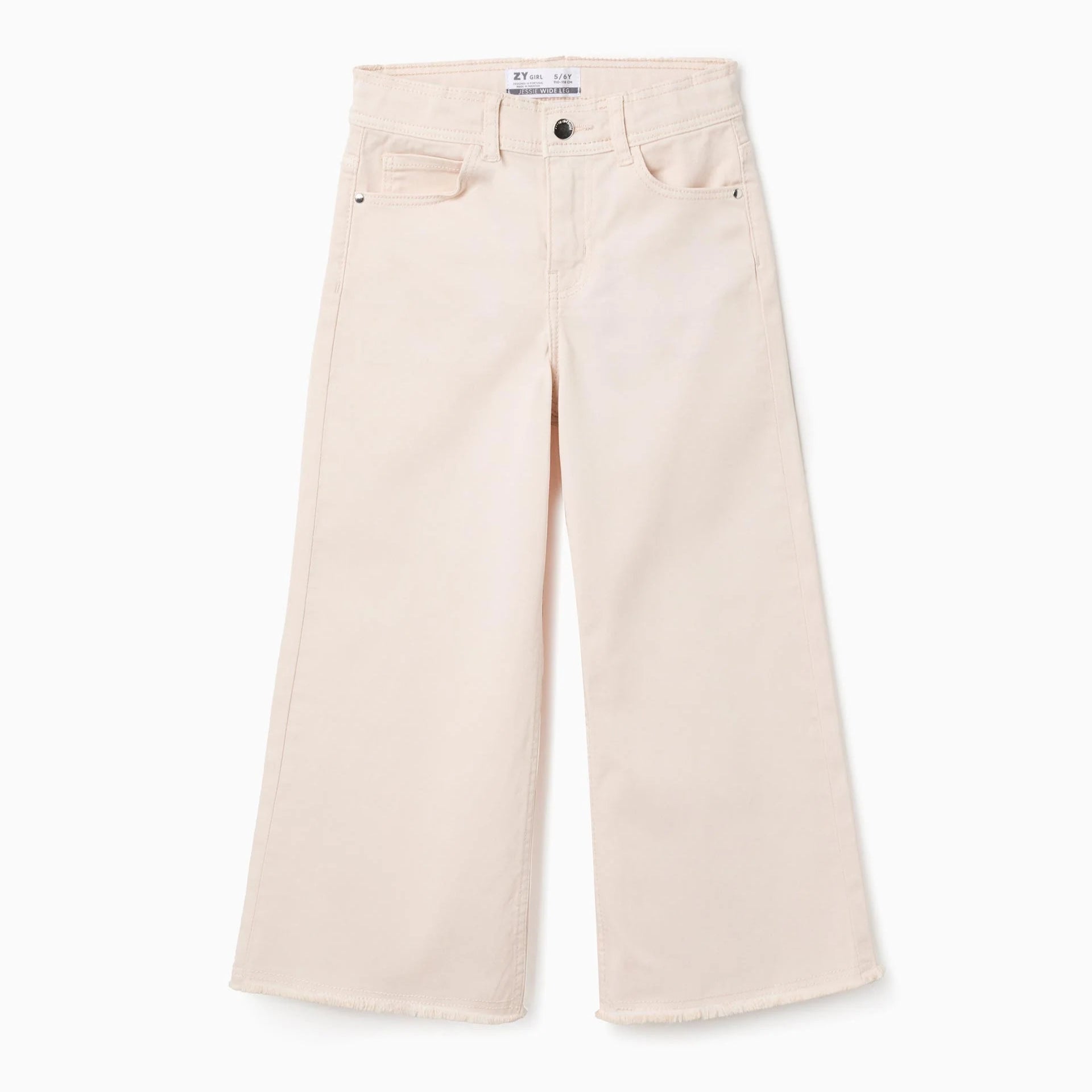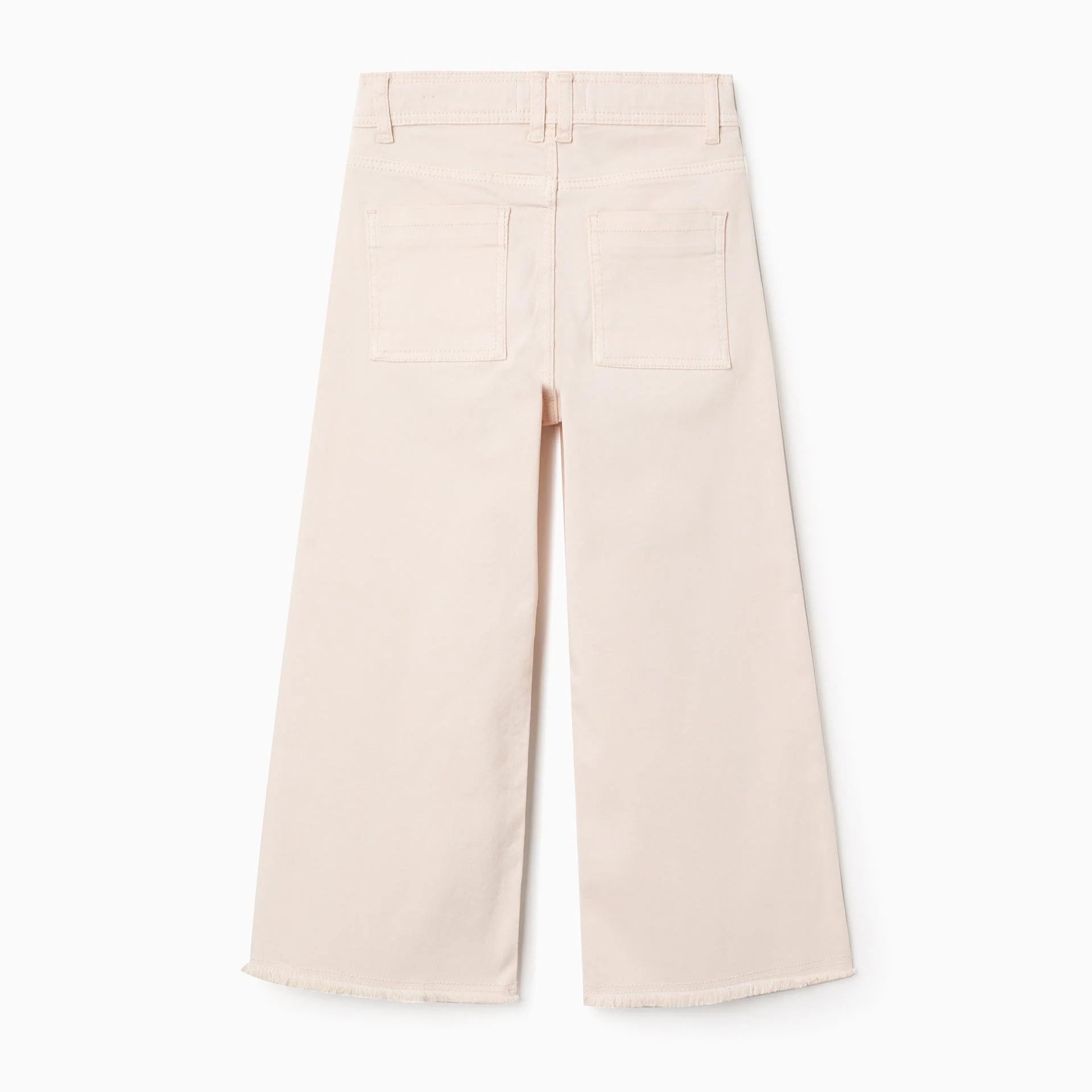 Pantalón de sarga beige para niña, modelo wide leg, anchos y relajados. Cinco bolsillos. Cintura ajustable en el interior con elásticos y botones. Dobladillos deshilachados. Prenda con tinte especial. ¡Para looks urbanos y casuales! Big Me: se cierra con automático bajo botón decorativo hasta la talla 8/9, para facilitar el vestir y promover la autonomía de su niña.