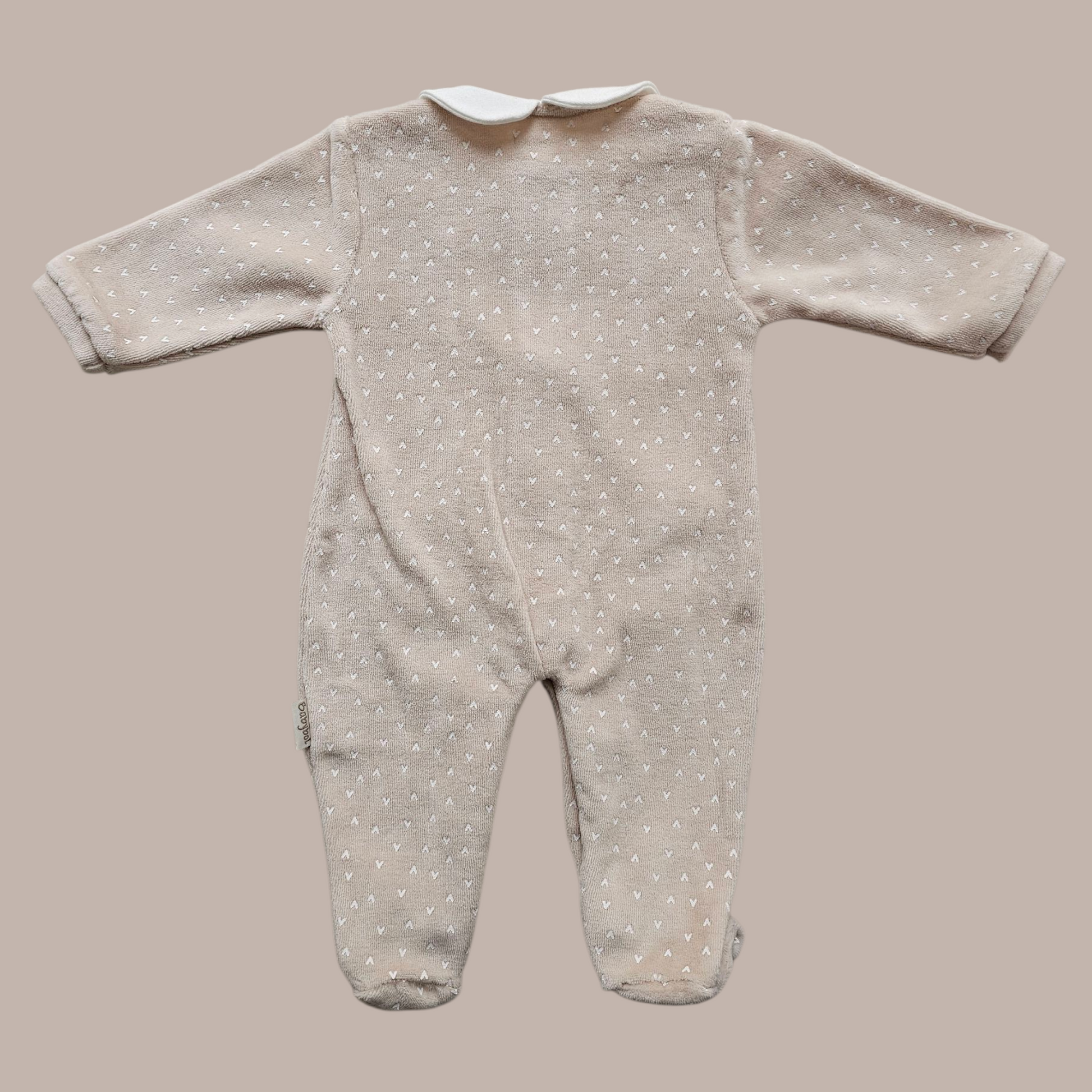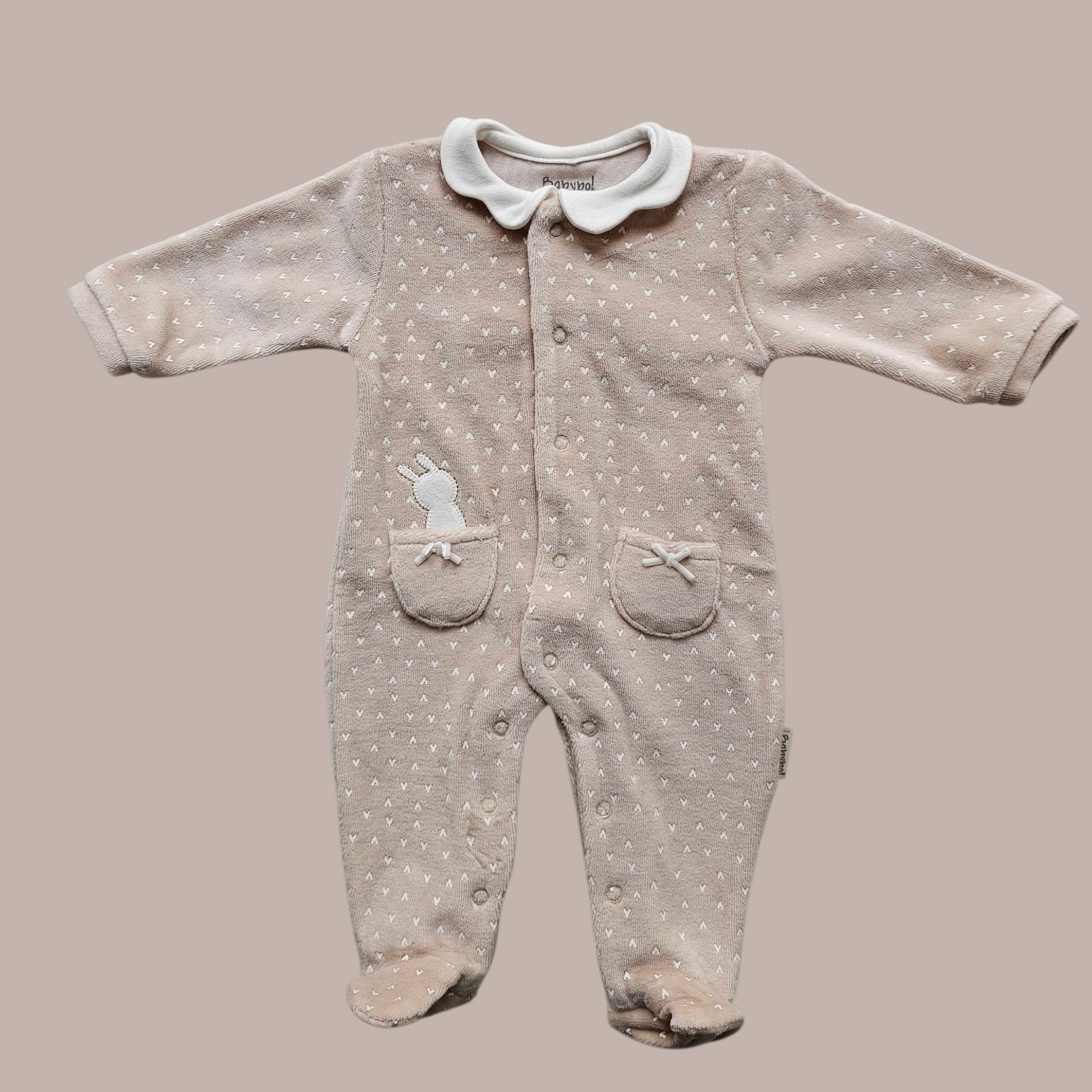 Este pelele camel afelpado ofrece un cierre práctico con botones laterales y en la pierna para facilitar el cambio de pañal sin complicaciones. Su diseño incluye cuello bebé para mayor comodidad y suavidad en la delicada piel del bebé. Perfecto para mantener a tu pequeño cómodo y protegido durante todo el día.