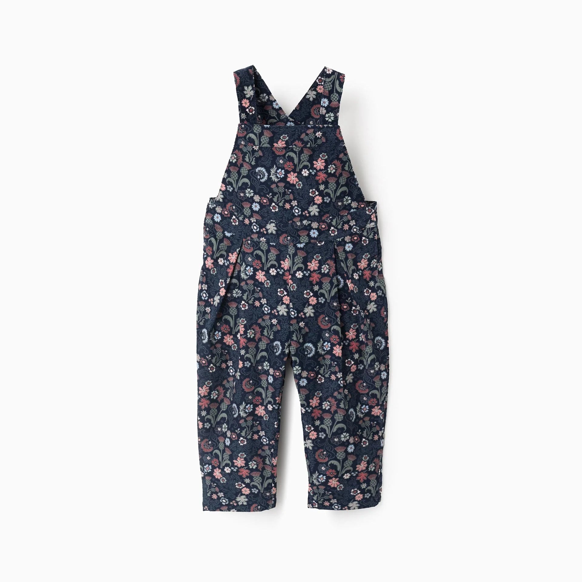 Peto azul oscuro de pana 100 % algodón, con motivo floral multicolor. Tirantes ajustables. Cintura con pinzas. Bolsillos en la parte posterior. Un patrón original, a juego con los tonos de invierno.