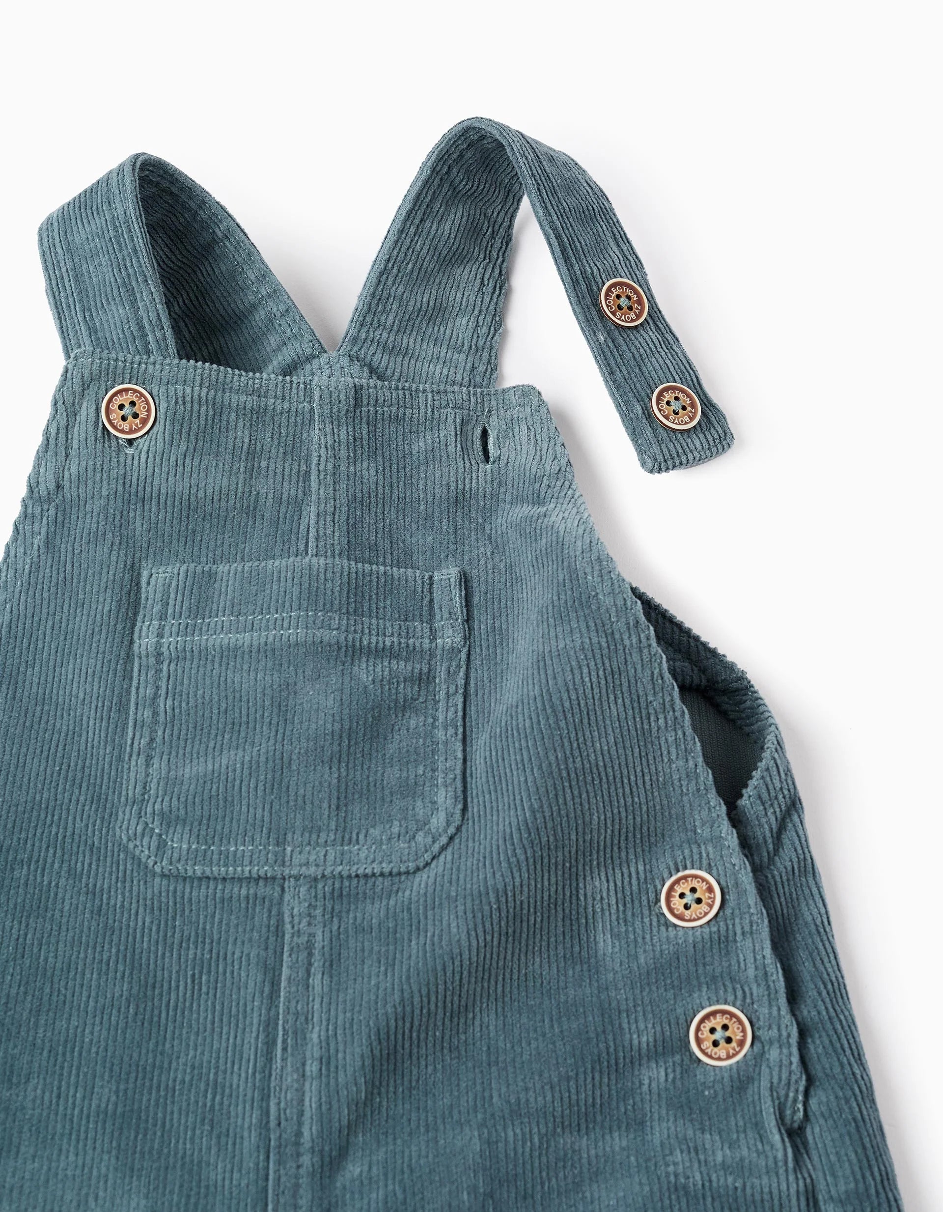 Peto vaquero azul para bebé niño, en algodón con un toque de elasticidad para mayor comodidad y libertad de movimiento. Tirantes ajustables. Bolsillo canguro y bolsillos traseros. Botones laterales para un ajuste perfecto. Automáticos en la entrepierna para facilitar el cambio del pañal. Para crear un look original y lleno de personalidad.