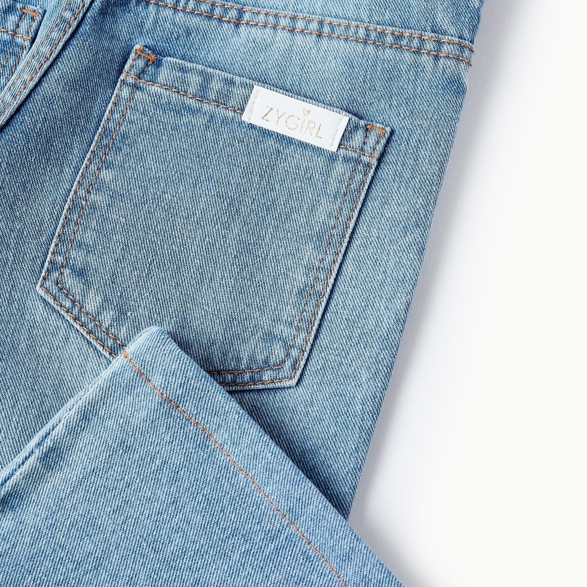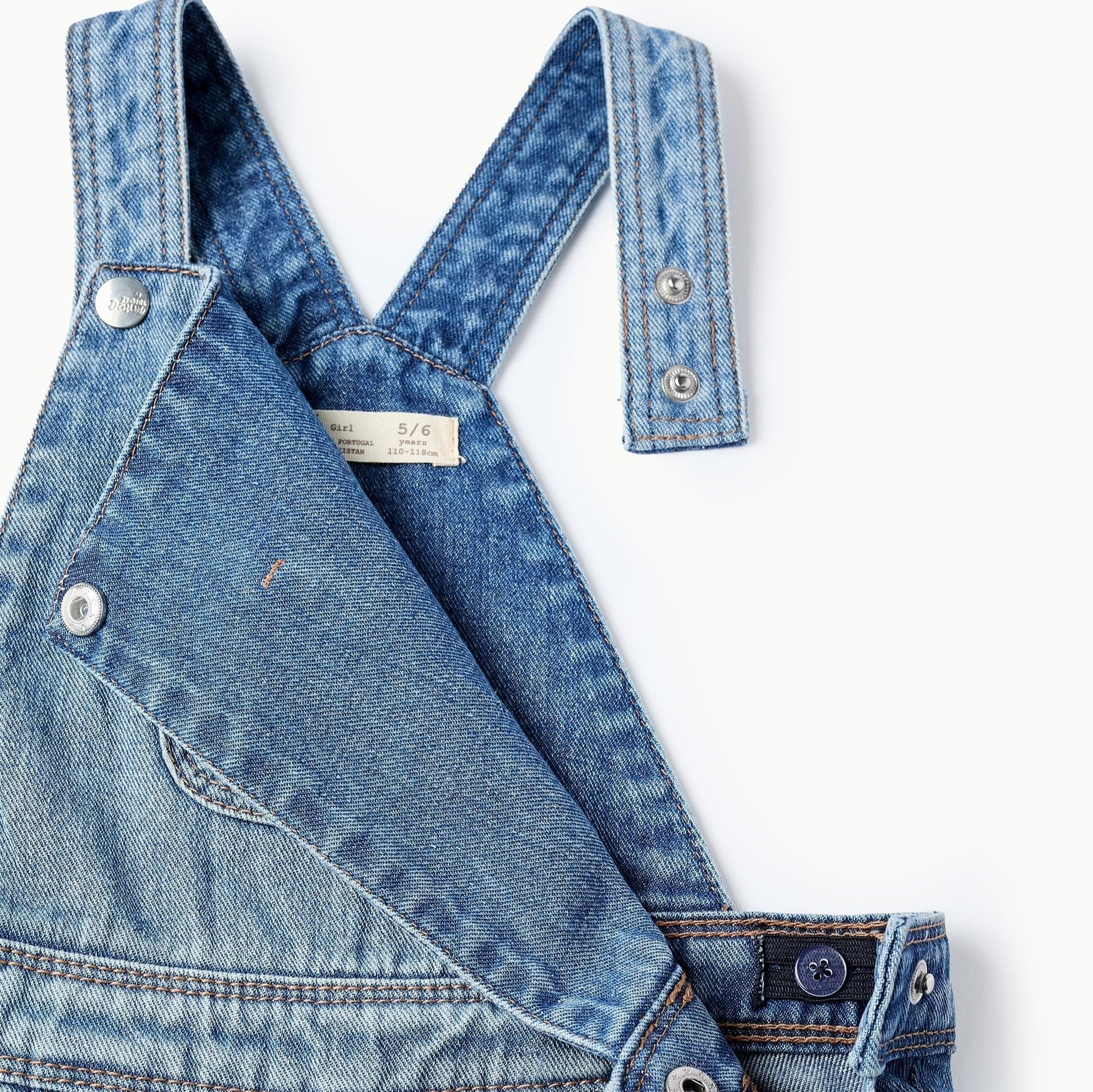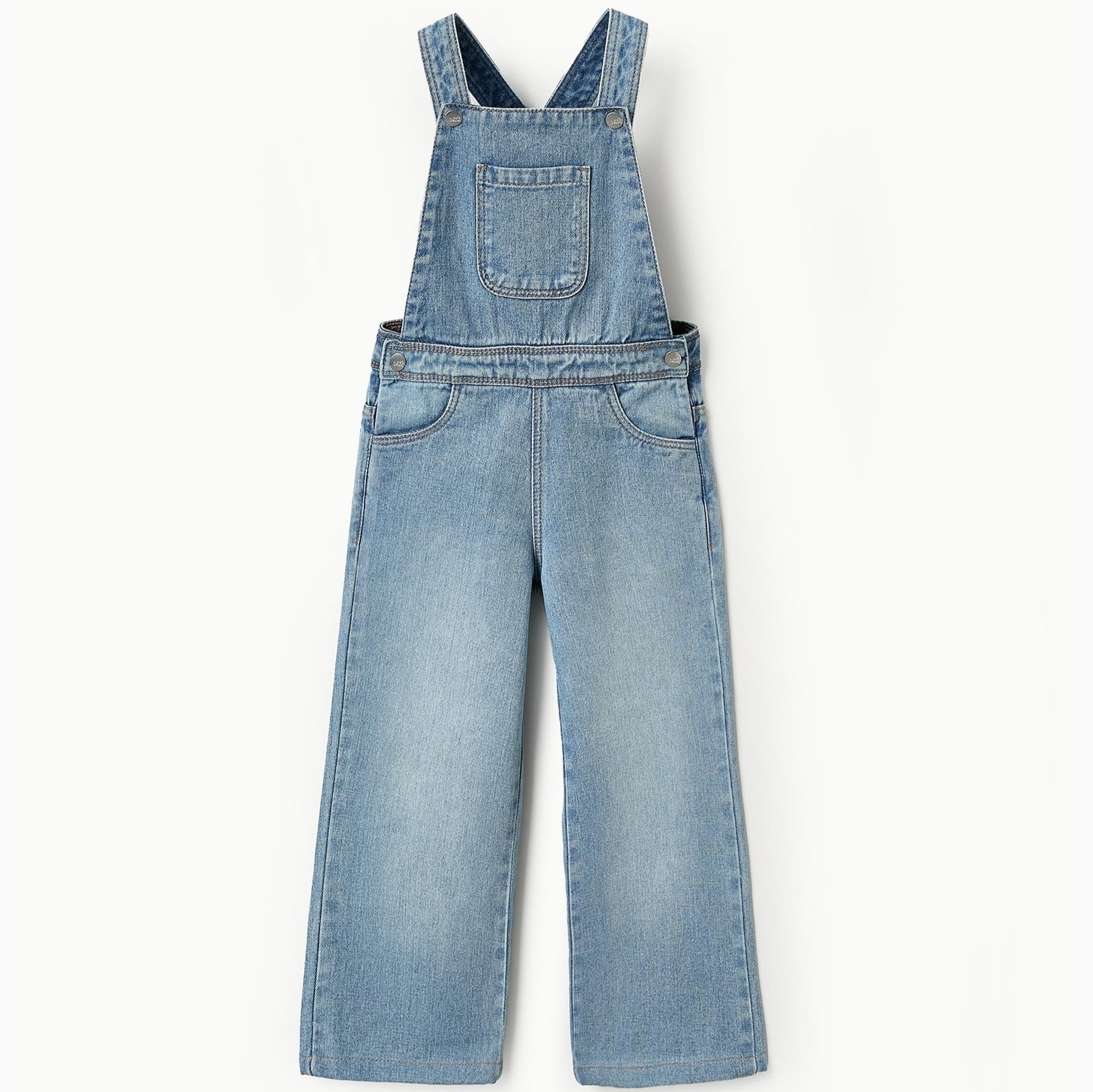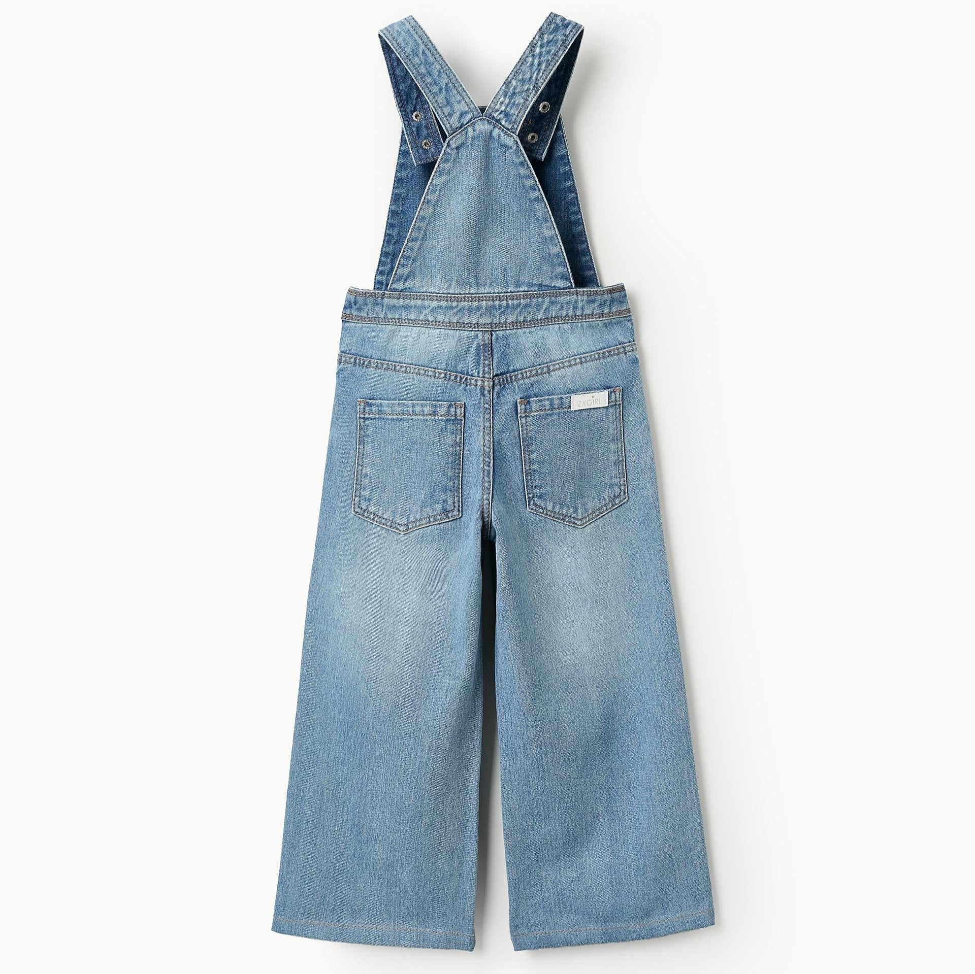 Peto vaquero azul para niña, fabricado en denim 100 % algodón. Tirantes ajustables. Automáticos en los laterales y cintura ajustable en el interior con elásticos y botones para un ajuste perfecto. Un bolsillo en el pecho y cuatro bolsillos en los pantalones. Modelo wide leg, para looks cómodos y llenos de estilo.